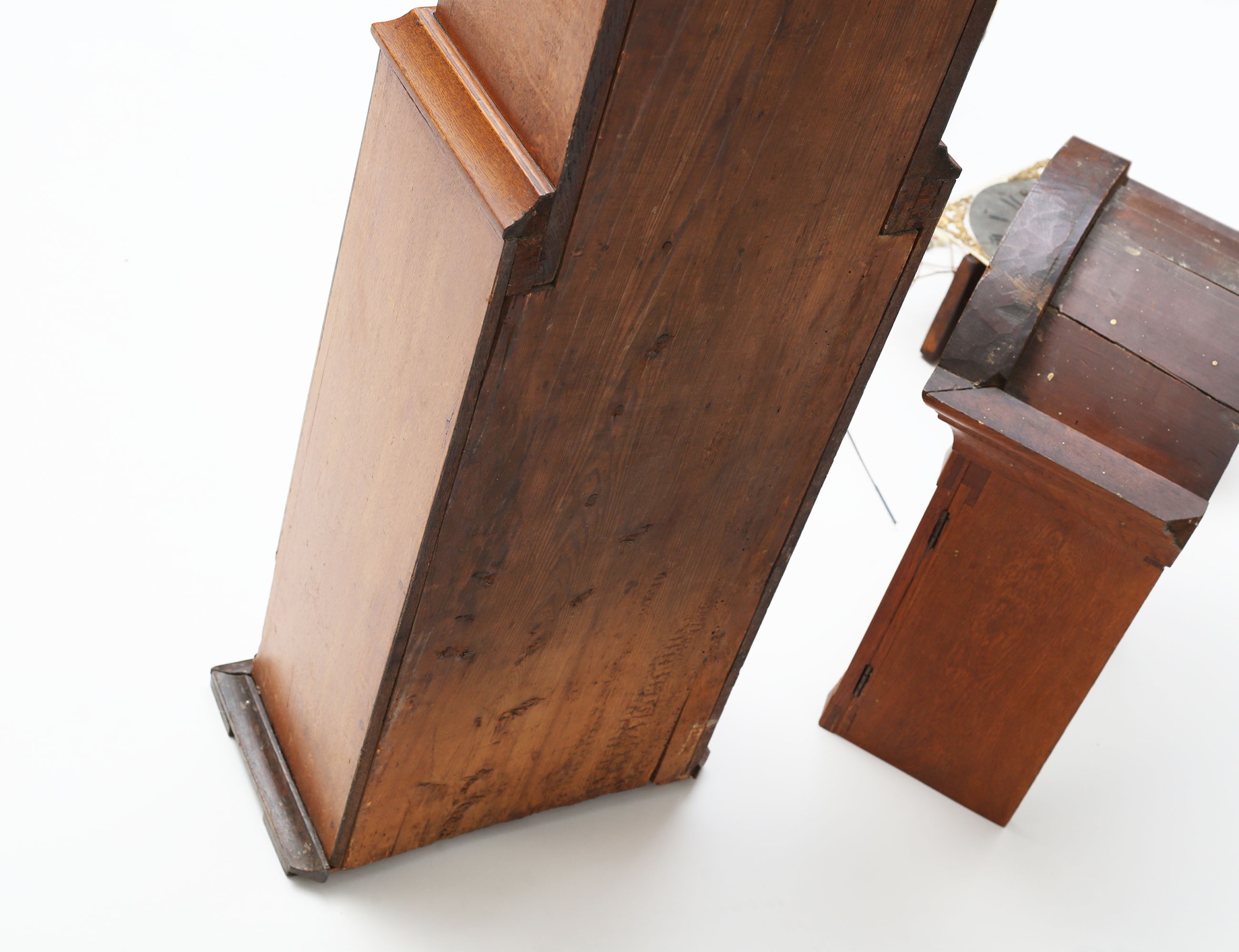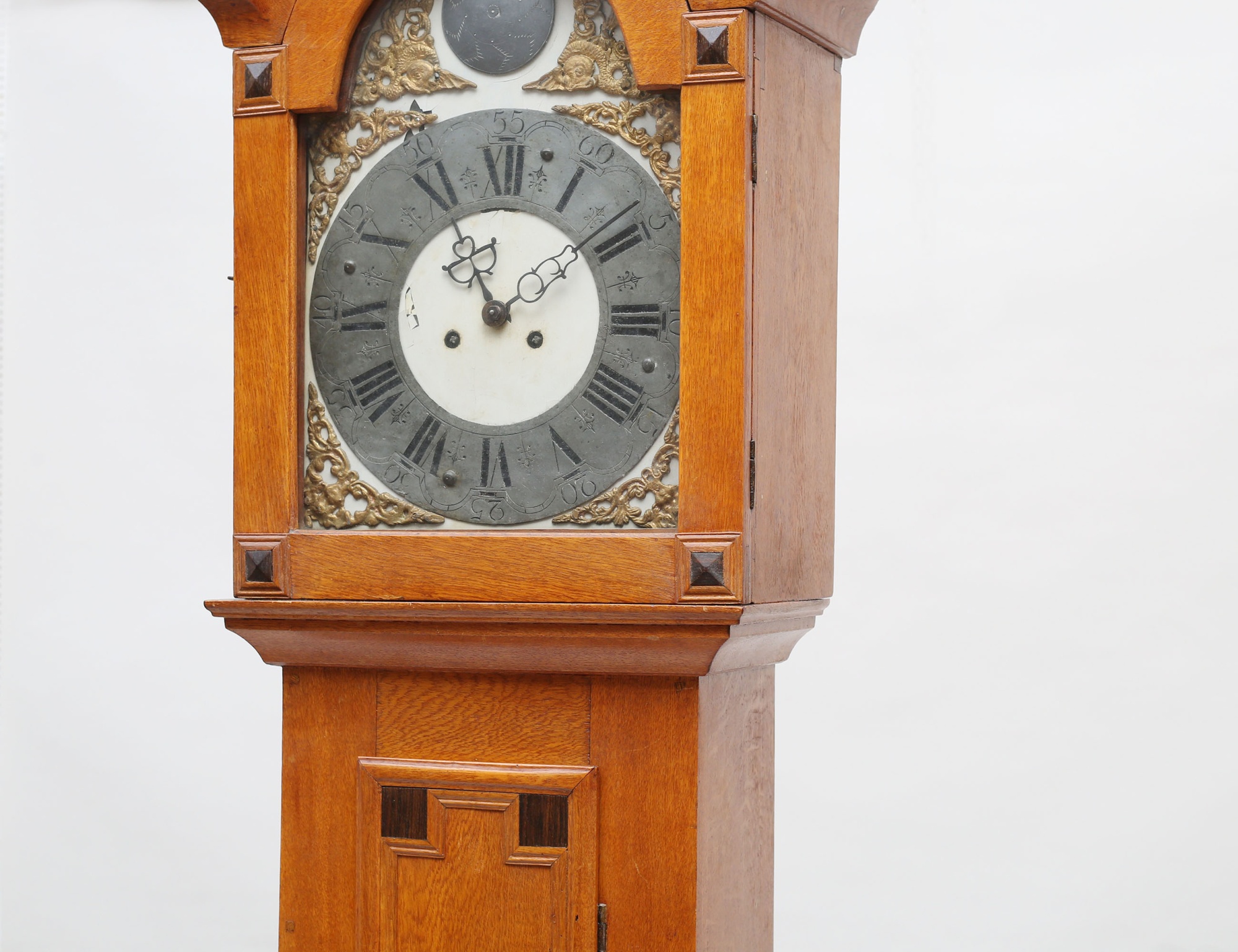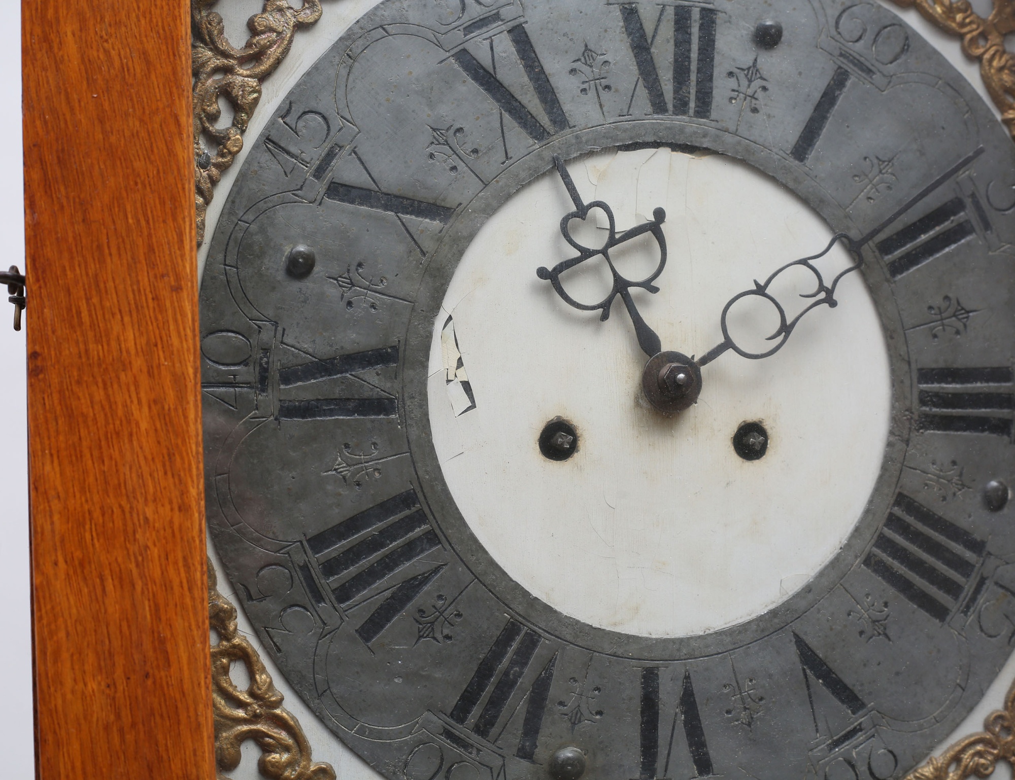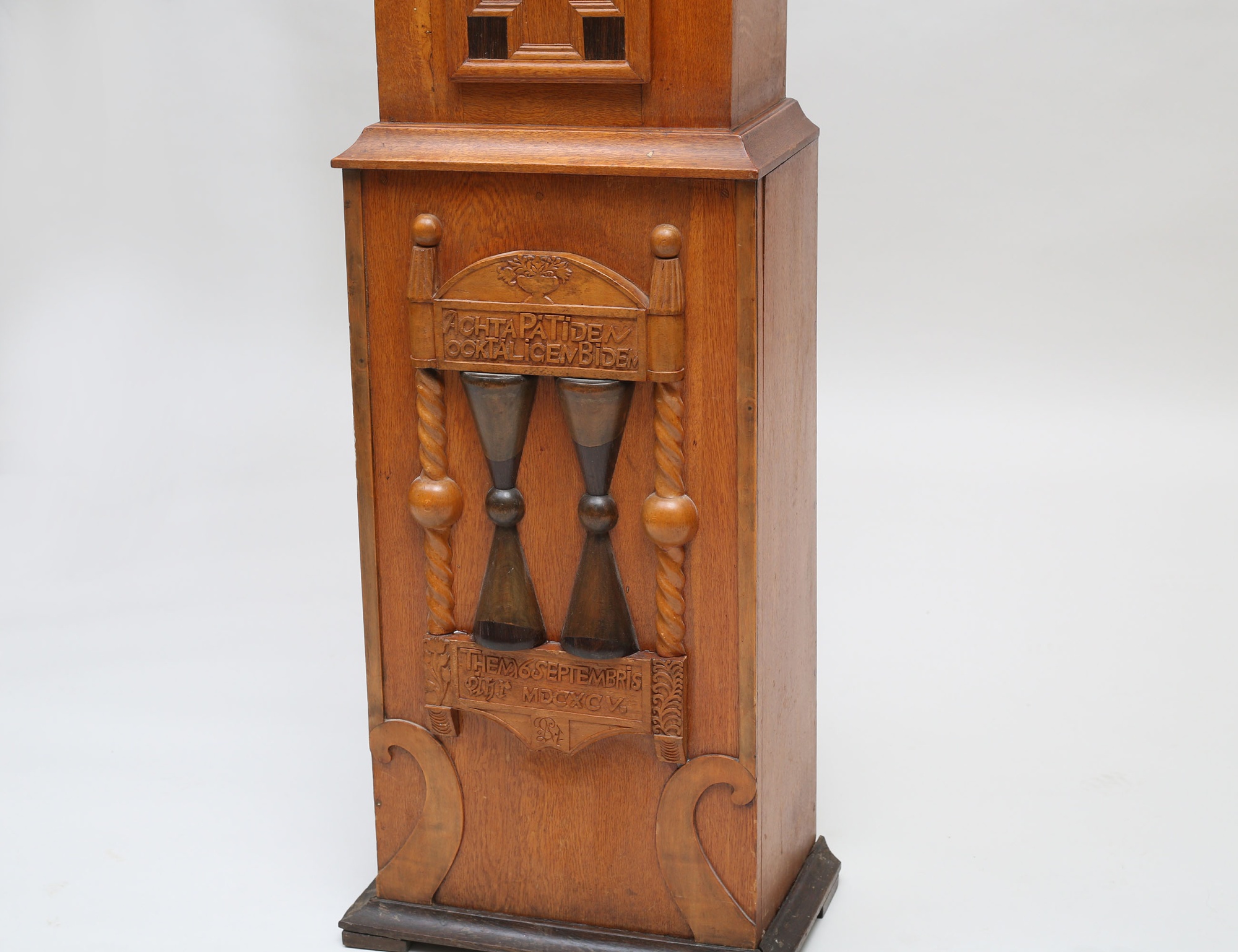 ek, fodralet med sniderier bla. text samt MDCXCV, urtavlan med ornamentik av delvis bronserat tenn, höjd 206, bredd 45 (renoveringar, fodral med kompletteringar)
