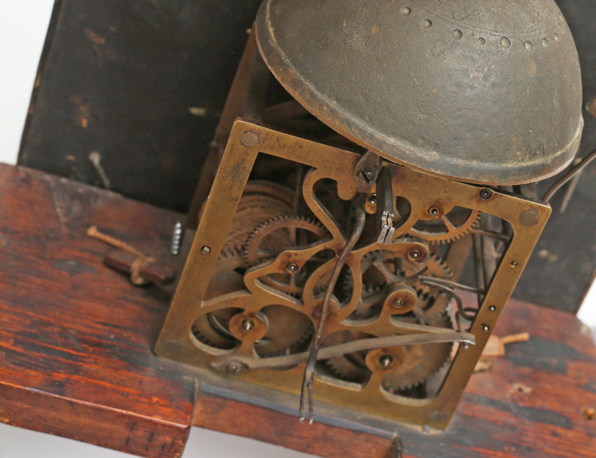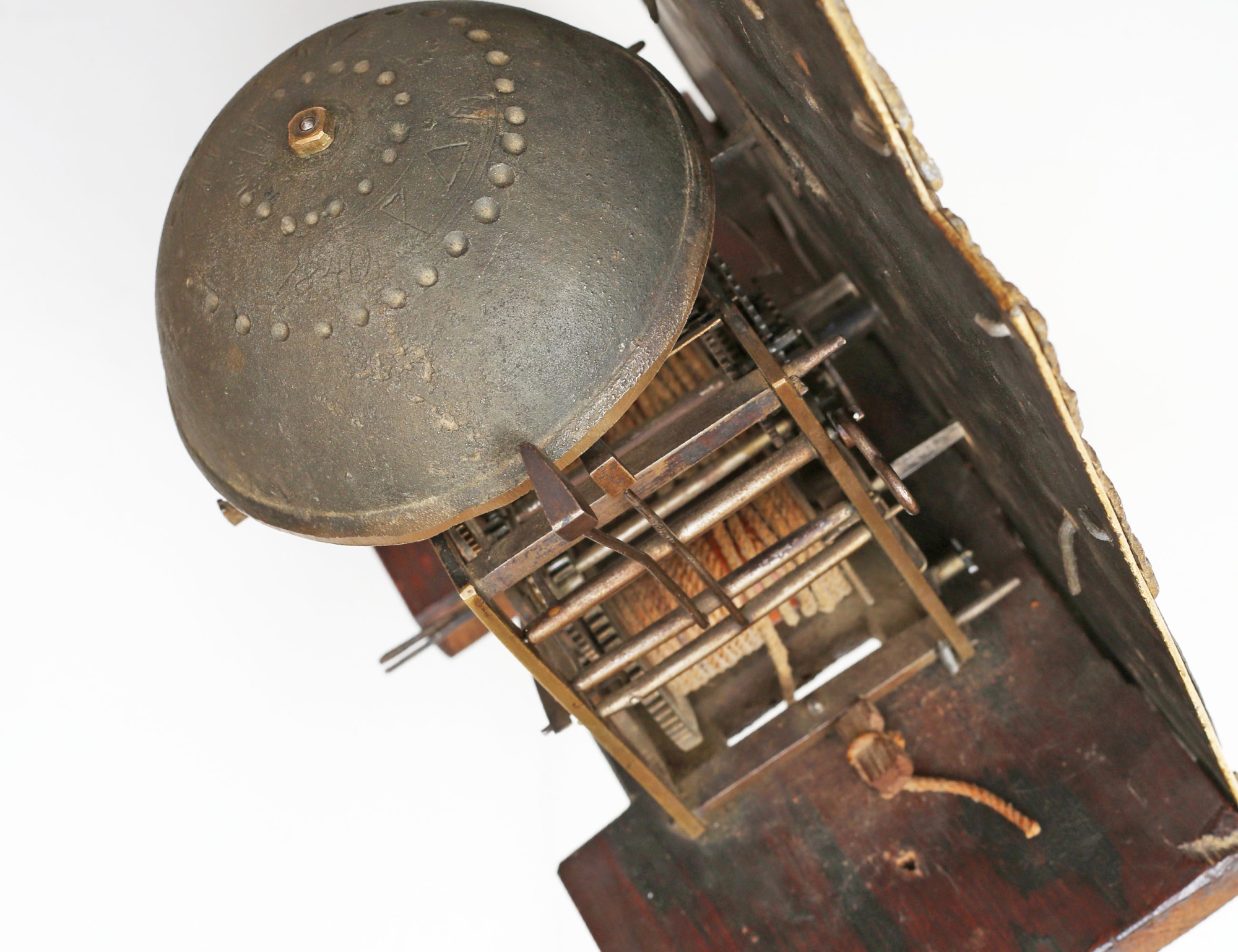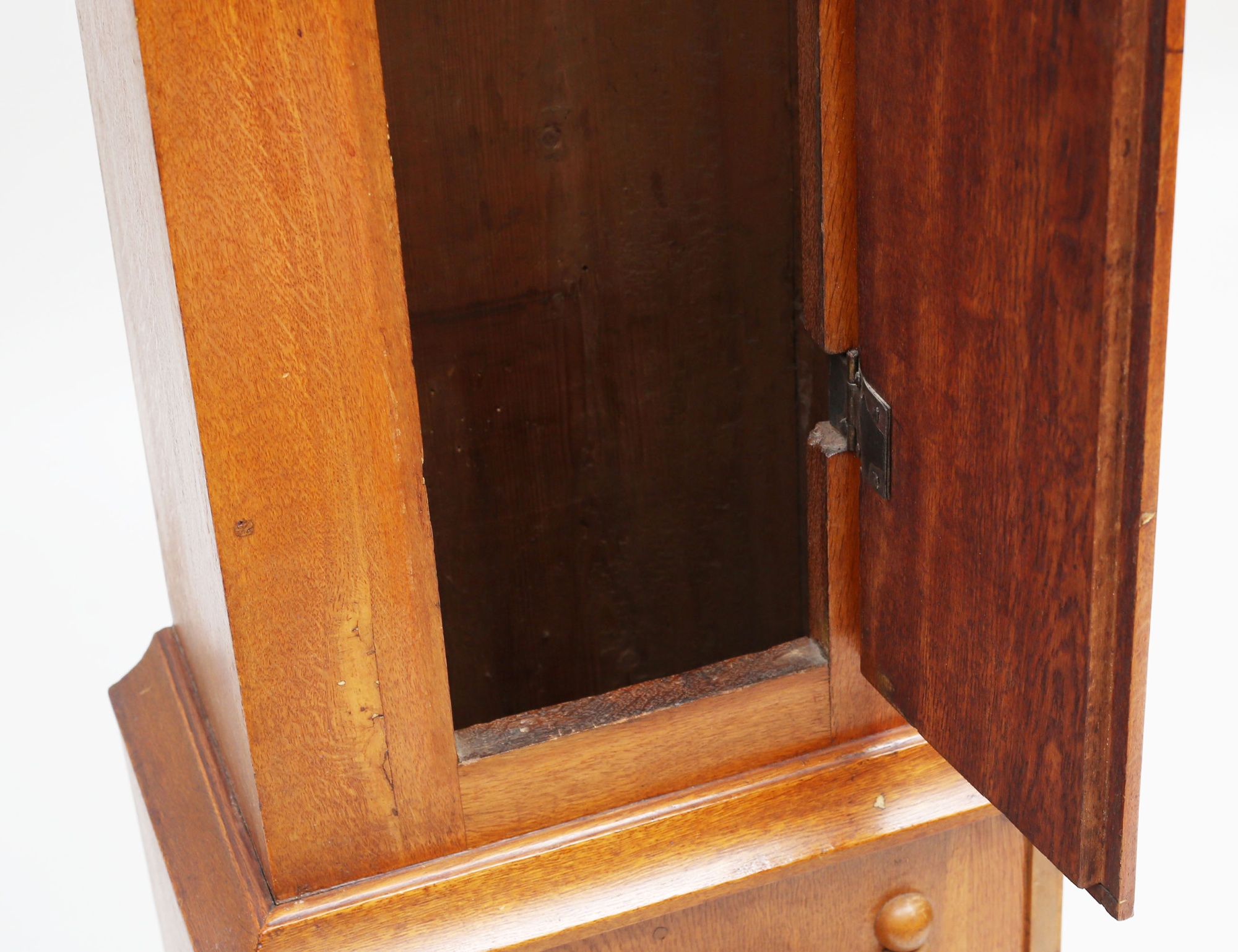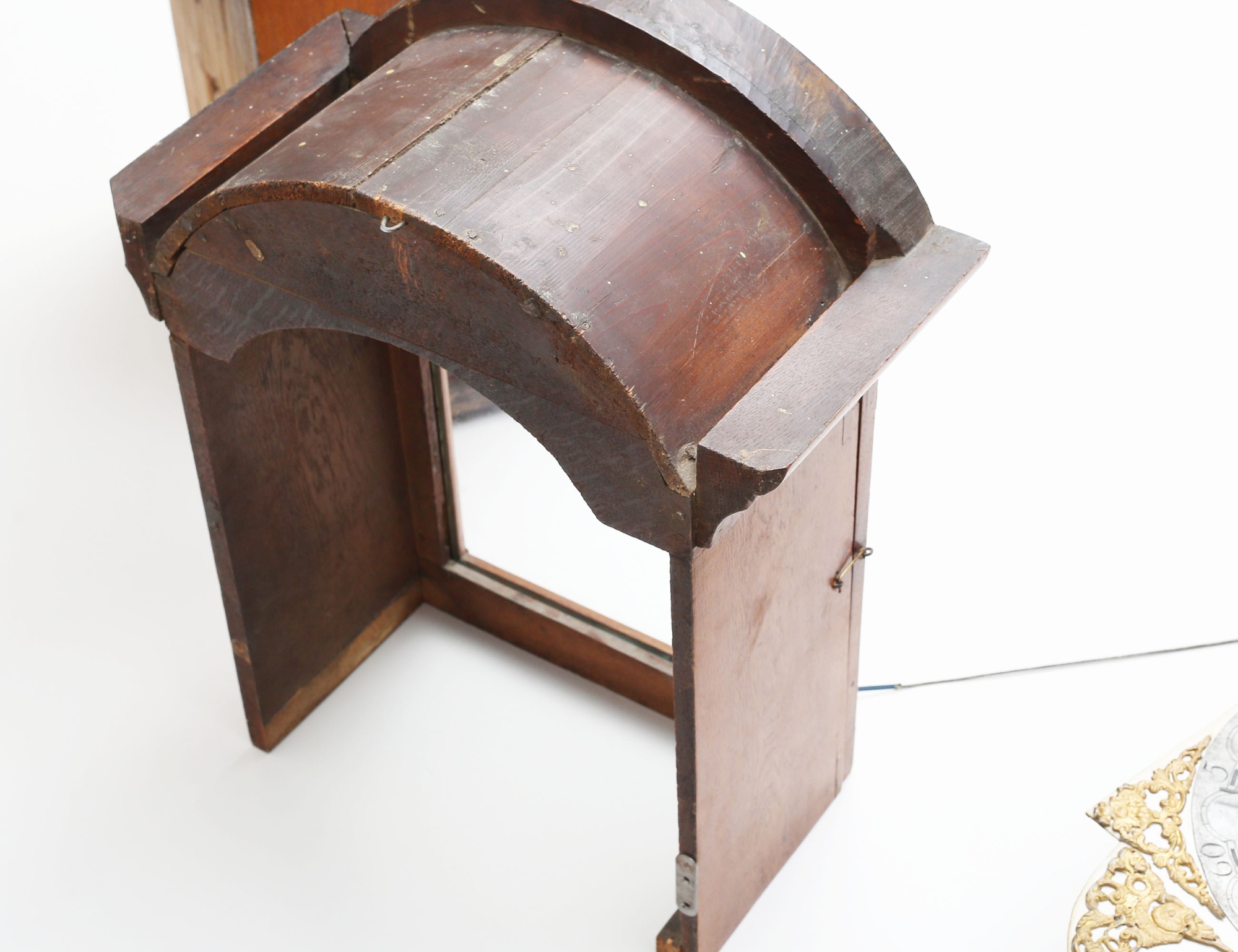ek, fodralet med sniderier bla. text samt MDCXCV, urtavlan med ornamentik av delvis bronserat tenn, höjd 206, bredd 45 (renoveringar, fodral med kompletteringar)