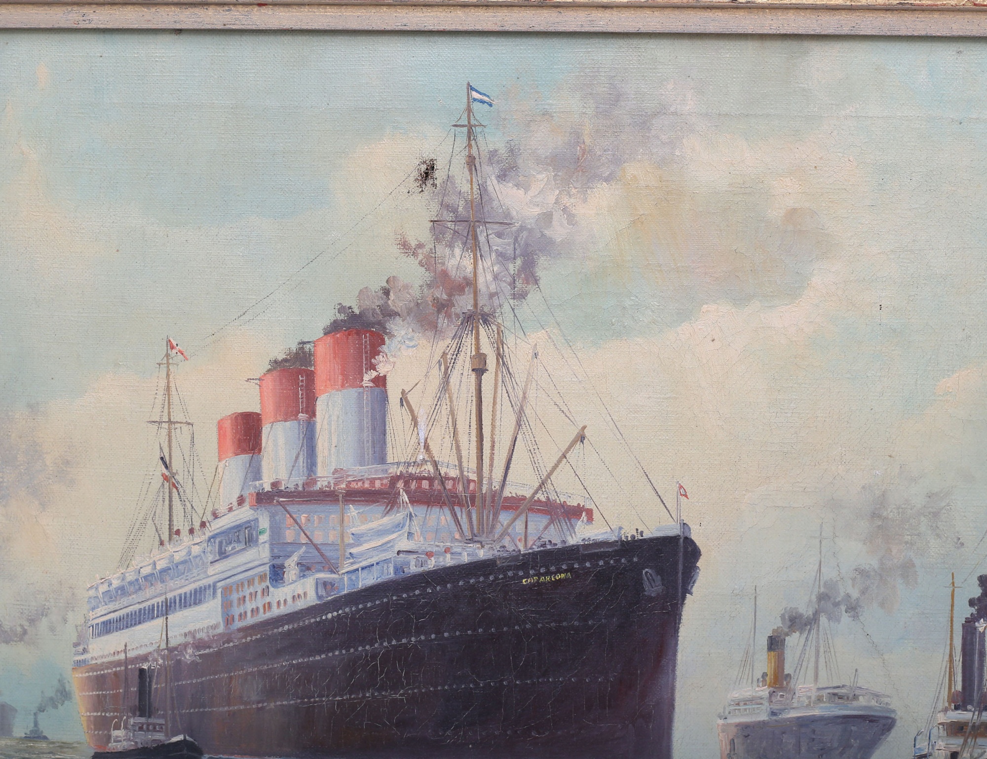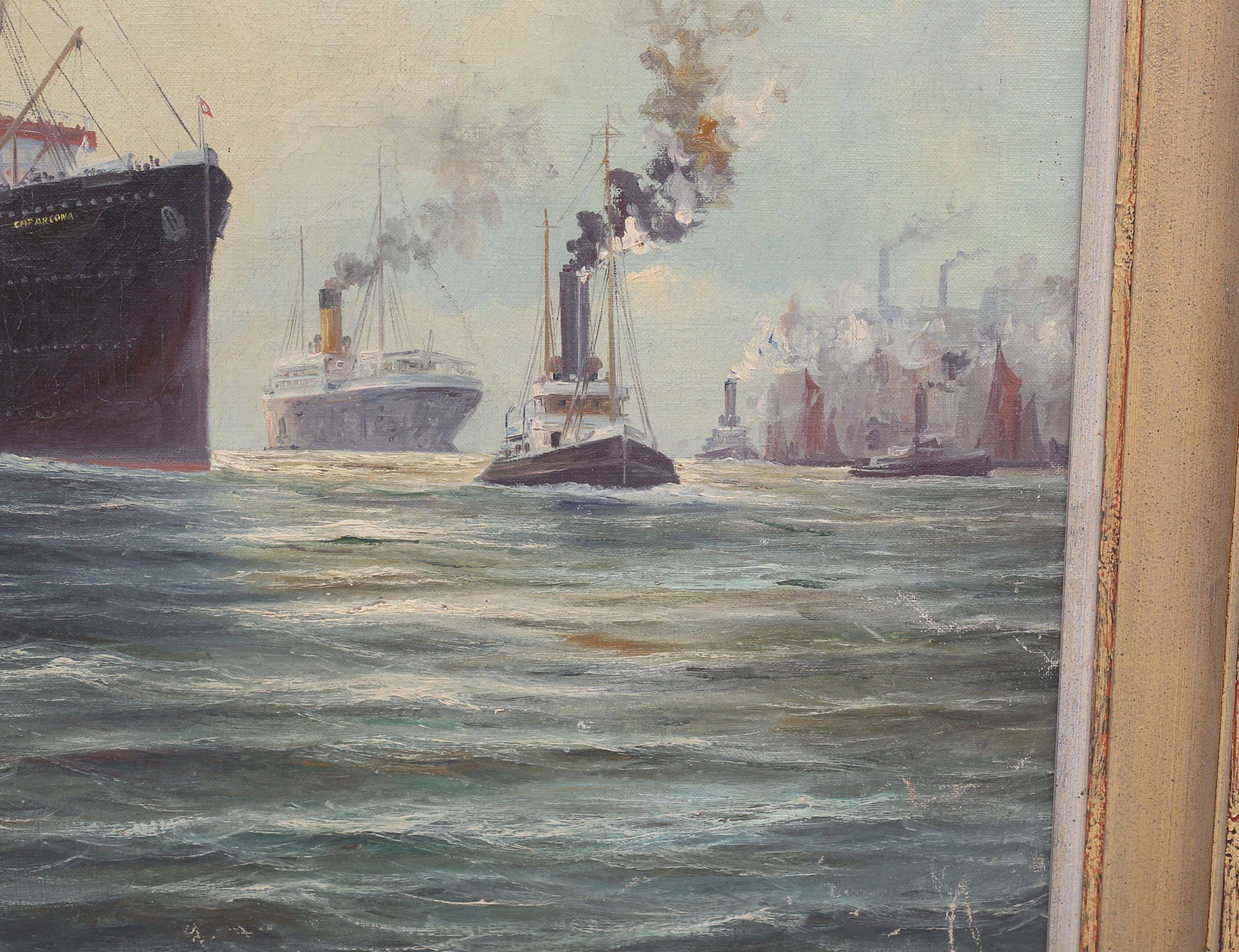 oljemålning på duk, Hamburgs hamn - oceanångaren Cap Arcona omgiven av mindre båtar, historik: Arcona lyxkryssare som sjösattes 1923 bombades och förlistes 1945, en av östersjöns värsta fartygskatastrofer, signerad, 53x79, rammått 66x92 (duken med ett hål, smärre färgbortfall)