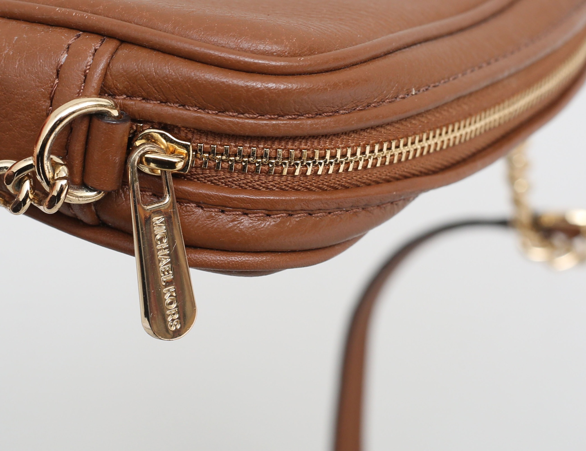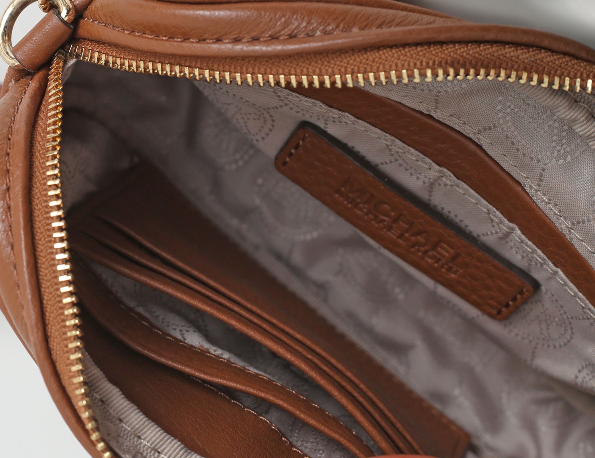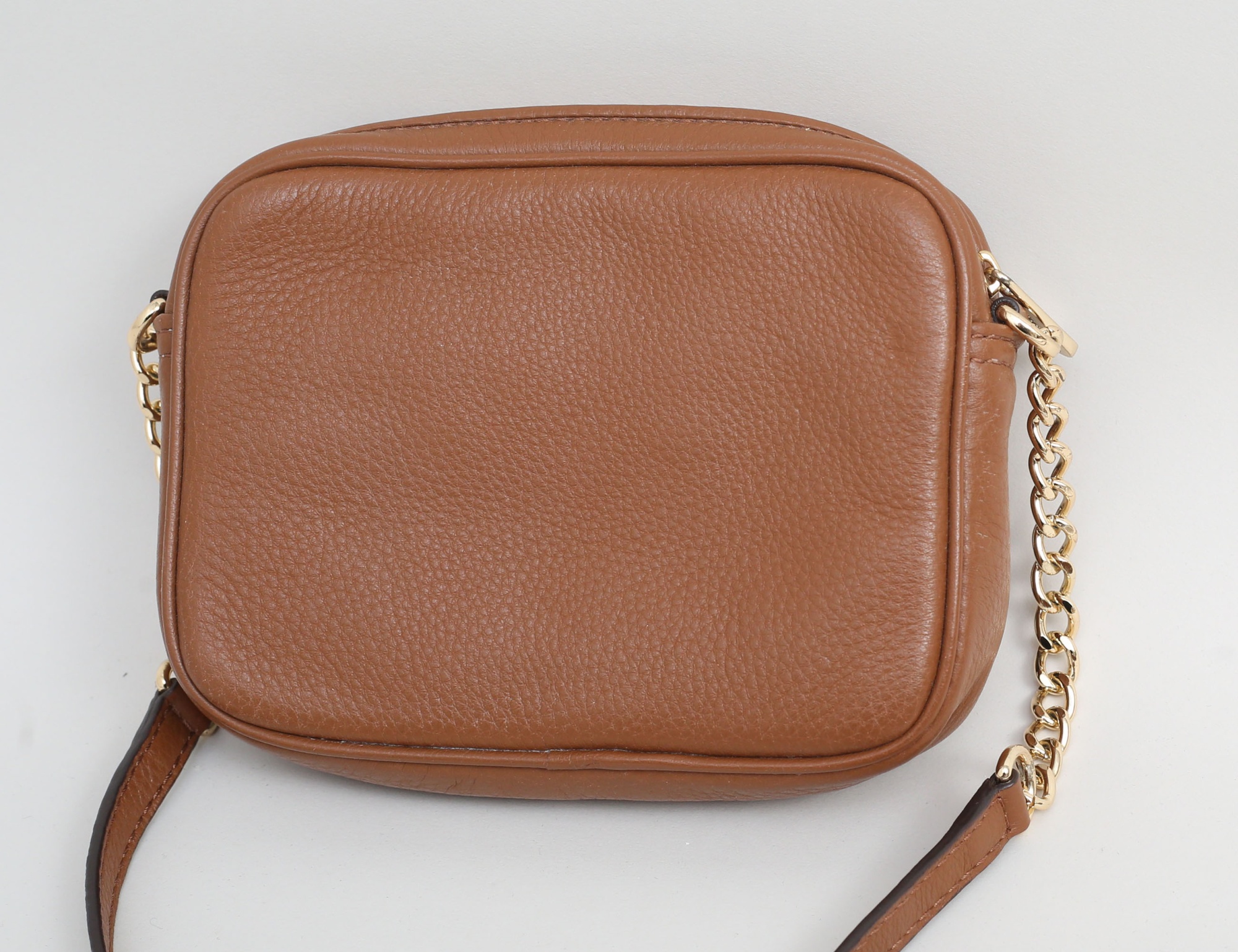 brunt skinn, detaljer i gulmetall, dragkedja, invändigt fem små fack, oanvänd, höjd 12, bredd 16