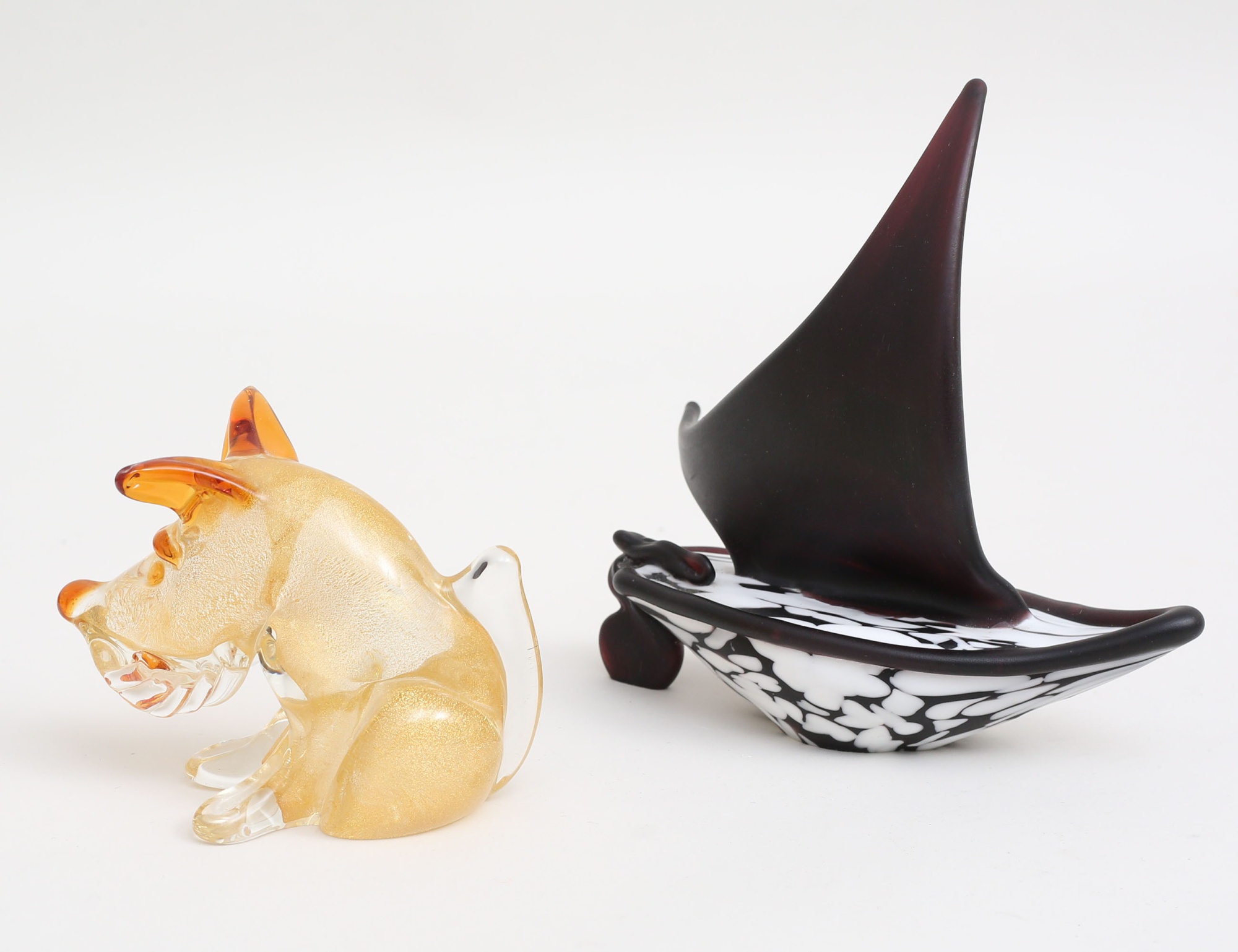 figurin skotsk terrier, höjd 9 (öra med nagg), segelbåt höjd 16,5, längd 16, etikettmärkta (2)