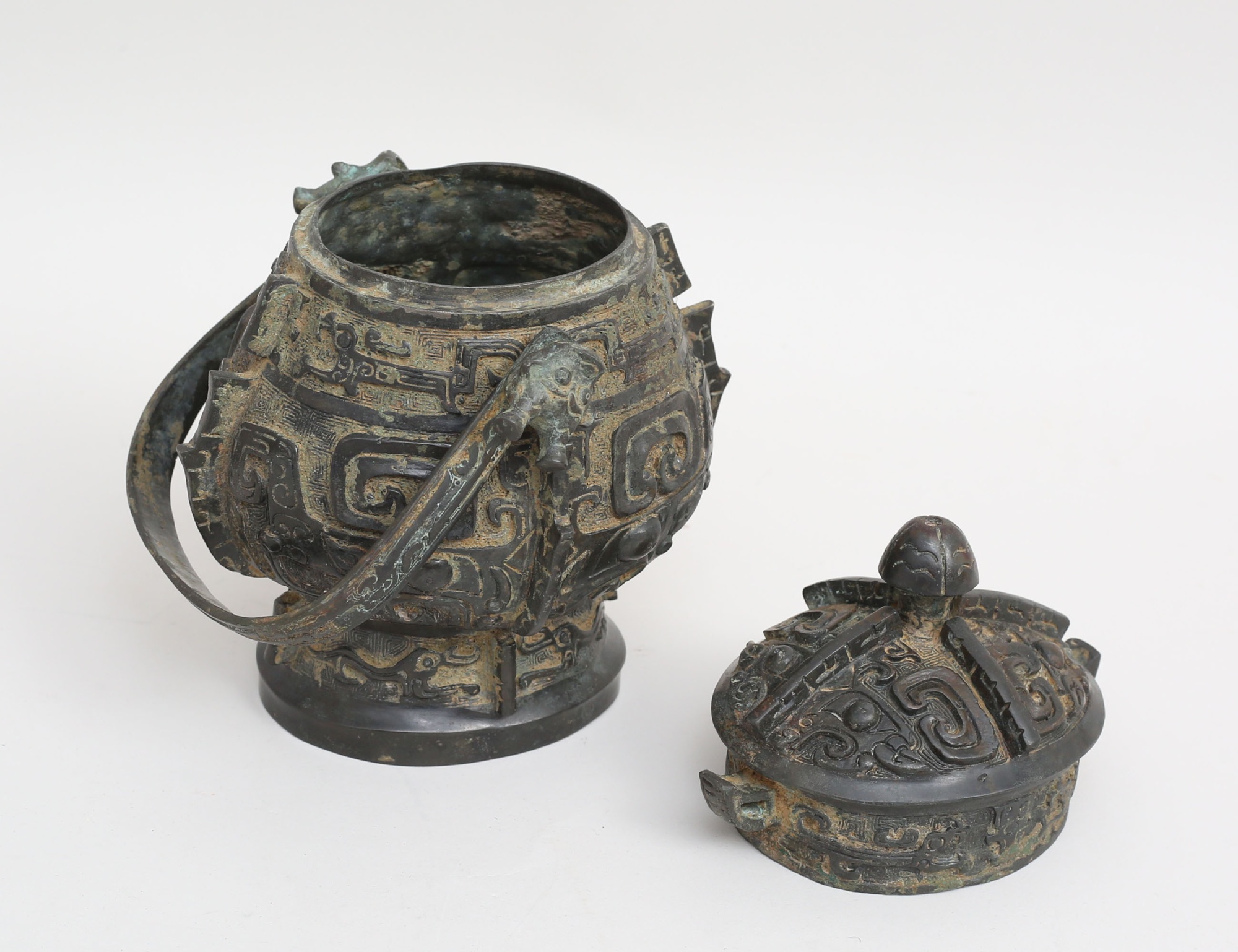 brons, rik dekor av stiliserade djur och geometriska mönster, höjd 22