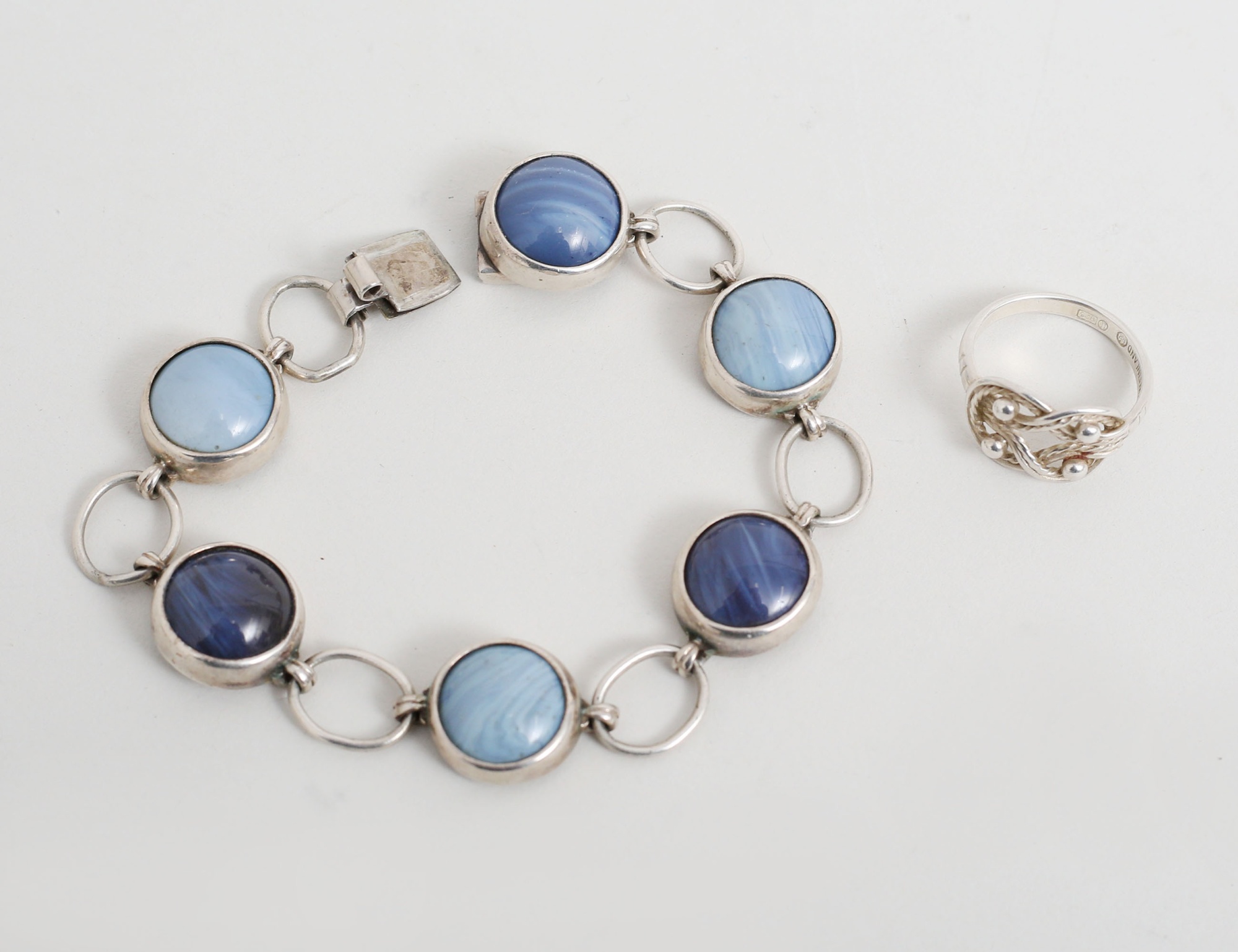 armband Bengt Ove Nordström Malmö 1982, sterlingsilver och bergslagssten, längd 18, ring Kalevala Koru Finland, sterlingsilver, storlek 17/54