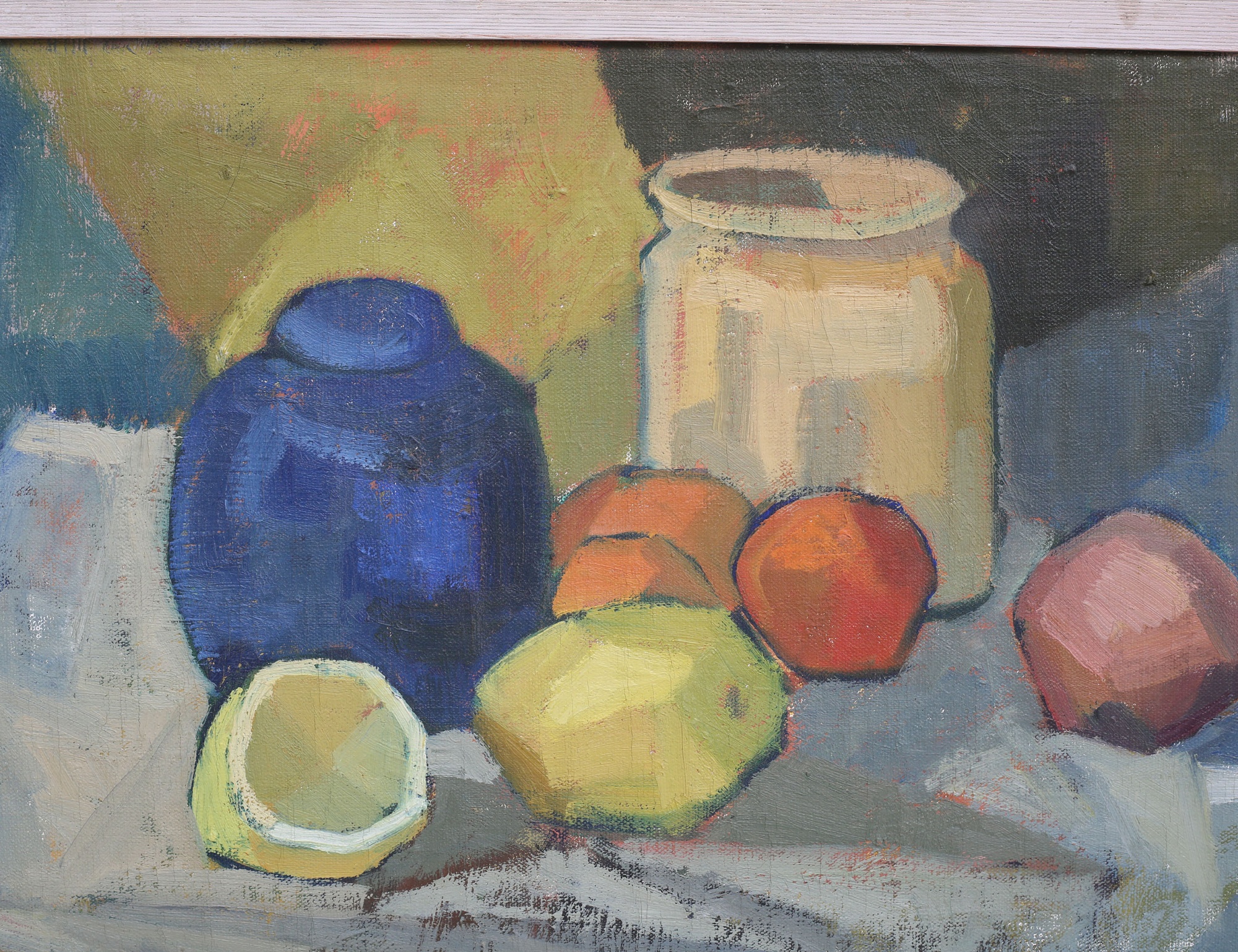 oljemålning på duk, stilleben med frukter och krus, signerad, 46x61