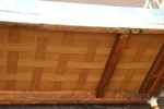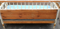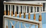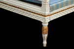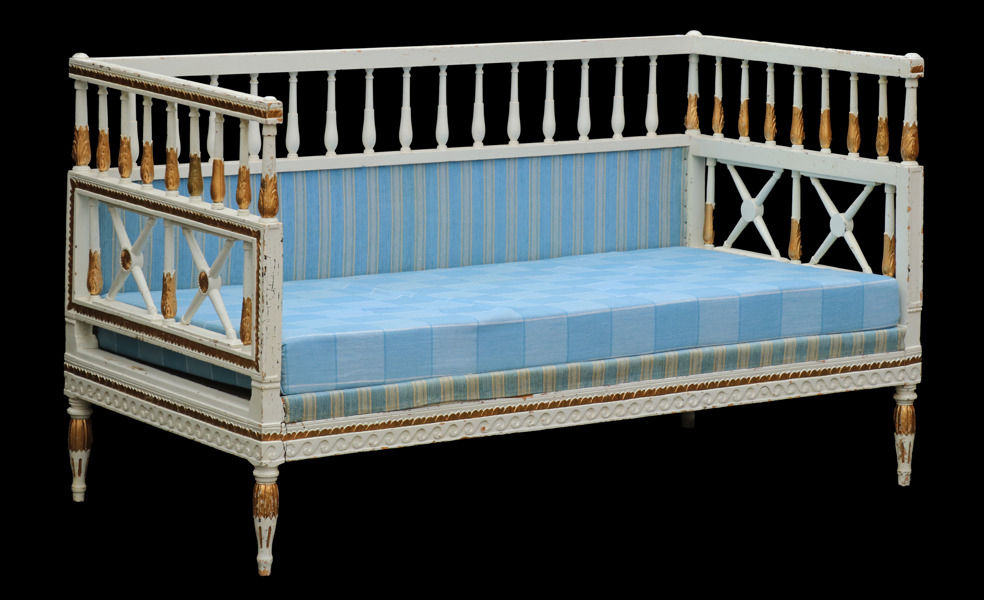 Vitmålad och bronserad. Bladhölstrade, kannelerade ben. Sarger med skurna bårder. Sidor med korslagda dekorer. Textil klädsel.