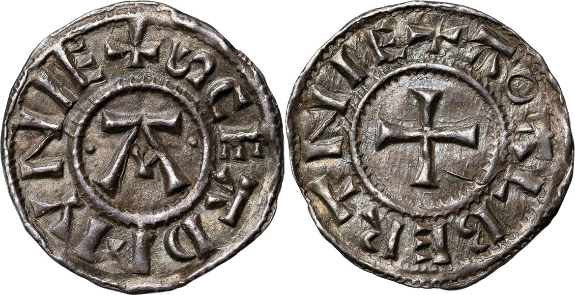 ENGLAND. Danish East Anglia (c. 885-915). St. Edmund memorial coinage. Large A)( Large cross. +SCEADMVNIE )( +AOALBERTNIE. Spink 960/961. 1,29 g. Mycket vacker patina. Very beautiful patina.