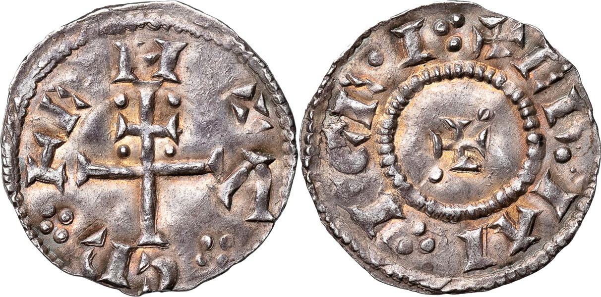 ( Small cross. CNVT REX)(+EB.IAI⸪I·CE·I⸪. Spink 991. 1,34 g. Vacker, något guldskimrande patina. Beautiful, somewhat goldish patina.