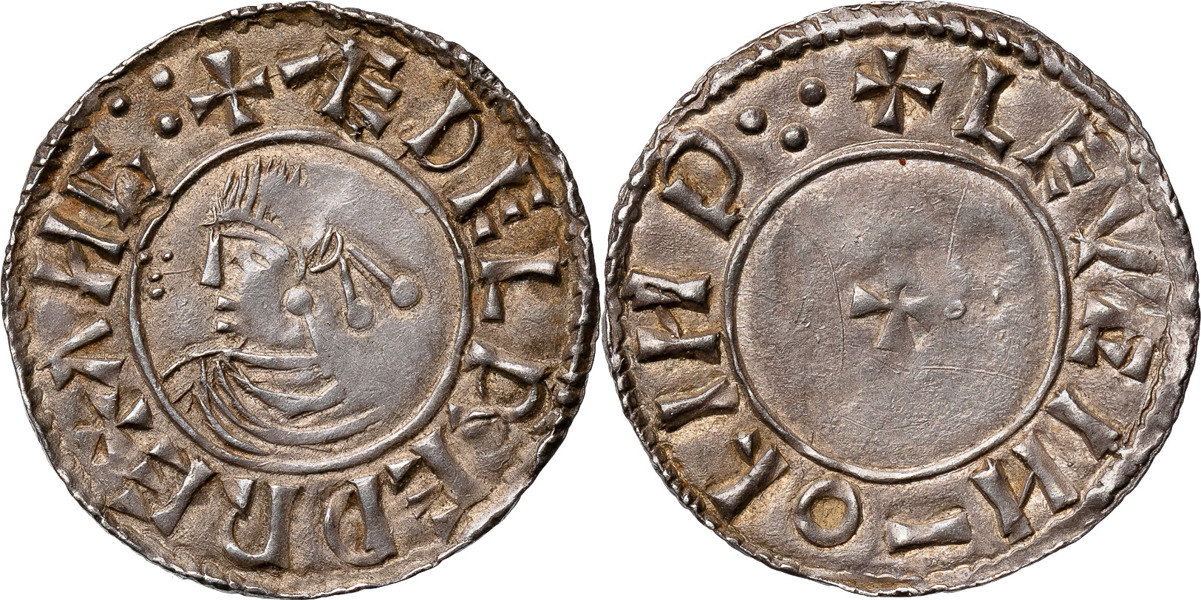 ENGLAND. Æthelred II (978-1016). LINCOLN. Penny. First small cross type, c. 978-979. Diademed bust right )( Small cross. +ÆÐELRED REX ANG⸪ )( +LEVEI N¯O LIN D⸪. Spink 1143. North 764. Mossop II:20 (Detta mynt!). 1,46 g. Obetydliga rispor. Mycket vacker patina. Hairlines. Very beautiful patina.