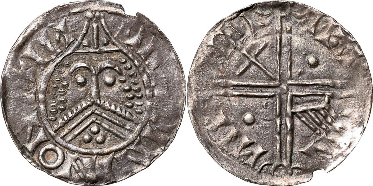 IRLAND / IRELAND. Hiberno-Norse (c. 1055-1065). Phase IV. Penny. Helmeted facing bust with triple-strand moustache, trefoil of pellets on chin )( Voided long cross, with triple crescent ends; pellets in first and third quarters, hand in second quarter, + in fourth quarter. Blundered legends. Spink 6136. 0,56 g. Liten kantskada. Delvis svagpräglad. Praktfull patina. Minor edge damage. Partly weakly struck. Magnificent patina.