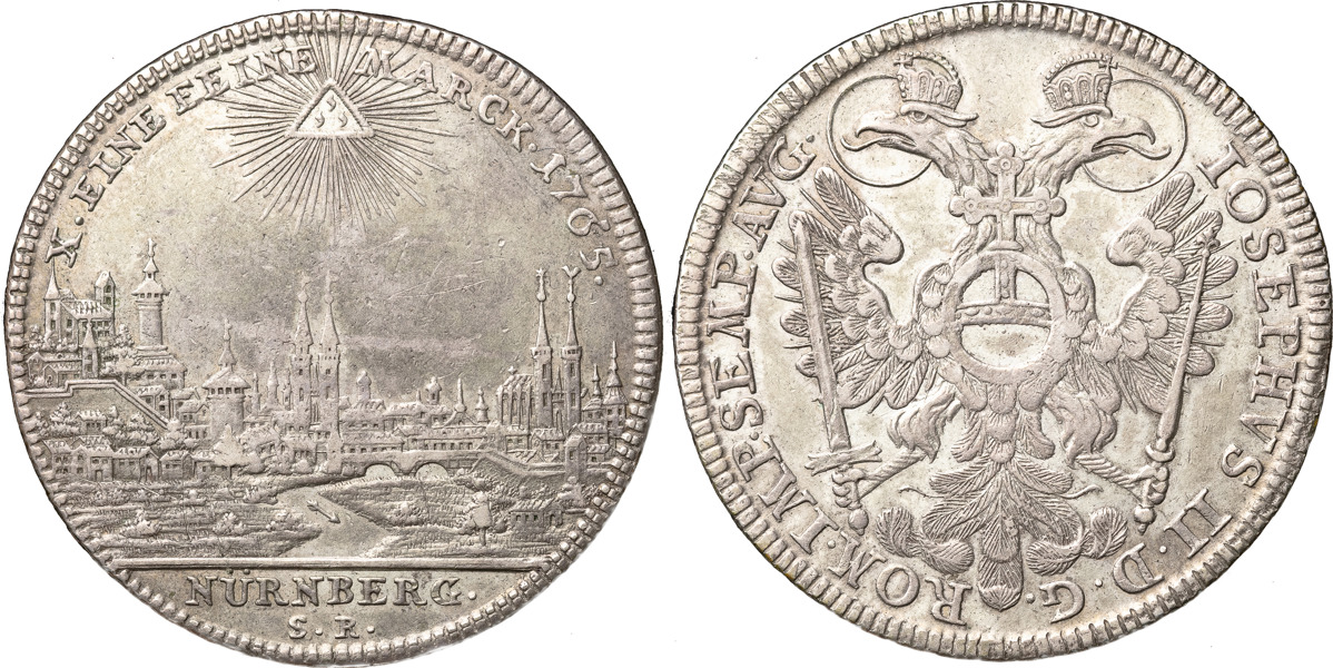 TYSKA STATER / GERMAN STATES. NÜRNBERG. Taler 1765, med Joseph II:s bröstbild och titel