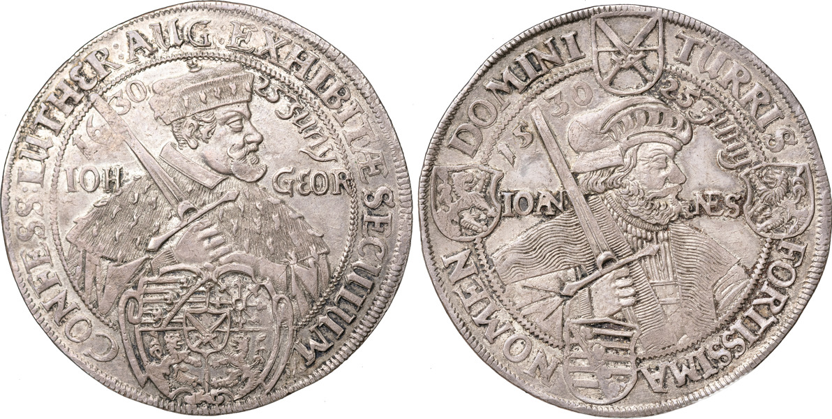 TYSKA STATER / GERMAN STATES. SACHSEN. Johann Georg I (1615-1656). Taler 1630. Augsburgska konfessionen 100 år. Dav. 7605 / 7606. 28,67 g. Vackert exemplar med härlig patina. Beautiful specimen with lovely patina.