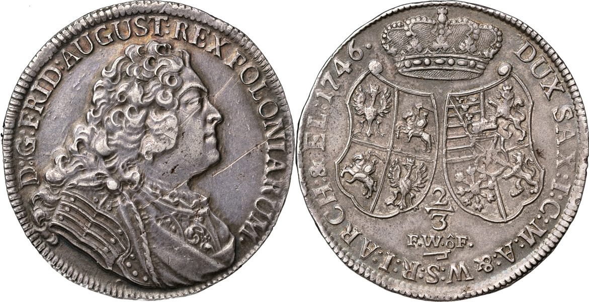 TYSKA STATER / GERMAN STATES. SACHSEN. Friedrich August II (1733-1763). 2/3 taler 1746. KM 879. 13,67 g. Repor. Vacker patina. Scratches. Beautiful patina.
