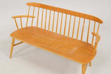 Pinnsoffa, 1900-talets andra hälft, sits fanerad i teak, längd 128 cm