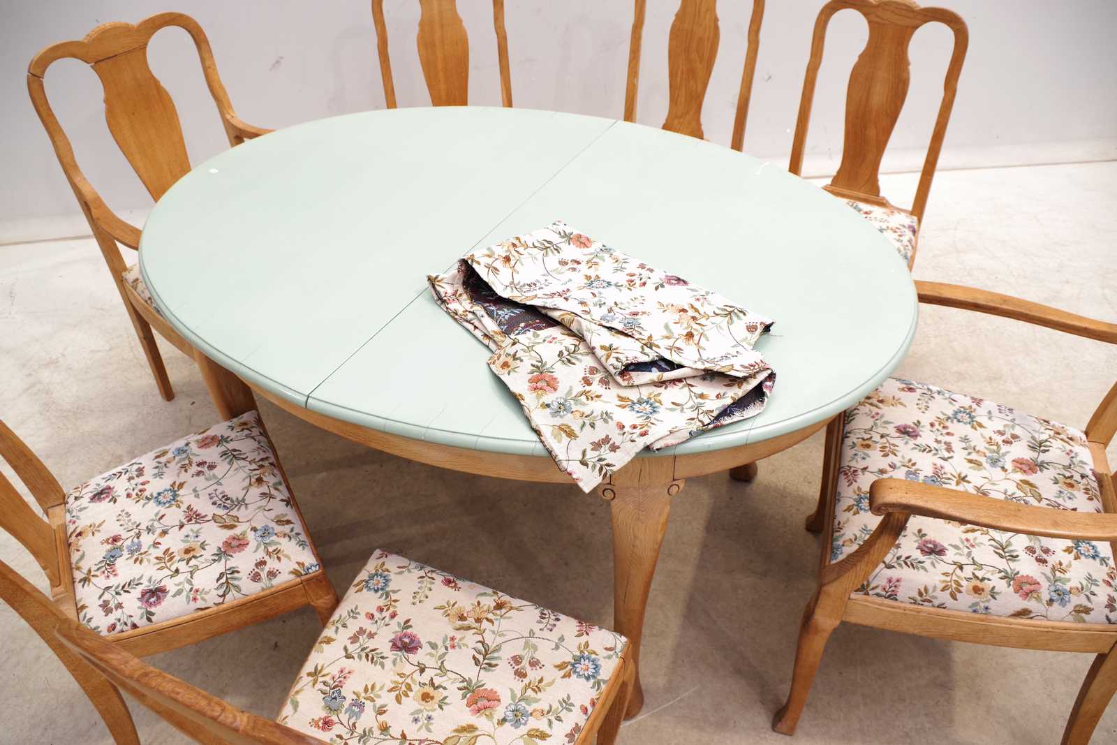 MATGRUPP bord med 2st iläggsskivor samt 5+2st stolar, ek, 1900-talets första hälft. H:79x 150x 110cm. slitage, extra tyg medföljer.
