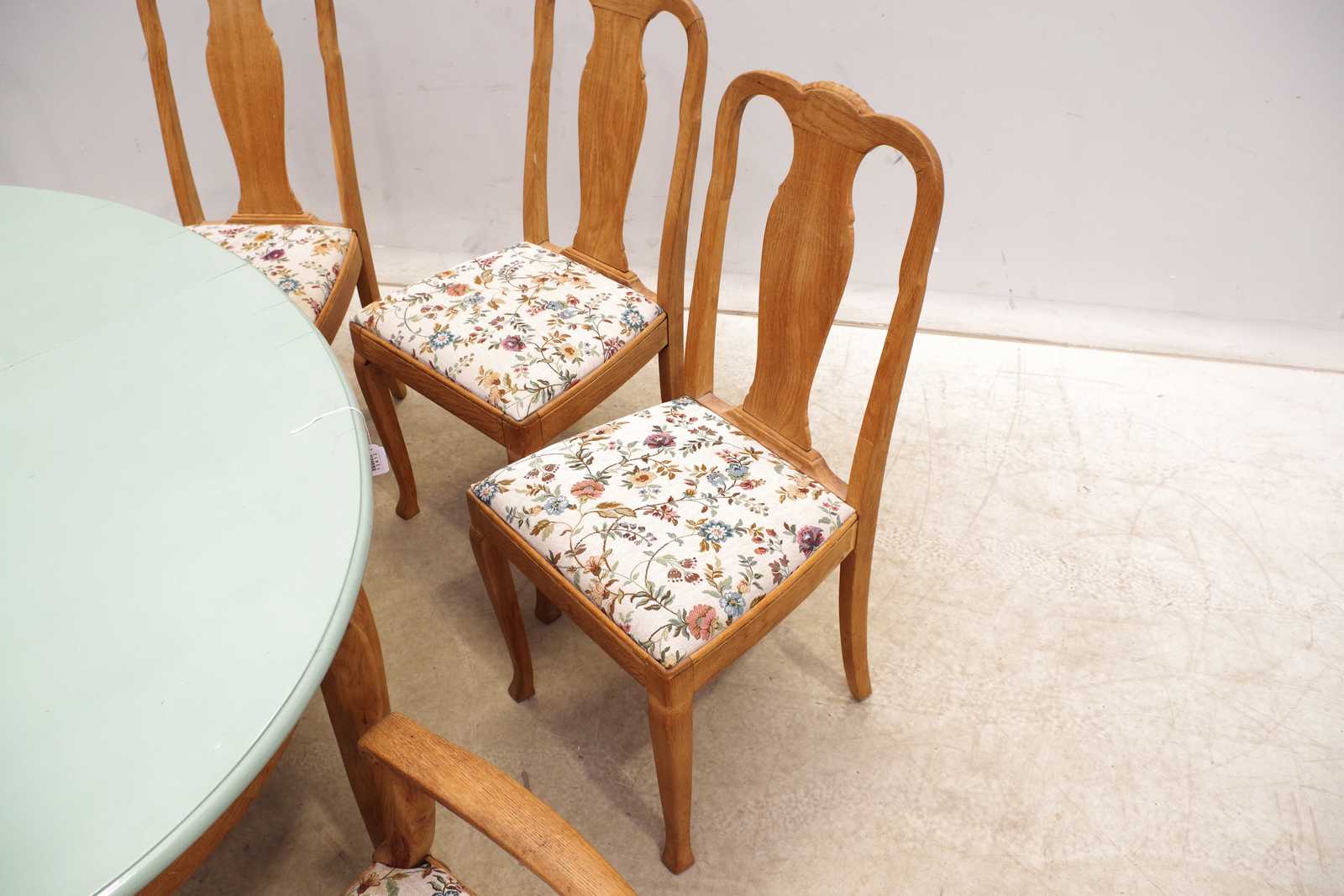 Bilder MATGRUPP bord med 2st iläggsskivor samt 5+2st stolar, ek, 1900-talets första hälft. H:79x 150x 110cm. slitage, extra tyg medföljer.