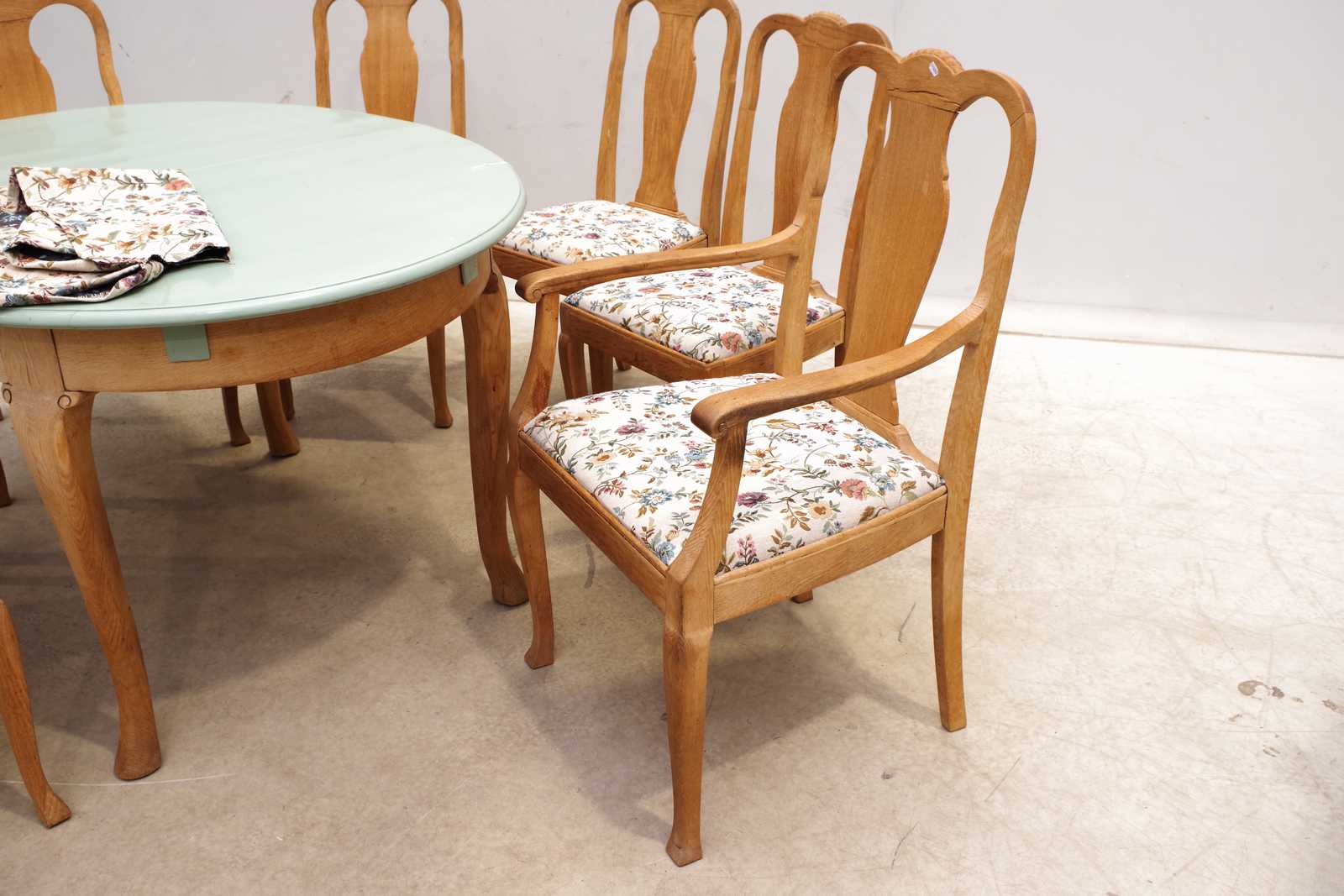 Auktioner MATGRUPP bord med 2st iläggsskivor samt 5+2st stolar, ek, 1900-talets första hälft. H:79x 150x 110cm. slitage, extra tyg medföljer.