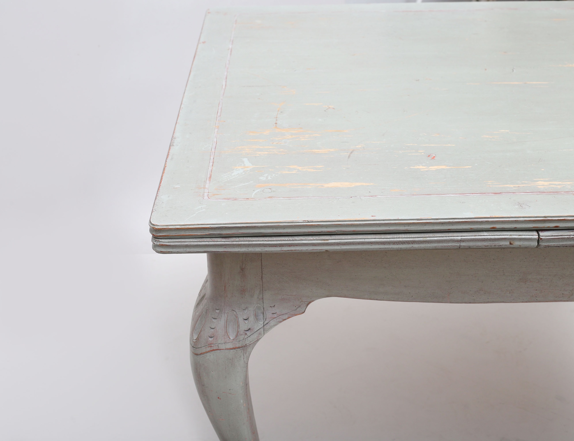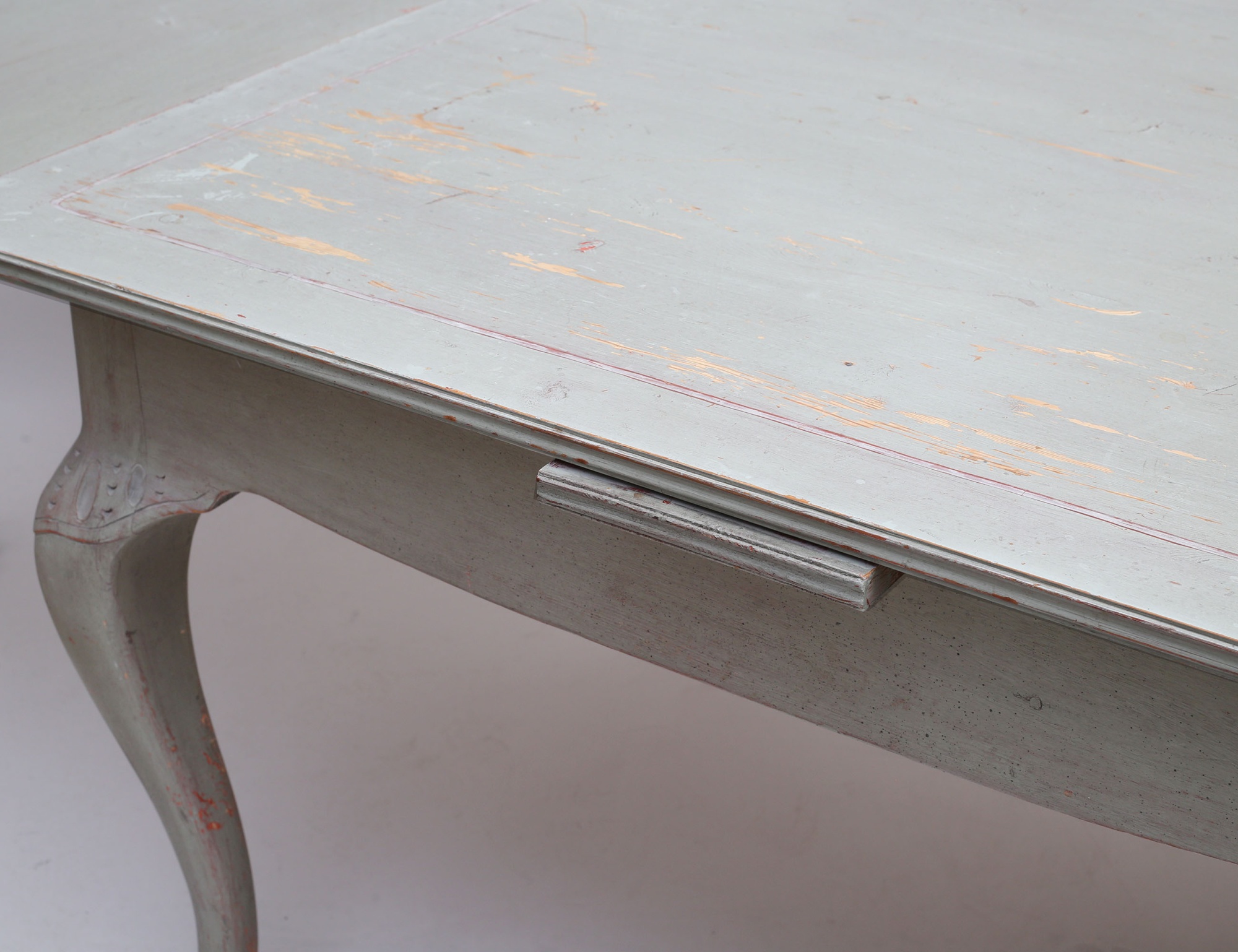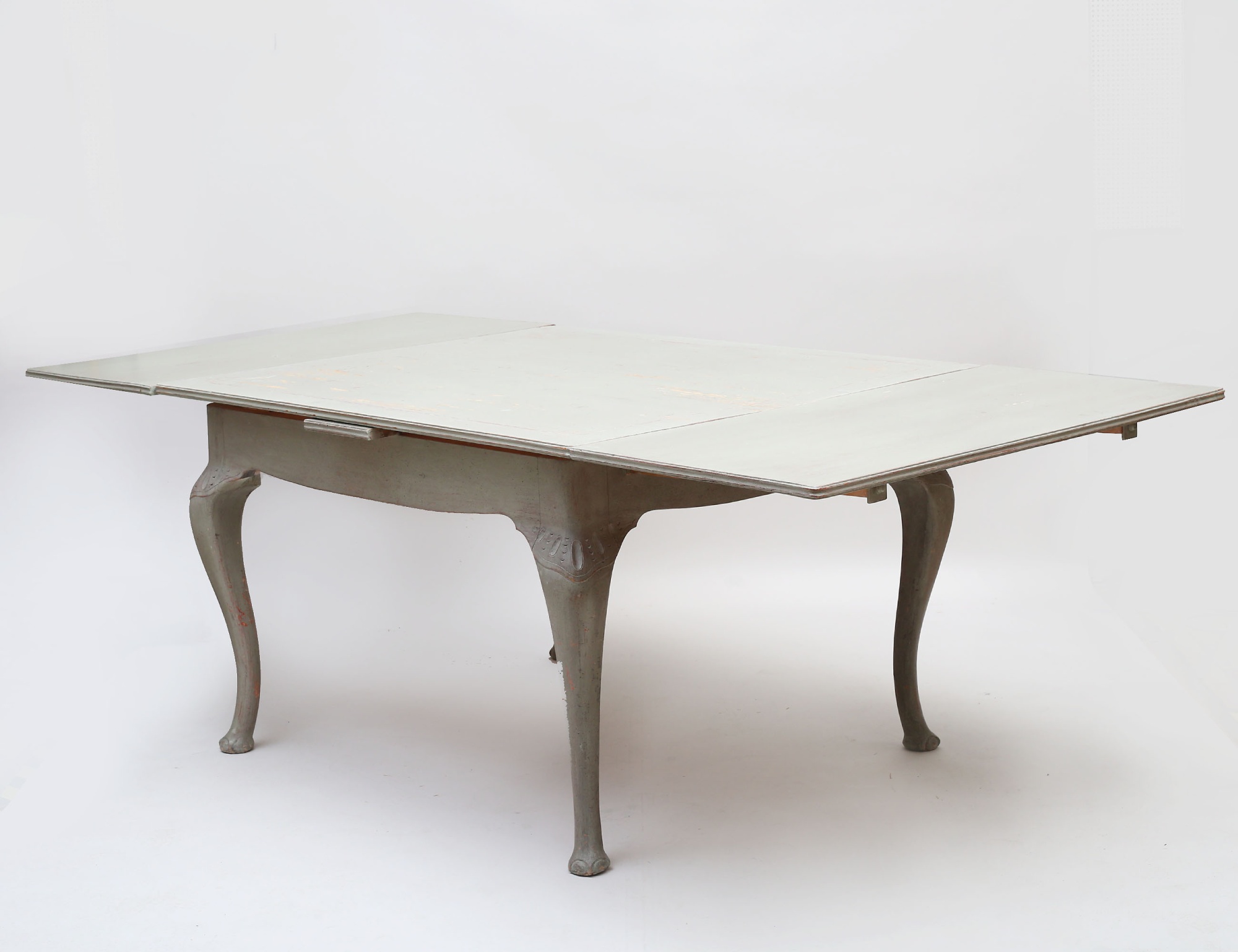 fransk lantstil, bemålat, träskuren dekor, två utdragbara skivor, höjd 80, bredd 113, längd 130 total längd 238 (färgsläpp, smärre bruksslitage)
