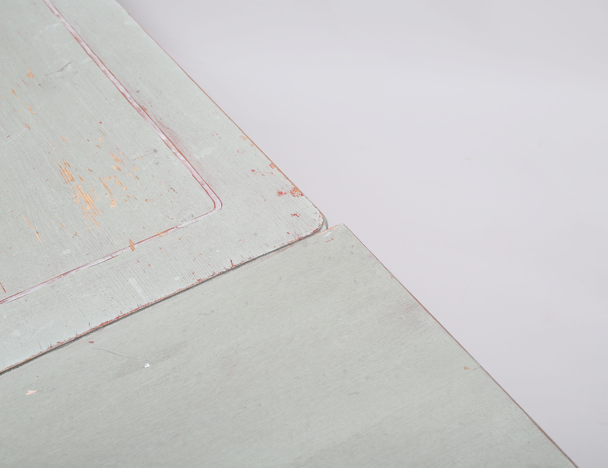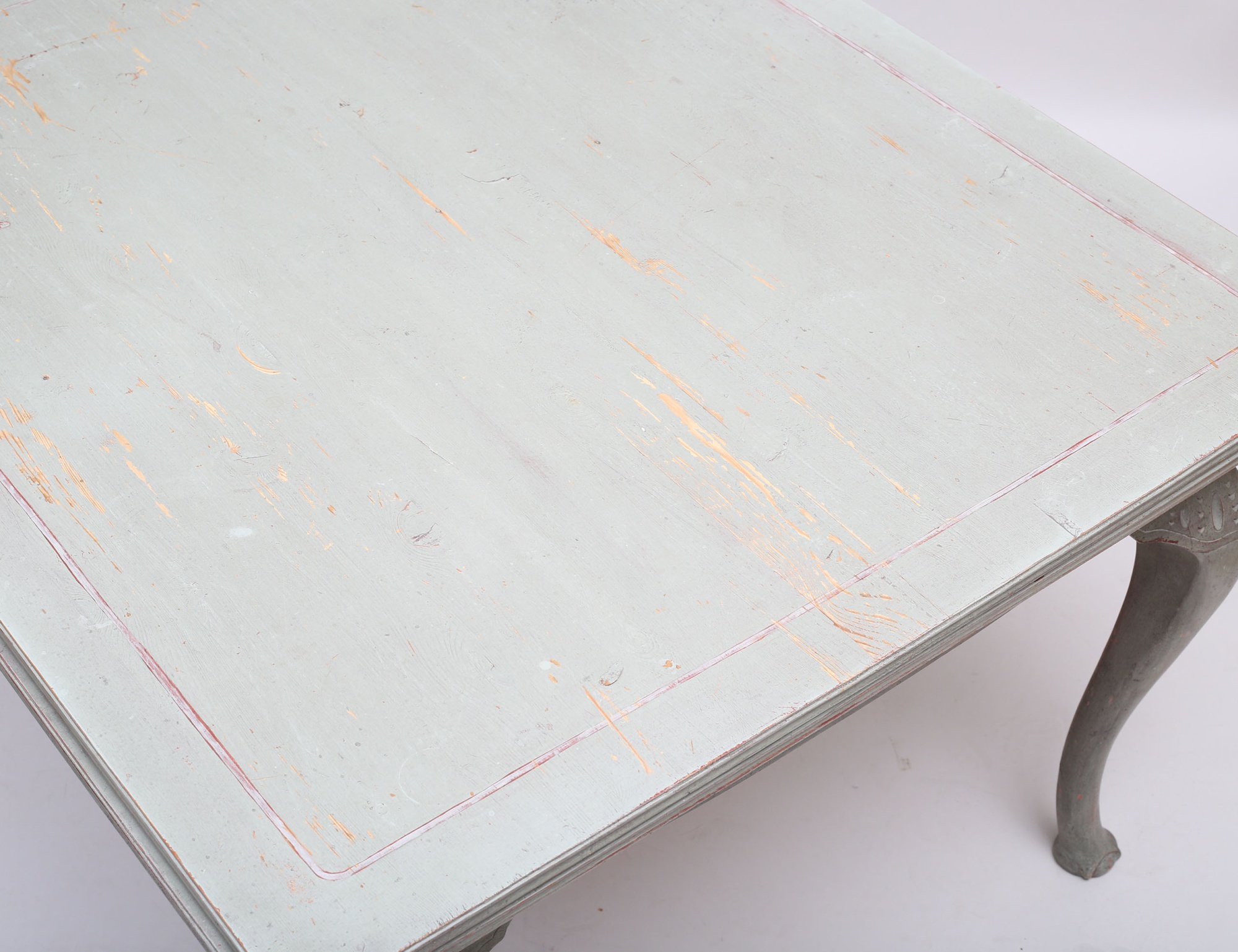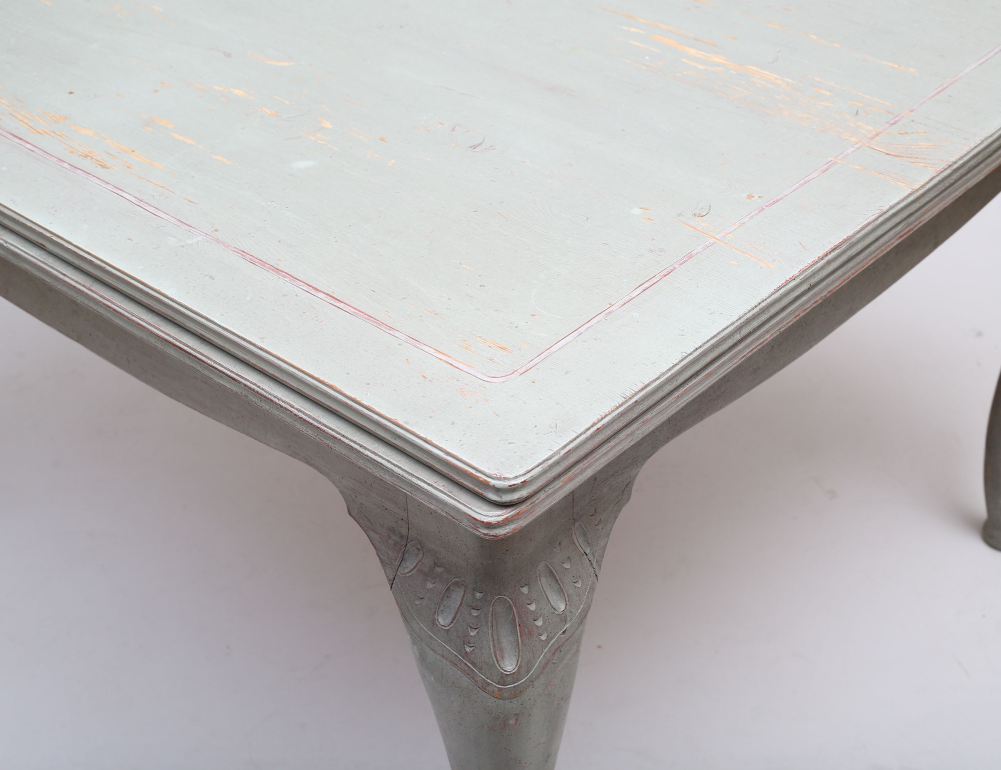 fransk lantstil, bemålat, träskuren dekor, två utdragbara skivor, höjd 80, bredd 113, längd 130 total längd 238 (färgsläpp, smärre bruksslitage)