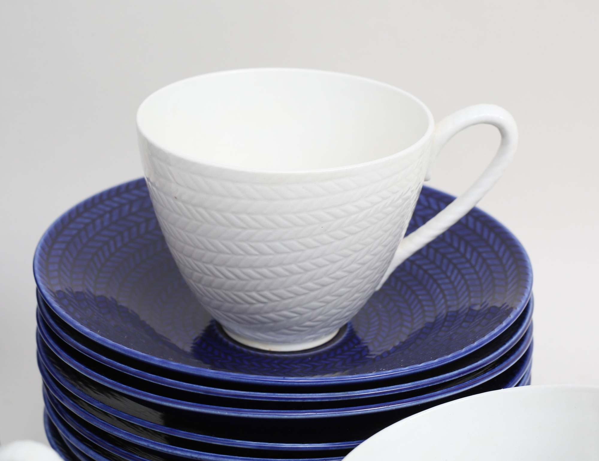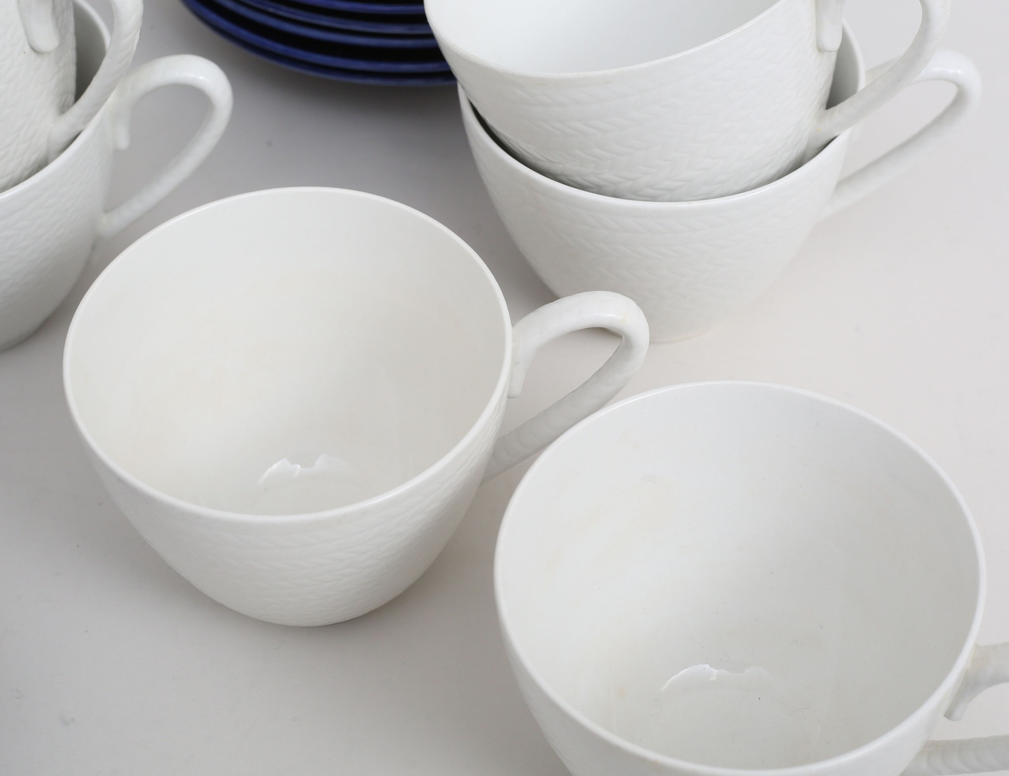 Hertha Bengtsson Rörstrand, 7 tekoppar med fat, tekanna, fat, sockerskål samt skål, höjd 8, bredd 29x20 (6 extra tefat medföljer, skål med nagg)