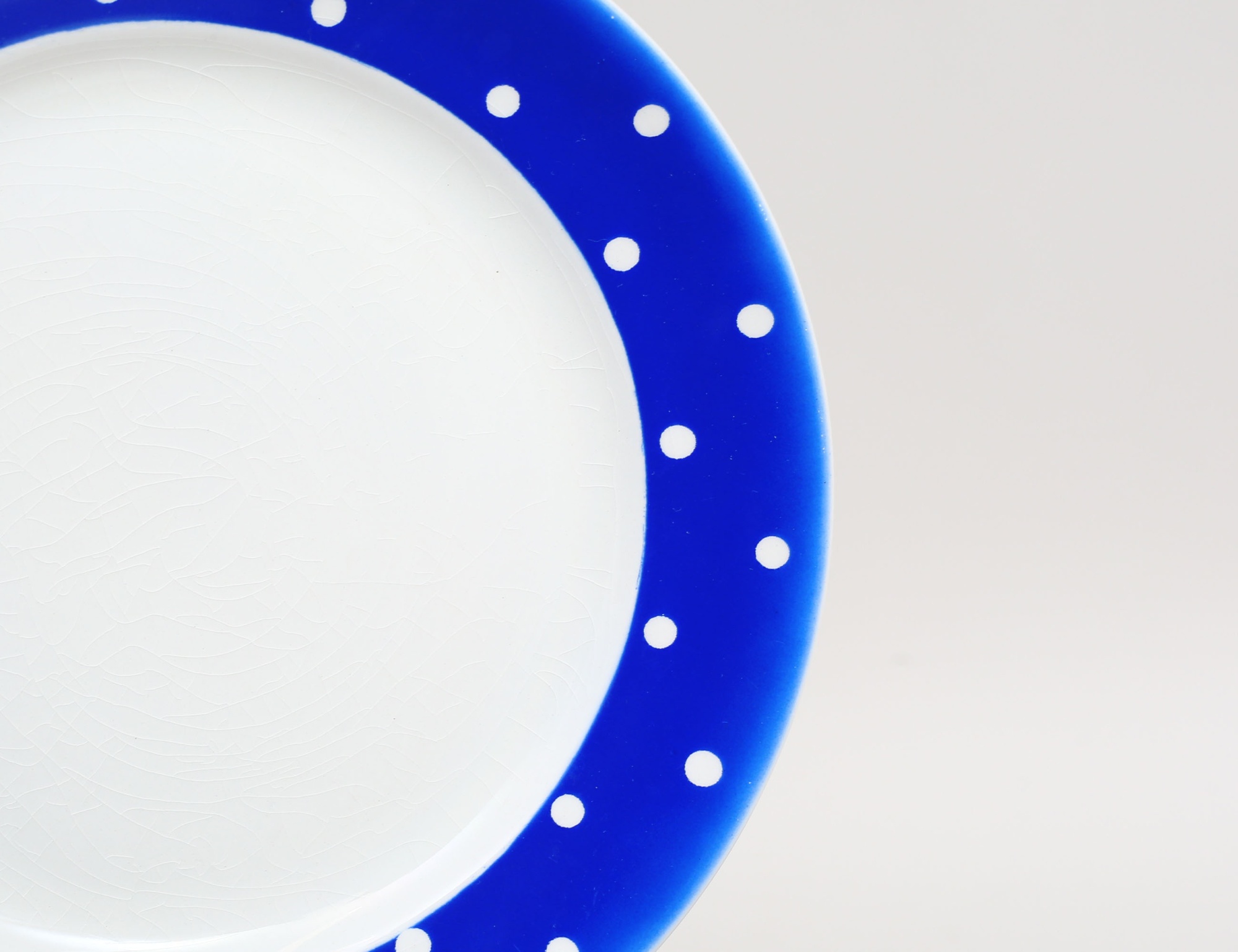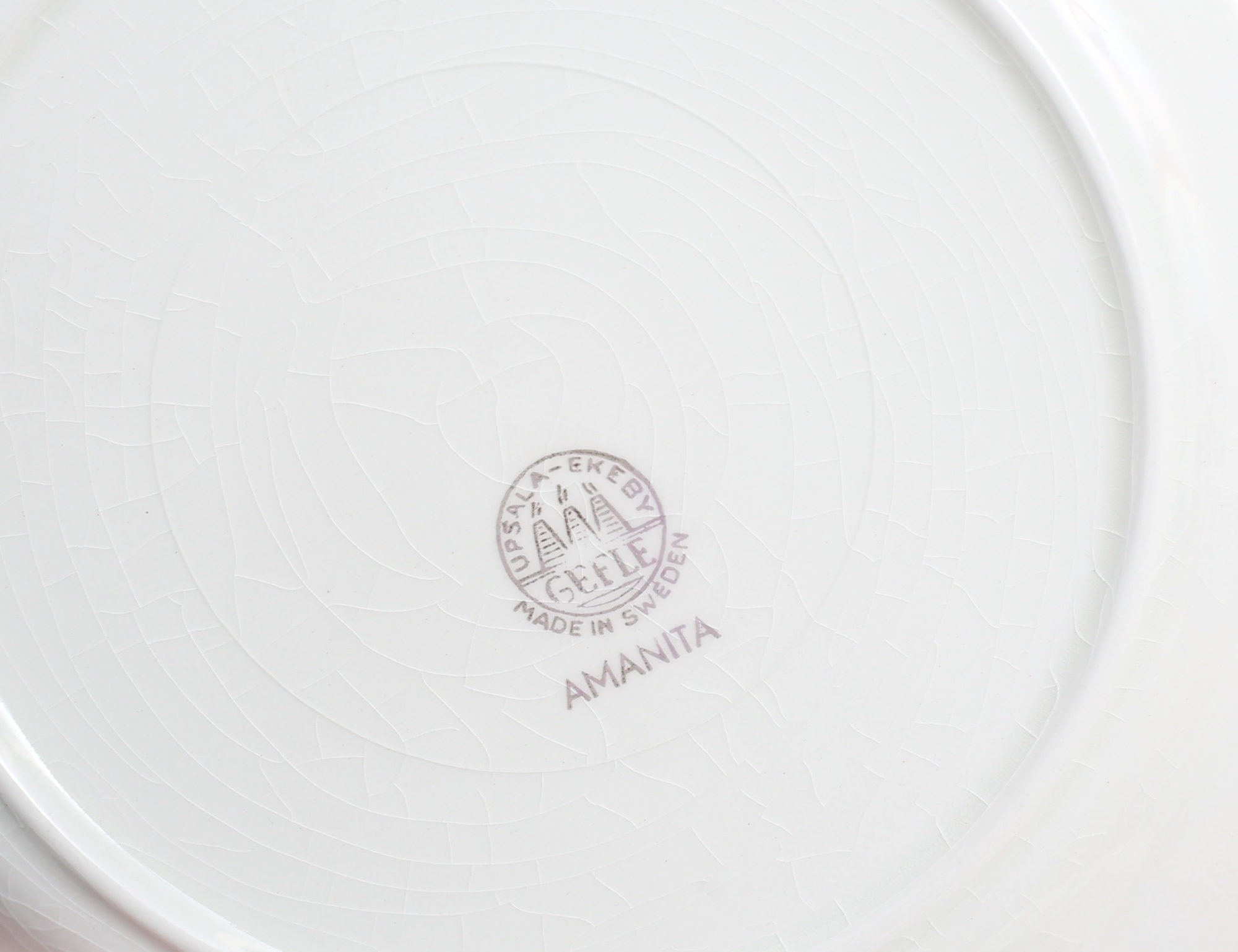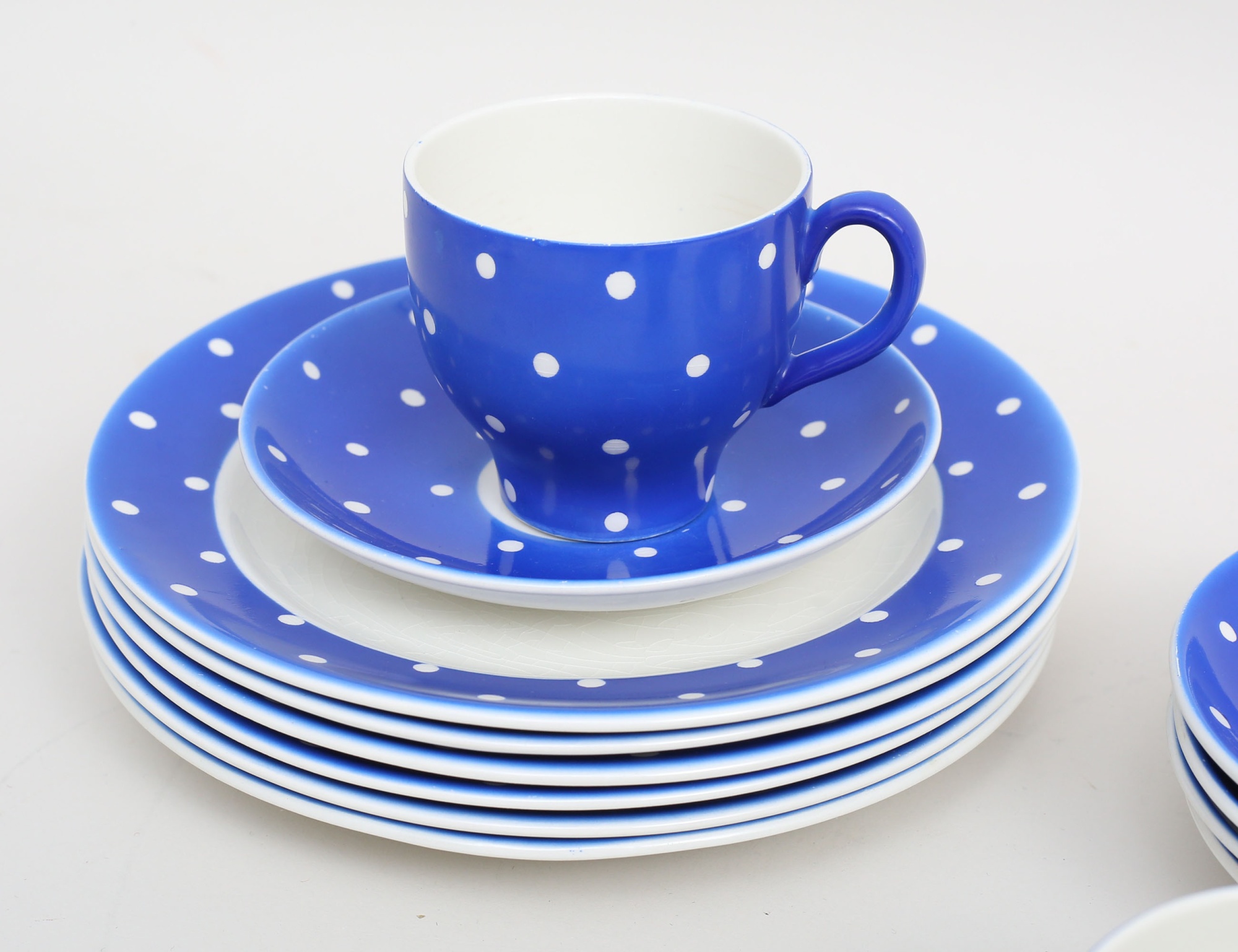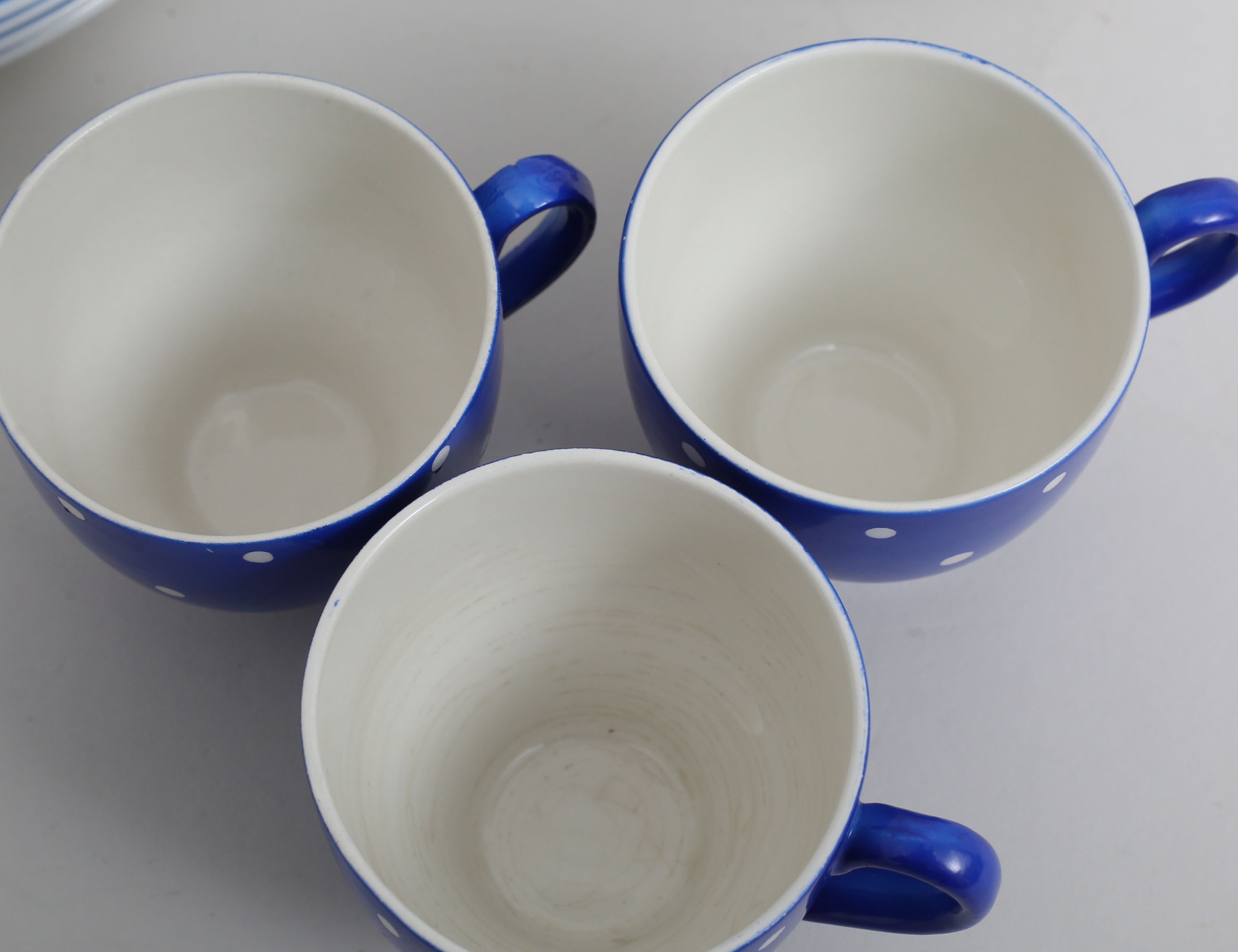 Helmer Ringström Gefle, 3 kaffekoppar med fat, 6 assietter, blå dekor med vita prickar, höjd 6,5 (en kopp med krackelyrer)