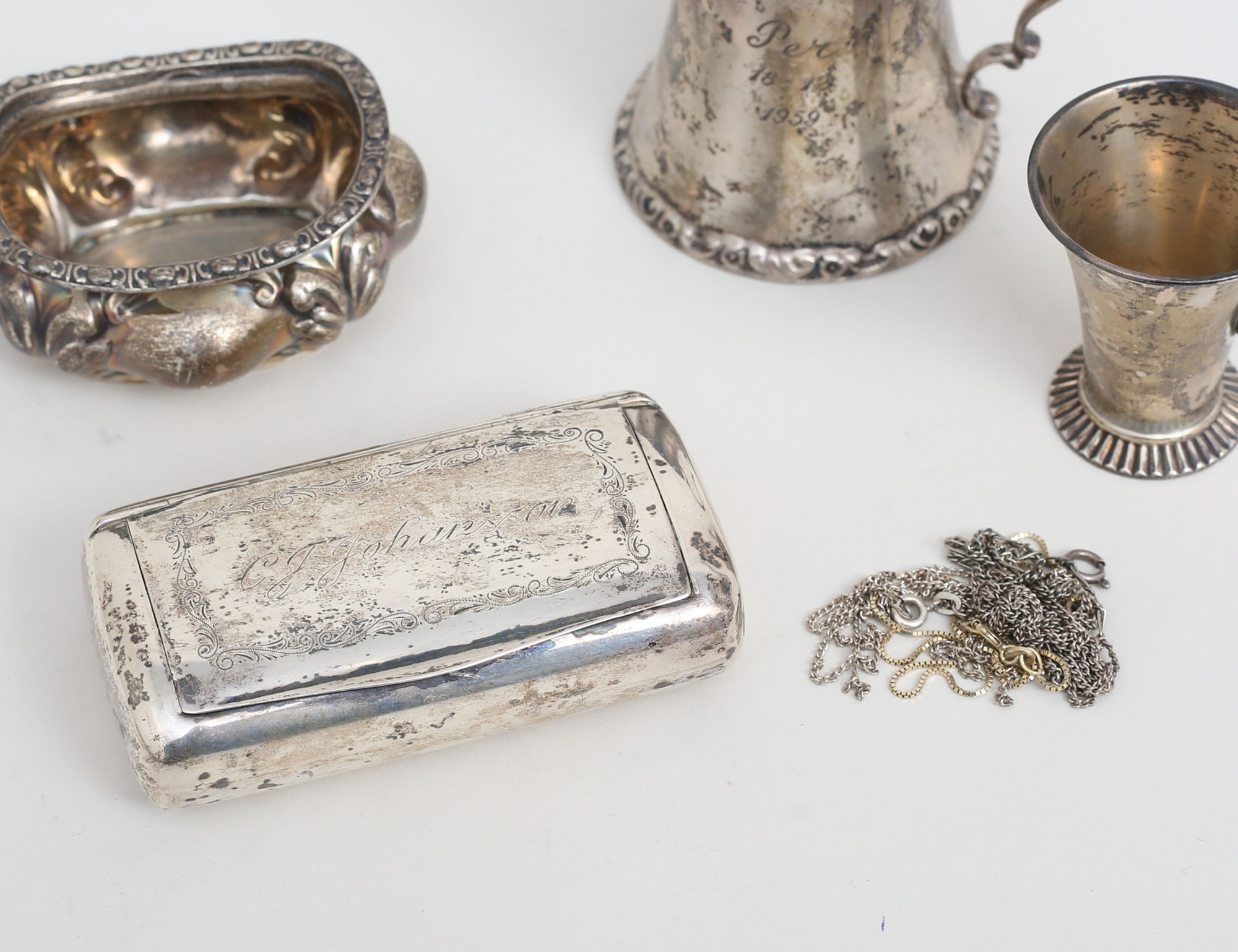bägare Stockholmsutställningen 1897, K. Andersson Stockholm, höjd 5, bägare med hänkel Birmingham England 1905, höjd 7 (inskription), snusdosa 1920-tal, 9x5, saltkar Birmingham 1903, 7x5,5, halskedjor (defekta) , vikt 236 gram