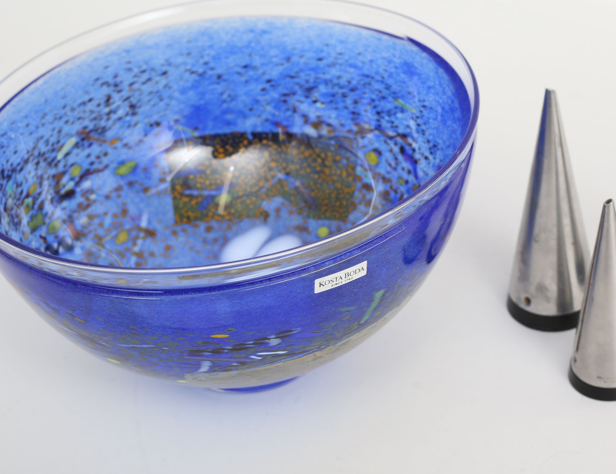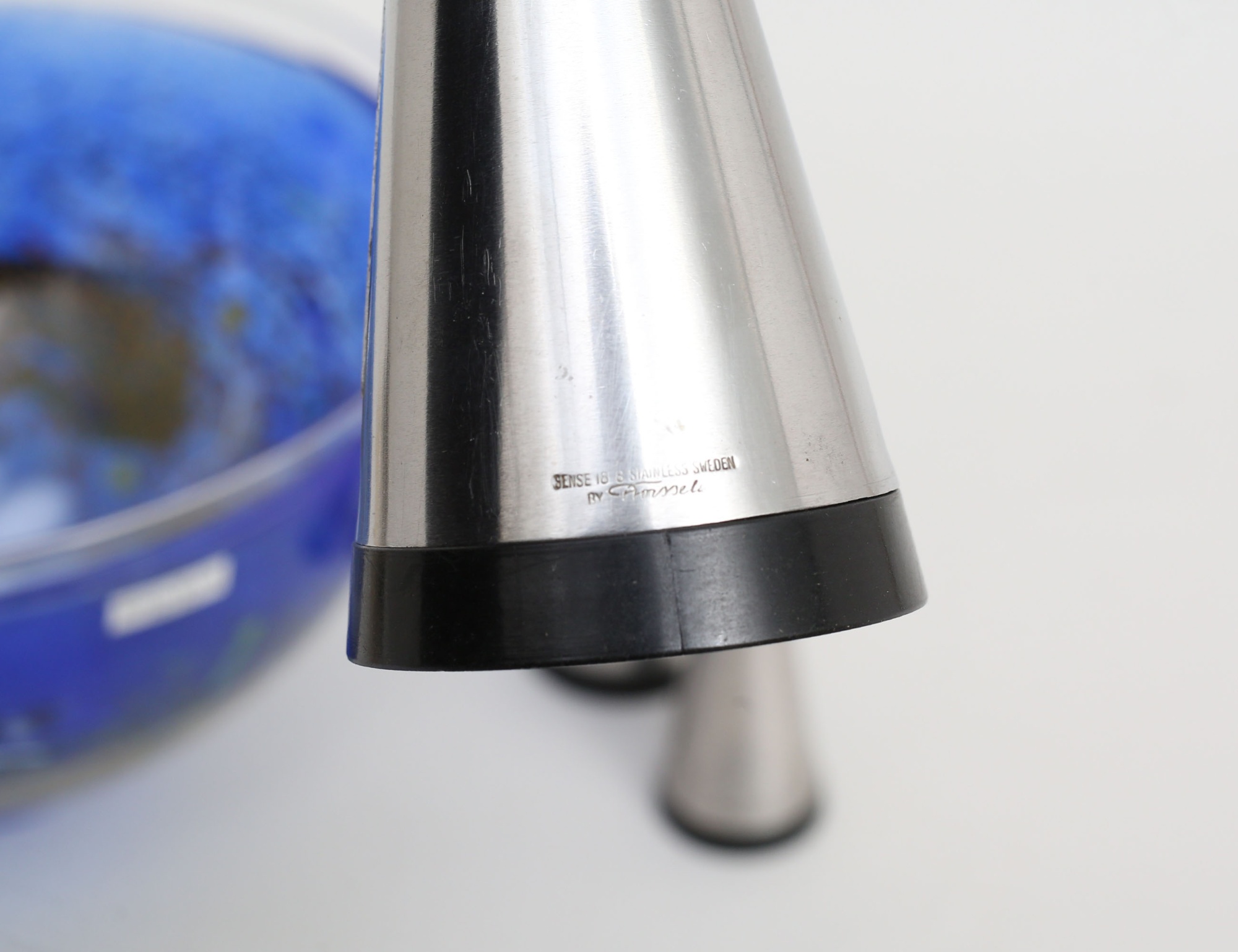 osignerad men etikettmärkt Kosta Boda, höjd 12,5, diameter 21, 3 ströare Pierre Forsell Gense, rostfritt stål, formgavs 1955, höjd 9-15 (4)
