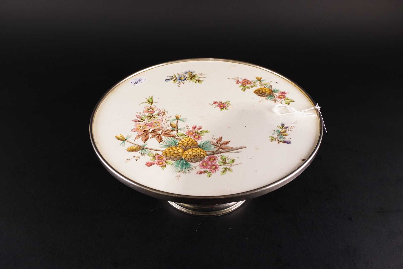 TÅRTFAT 1900 talets första hälft . Porslin/vitmetall. D:30,5cm. (bruksslitage)