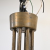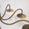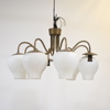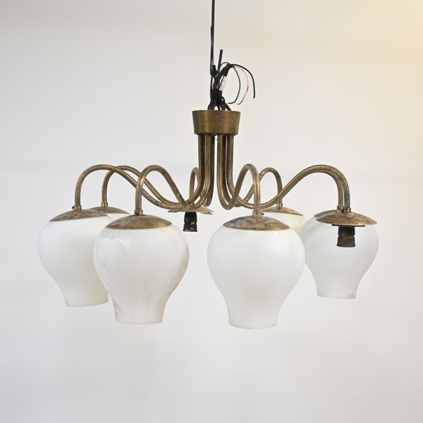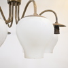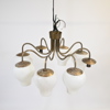 Höjd 44, diameter 85 cm. Mattpolerad mässing med åtta ljusarmar. Kupor i frostat glas.