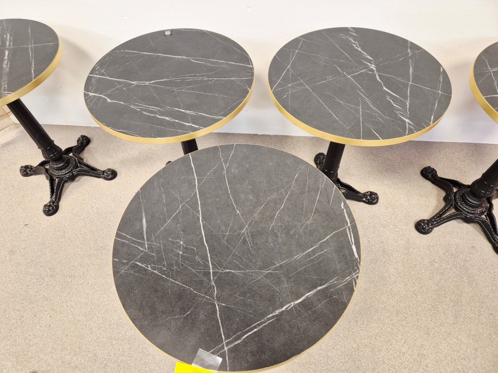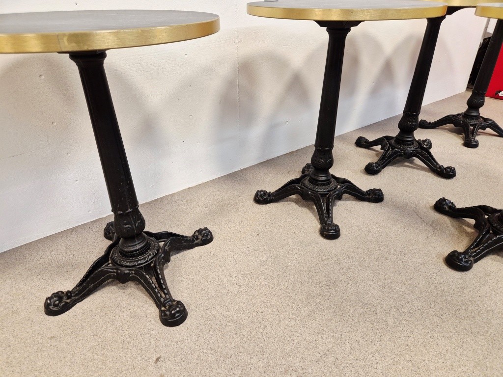 5st Cafébord med gjutjärnsfotHöjd: 75cmØ: 60cmAnmärkning: 4st fötter som skruvas in under tassarna saknas