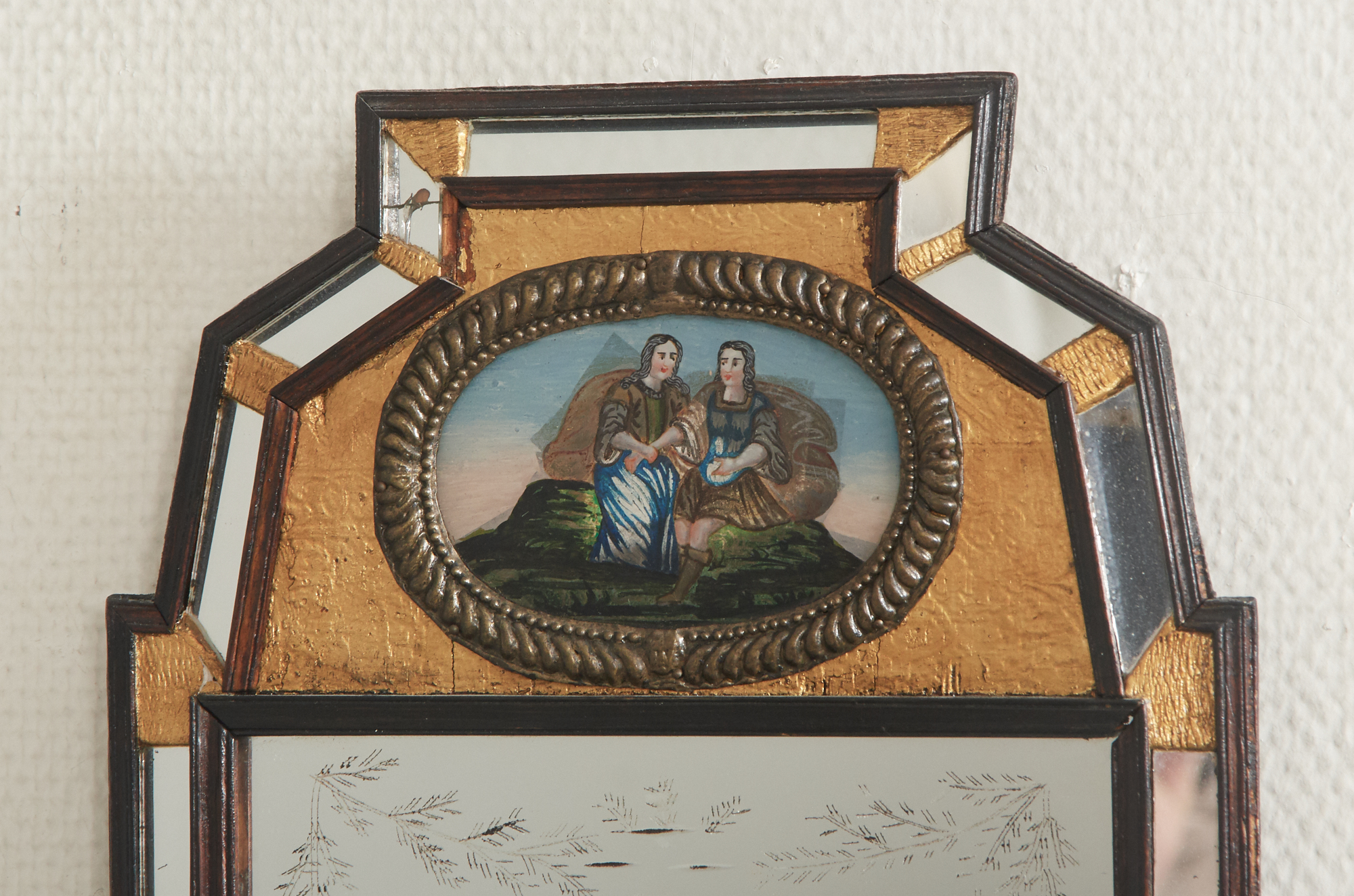 Europa 1700-tal, infälld glasmålning, graverad spegelglas, 40 x 14 cm, bruksslitage, saknar stöd, spricka i spegelglas
