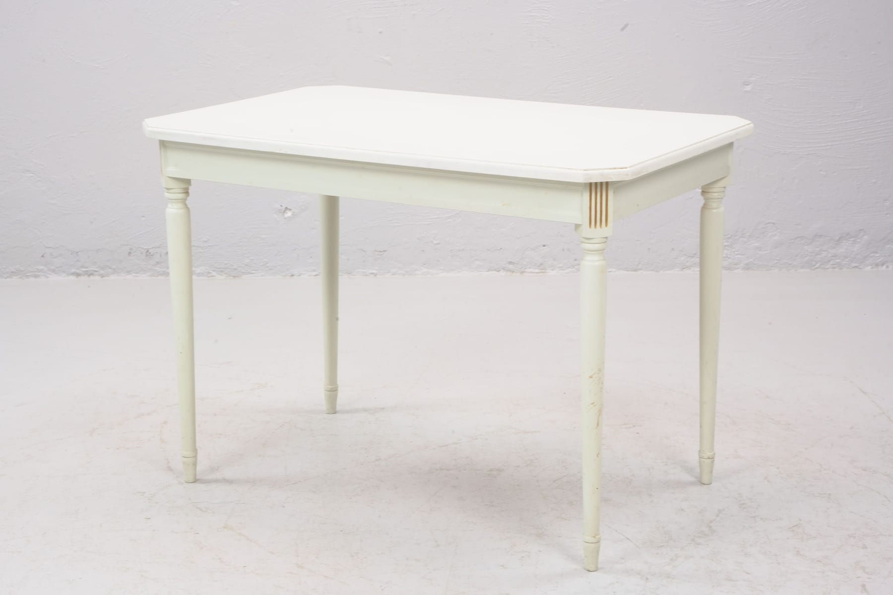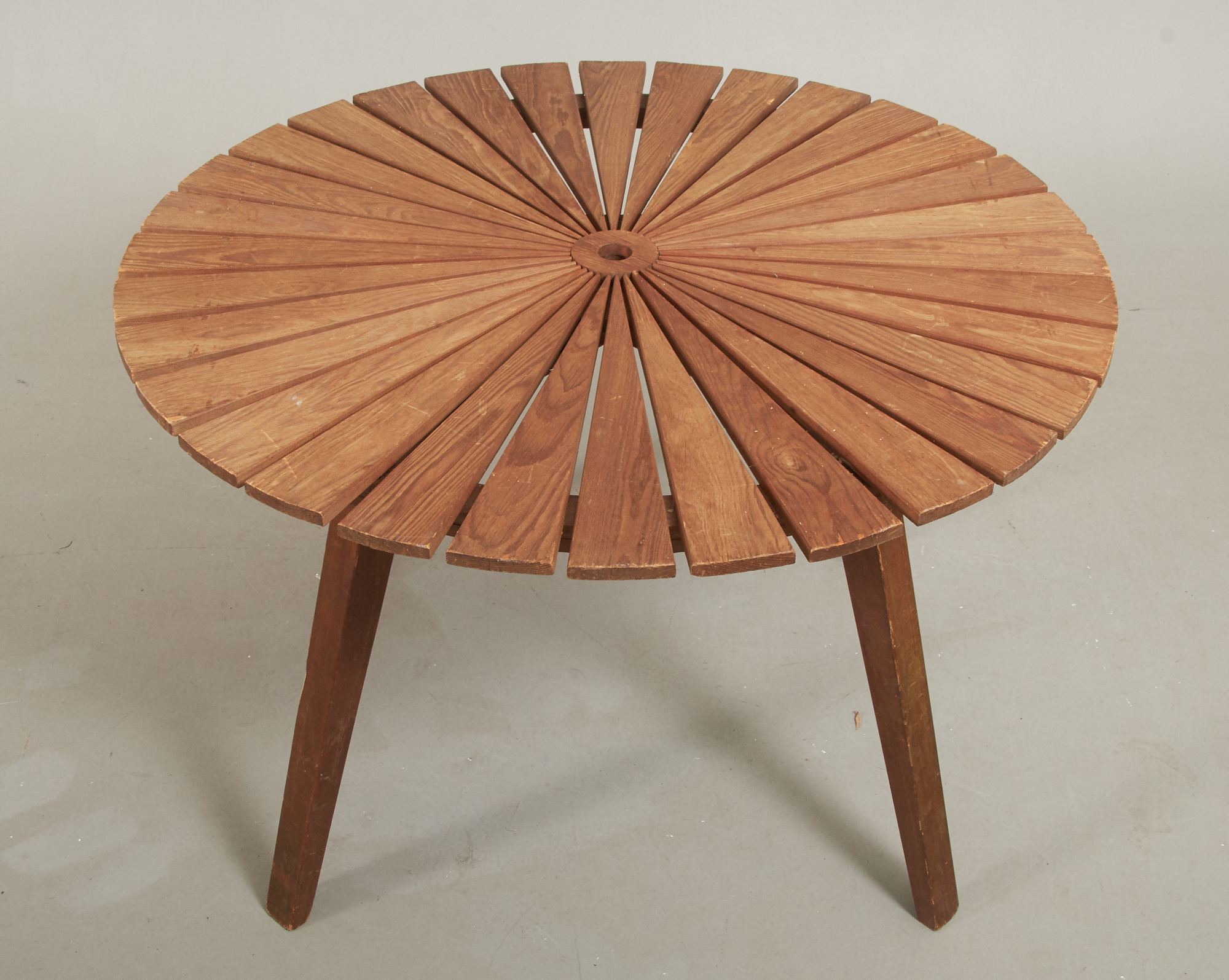 Furu, diam 100 cm, höjd 65 cm, bruksslitage, skavmärken förekommer, saknar en kil till ben, ngt ranglig