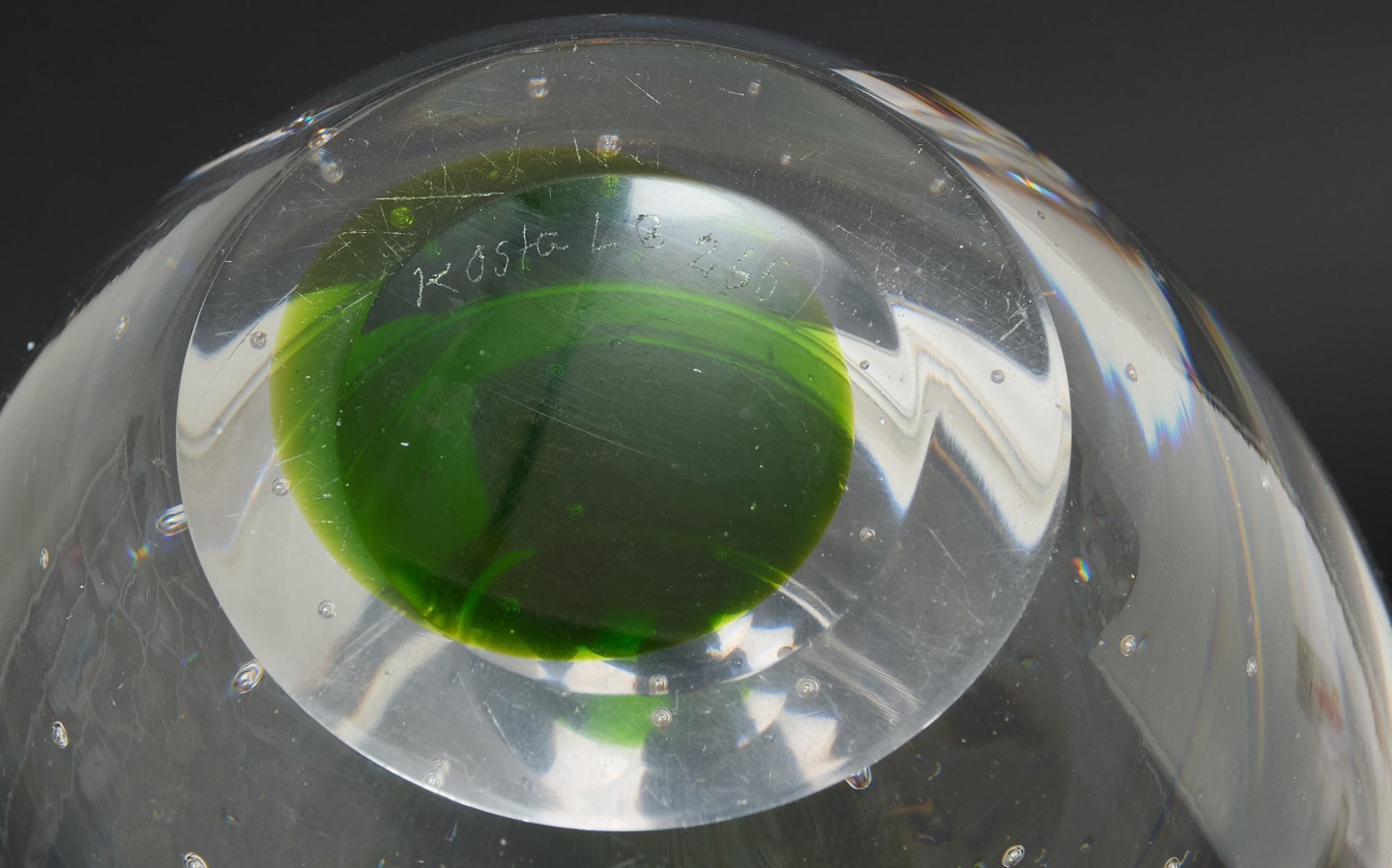 Klarglas med grön botten, dekor av fågel, numrerad, höjd 17 cm, smärre bruksslitage.
