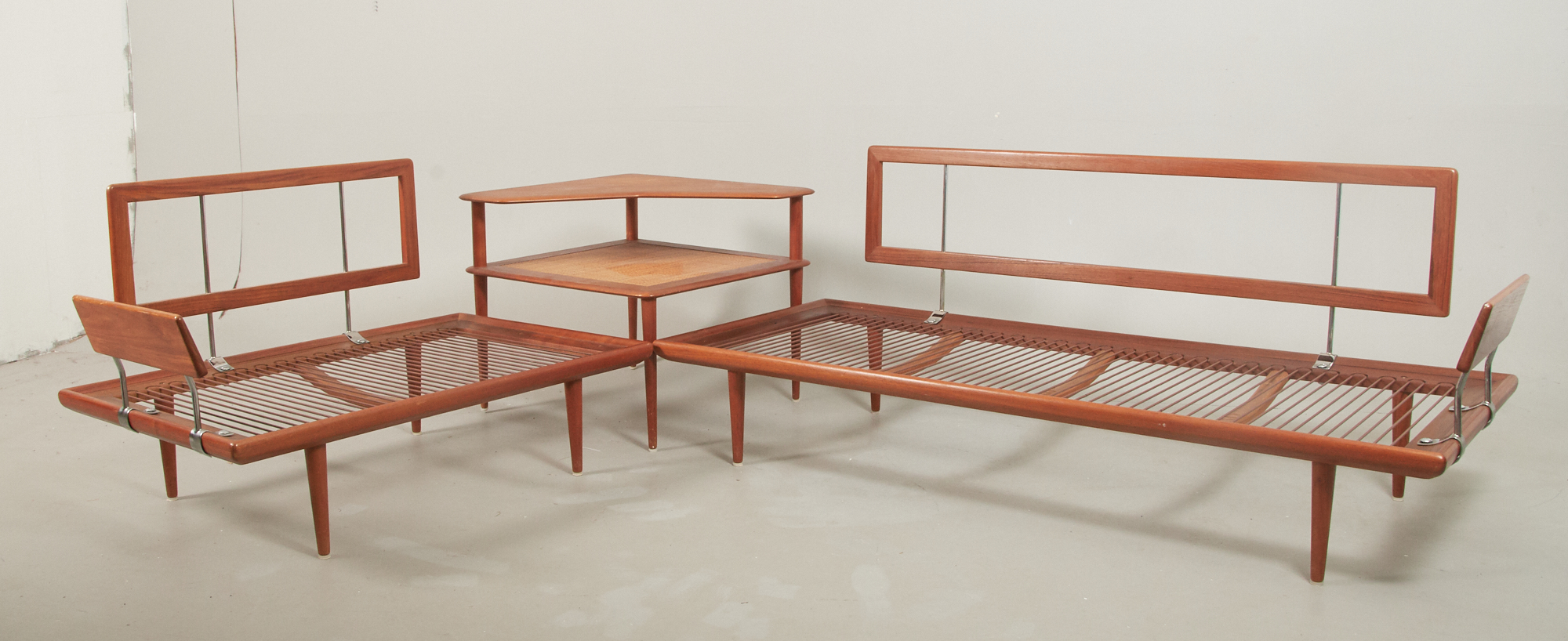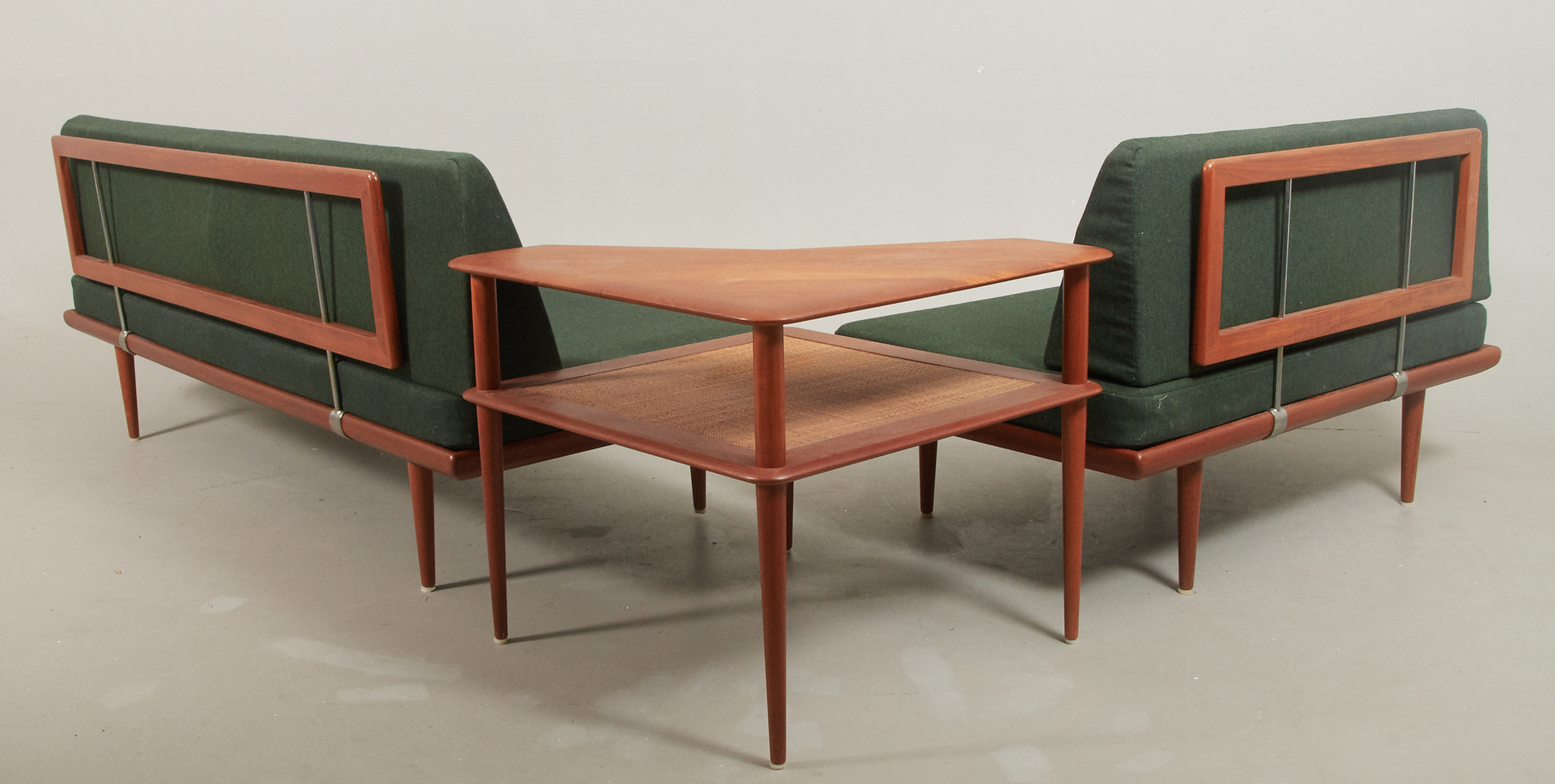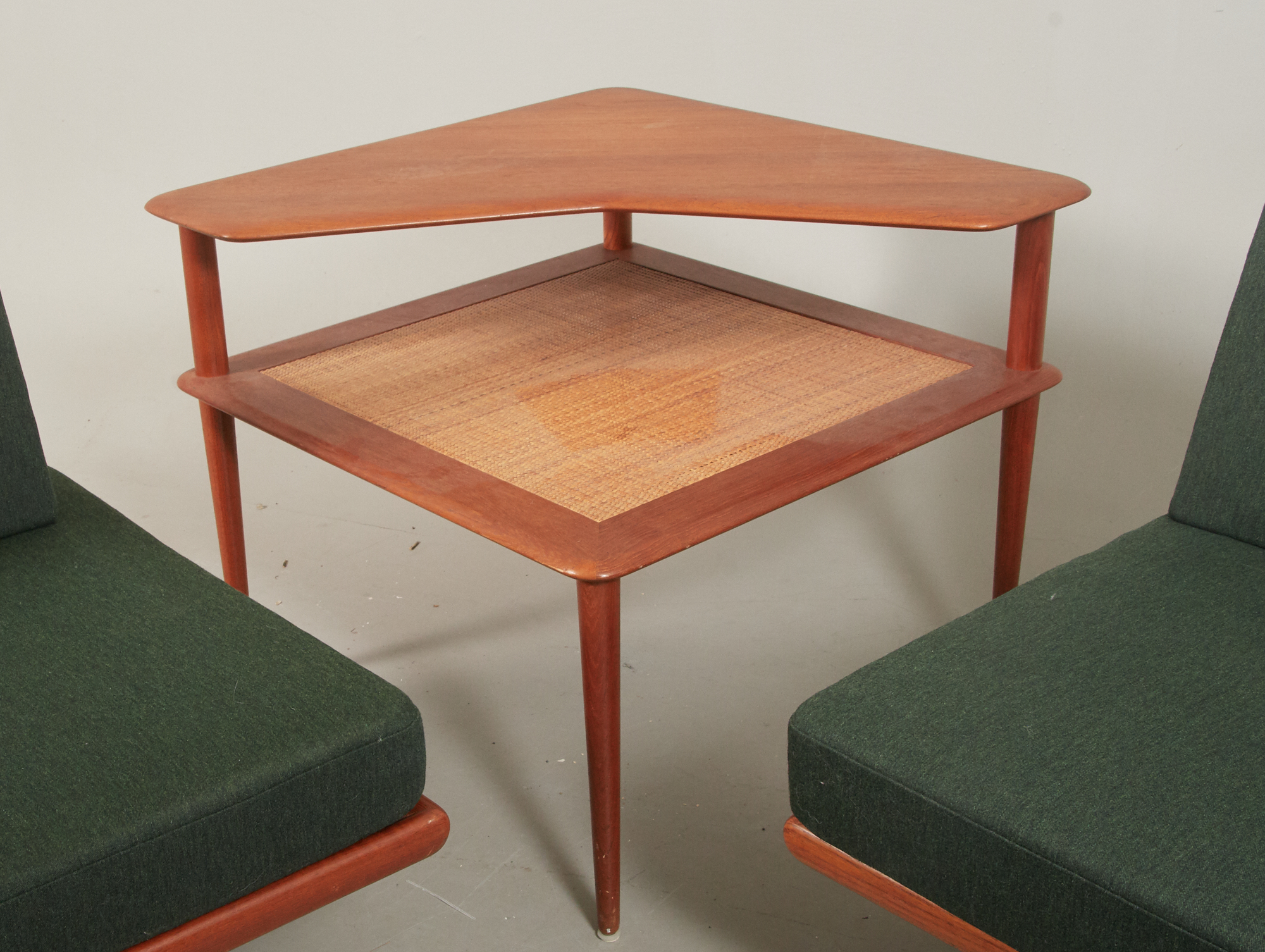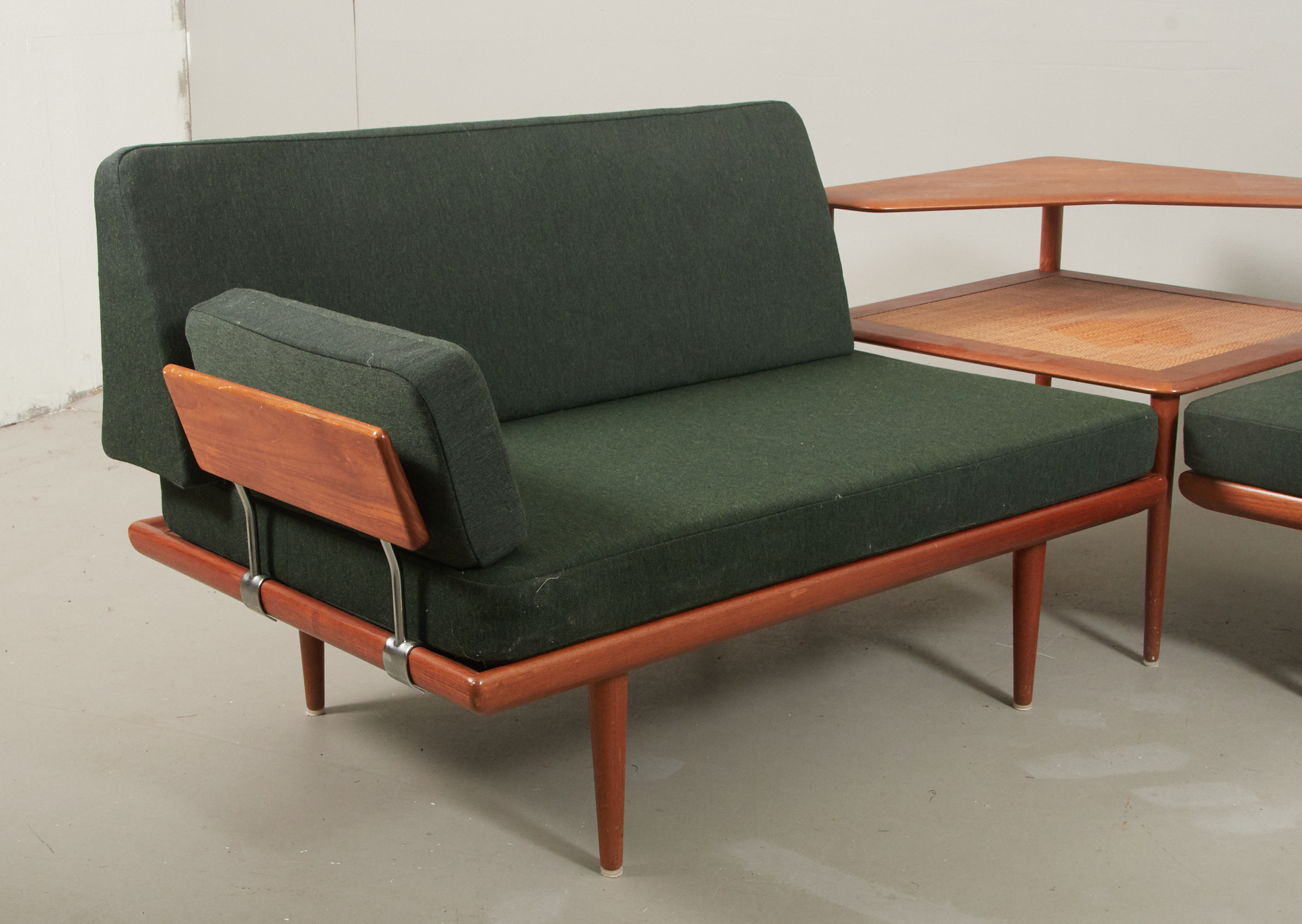 Peter Hvidt och Orla Mölgaard-Nielsen, 1960-tal, teak. Brickmärkt, längd 190 x 122 cm, höjd 76,5 cm, bredd 76 cm. Hörnbord, teak med rotting. Mått 74 x 74 cm, höjd 64 cm. Fint skick, stoppning lite trött.