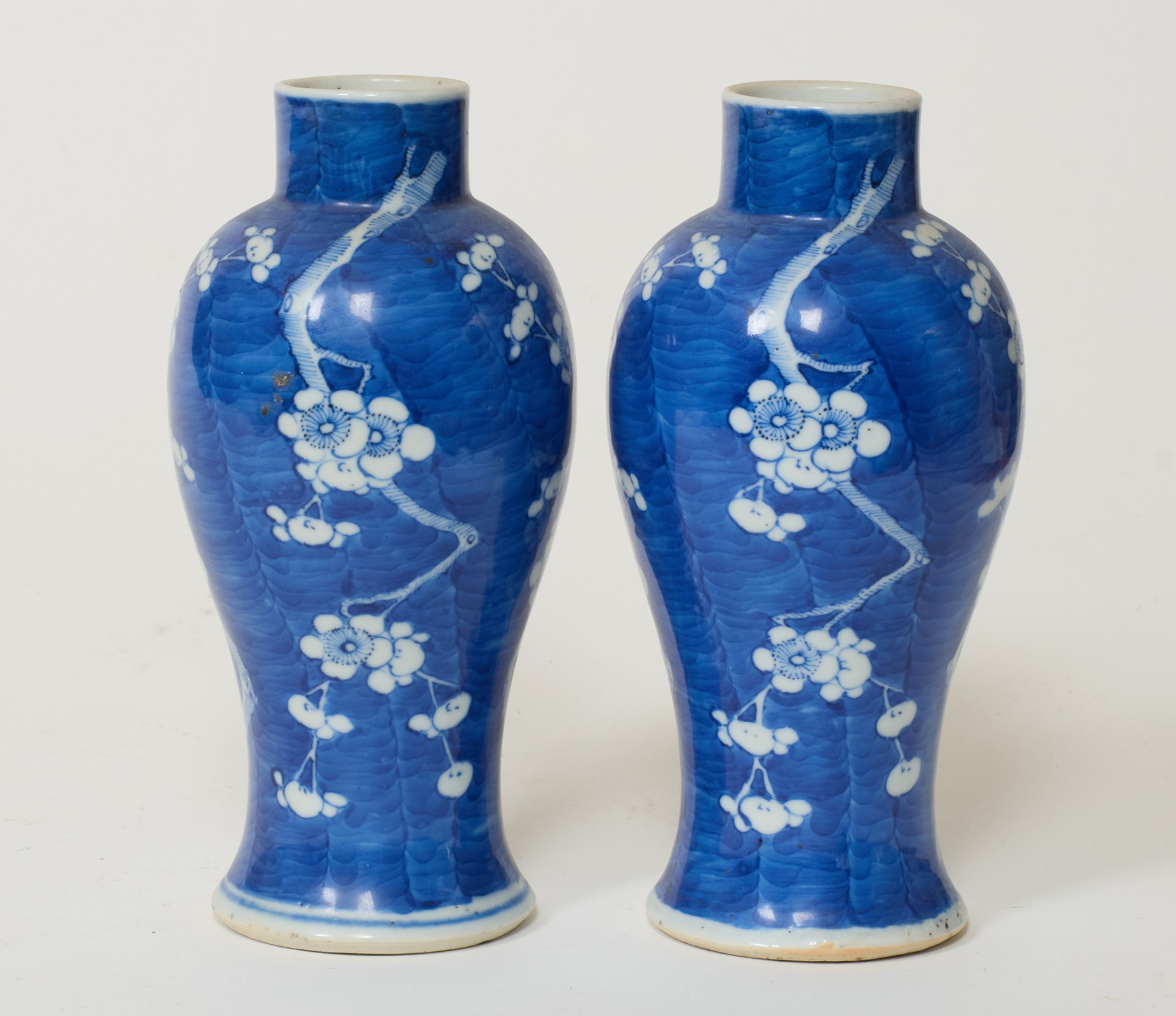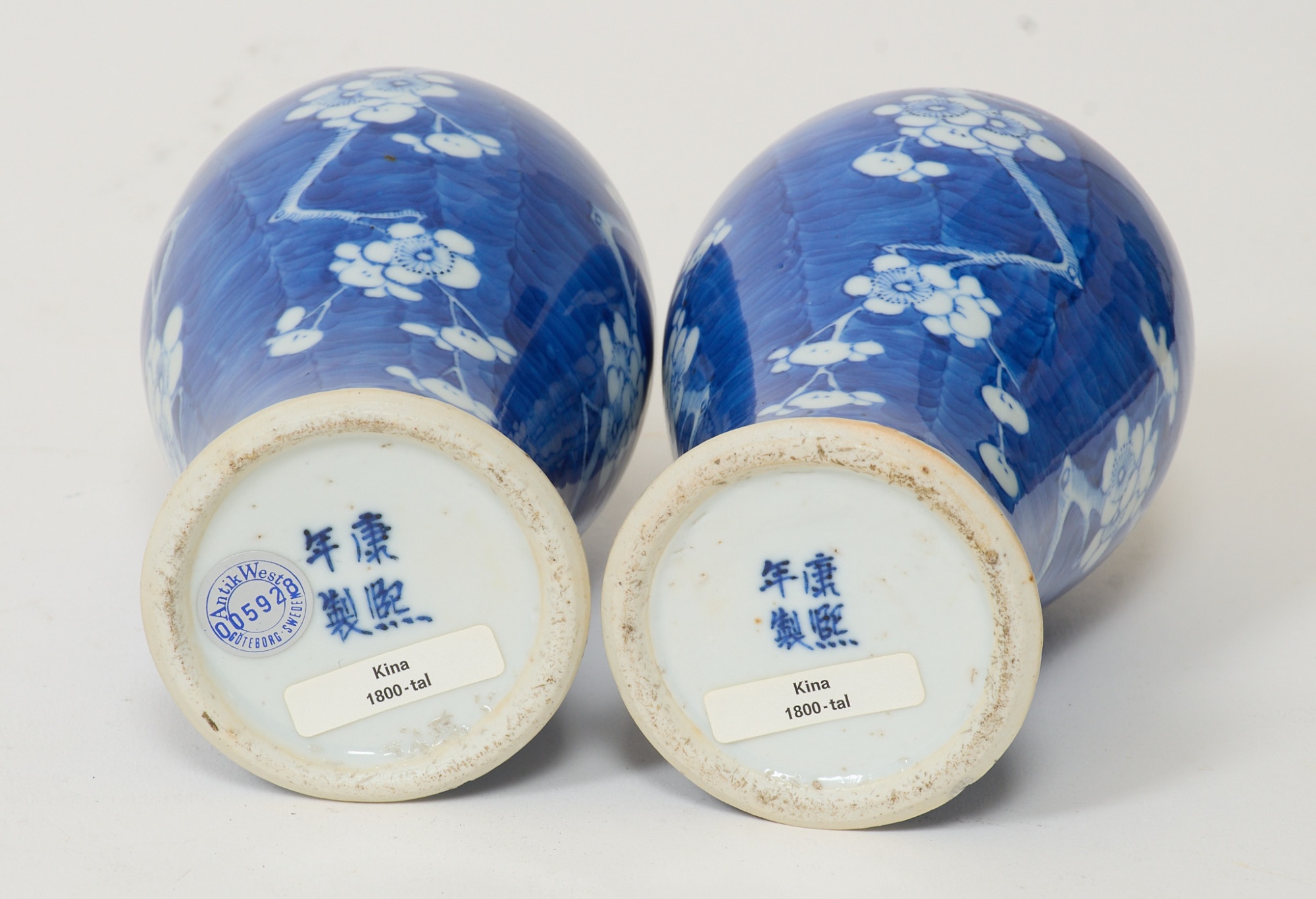 Dekor av blommor i underglasyrblått, höjd 18 cm. Liten nagg i fotring på en av dem.