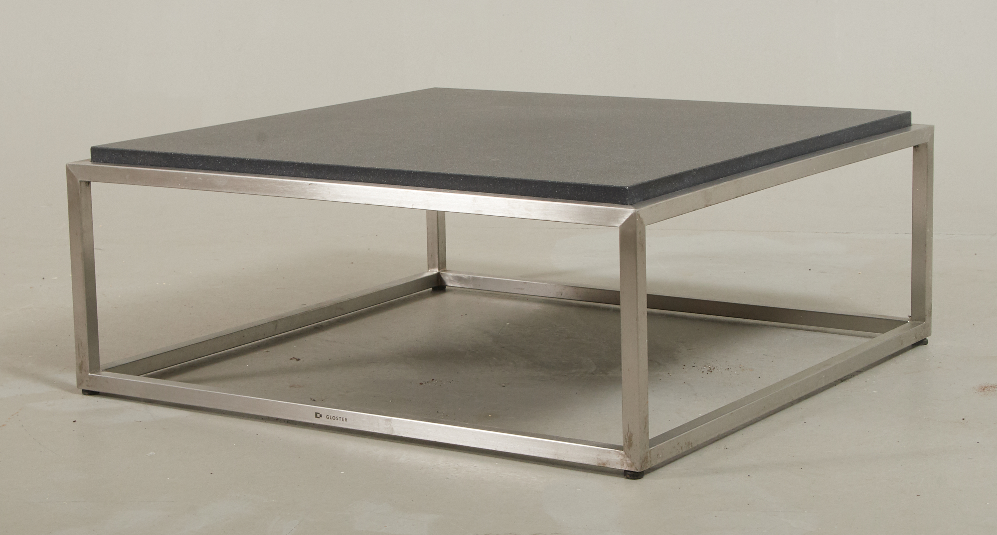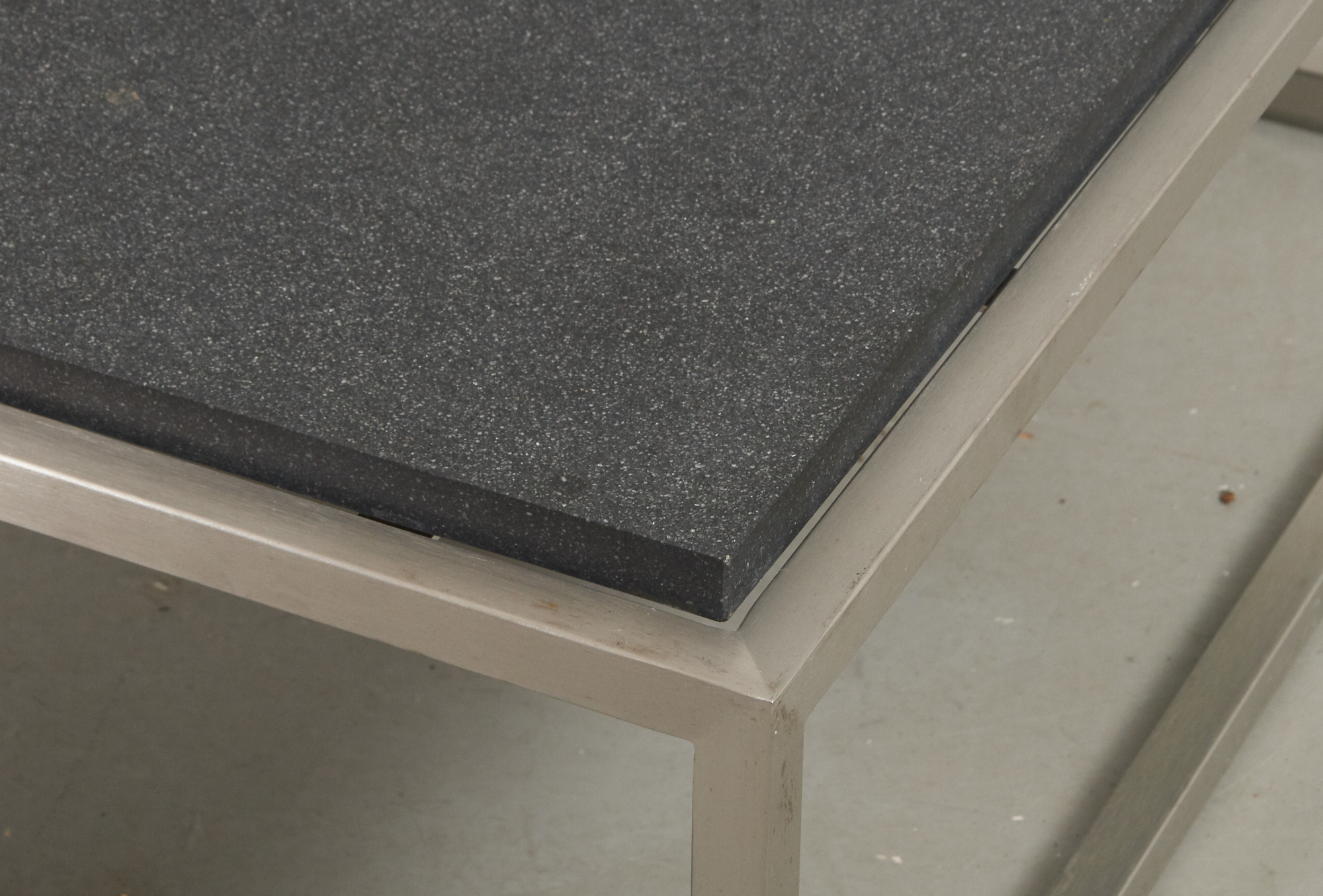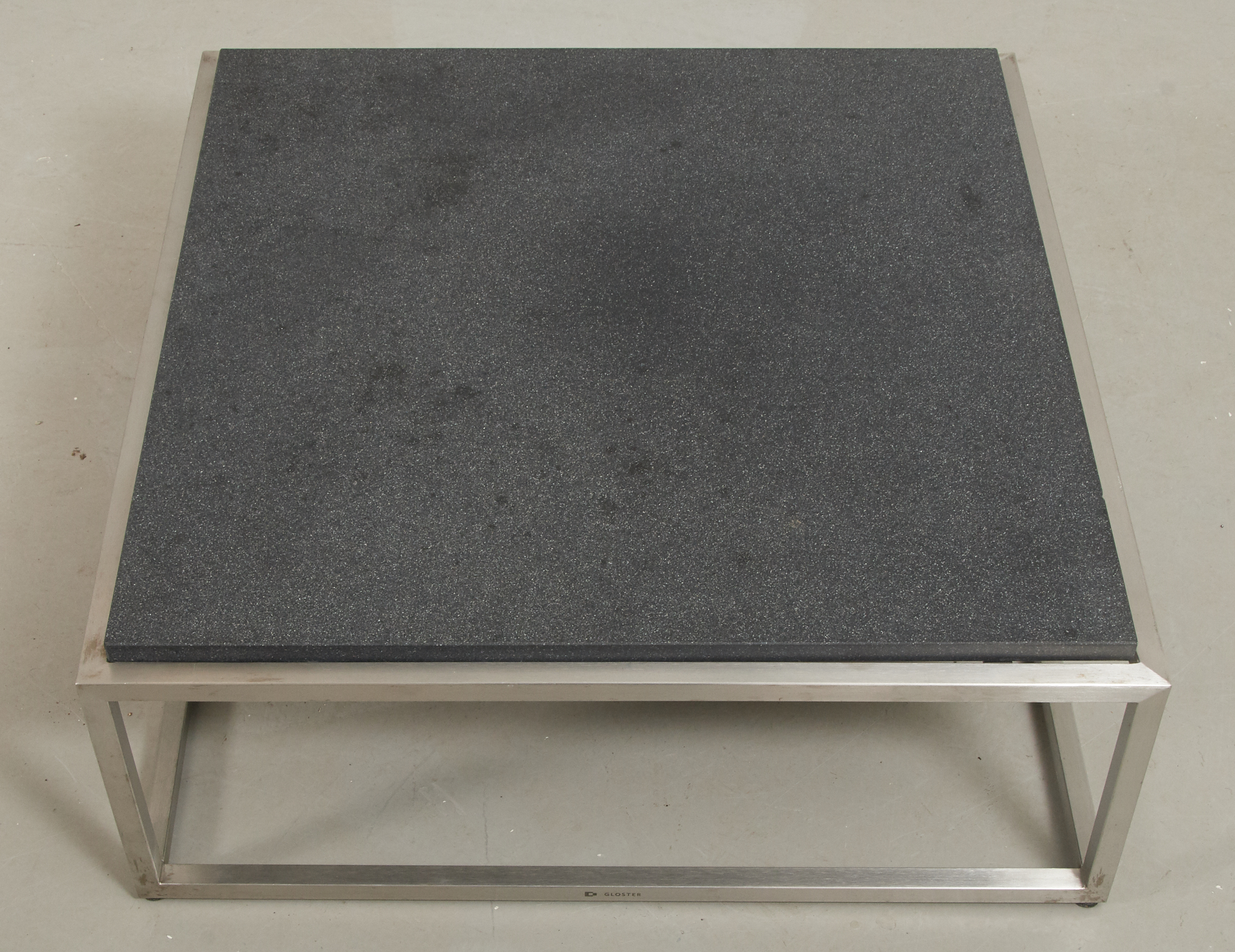 Nyare tillverkning, underrede i rostfritt stål, keramisk skiva 75 x 75 cm, höjd 30 cm, smärre bruksslitage.