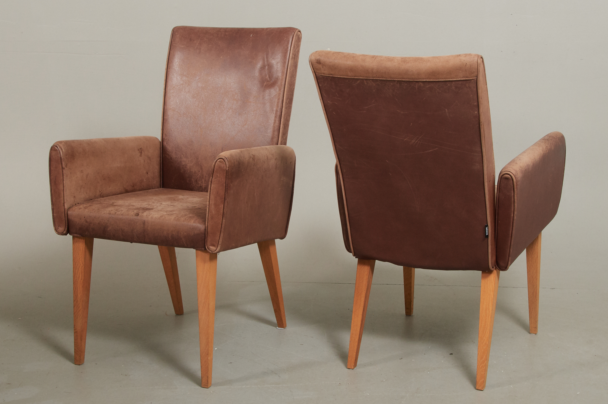 5 st, stomme i ek, läderklädd sits och rygg, etikettmärkta, ställbar rygg, läder med fläckar och slitage.