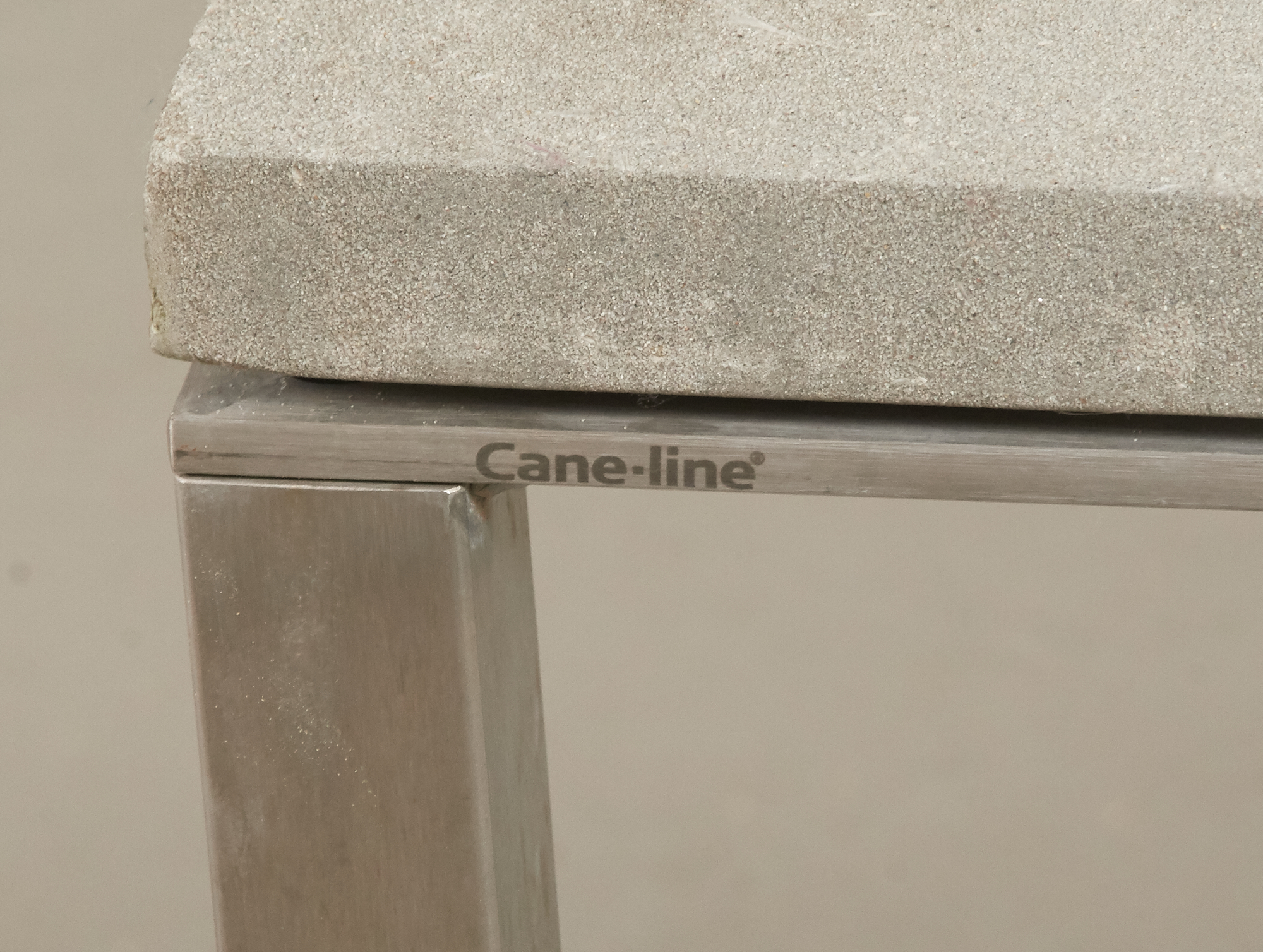 Nyare tillverkning, stomme i aluminium, skiva i keramik/betong, 100 x 100 cm, höjd 74 cm, smärre bruksslitage.