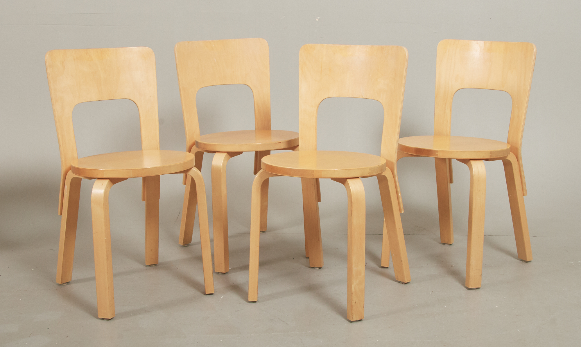 4 st, modell 66, björk, 4 st skinndynor medföljer. Bruksslitage.