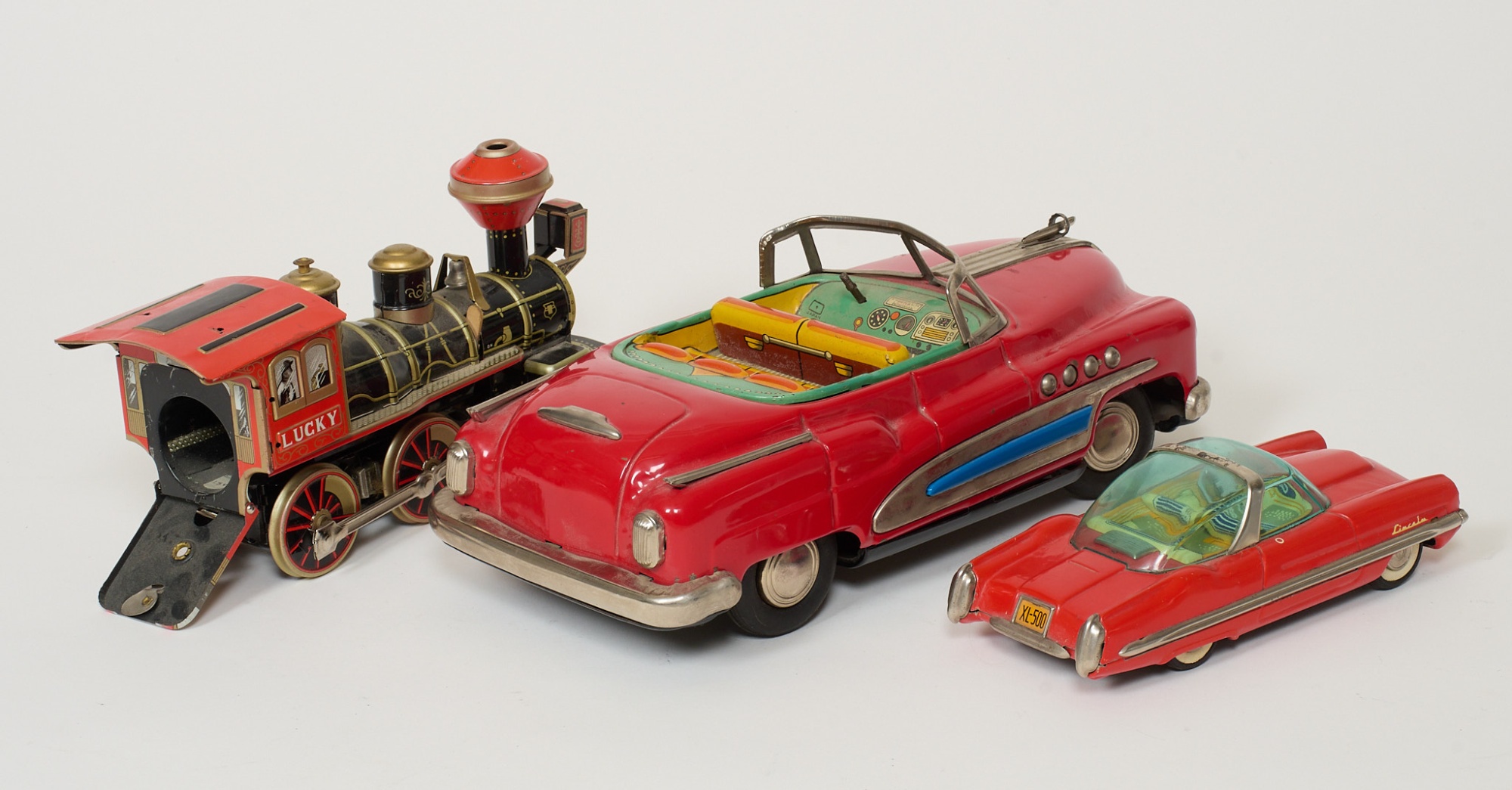 3 st japanska plåtleksaker. 1 lok, Lincoln, Buick 19-28 cm. Slitage, skador