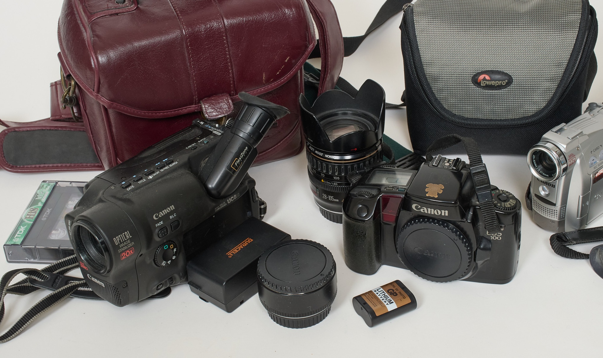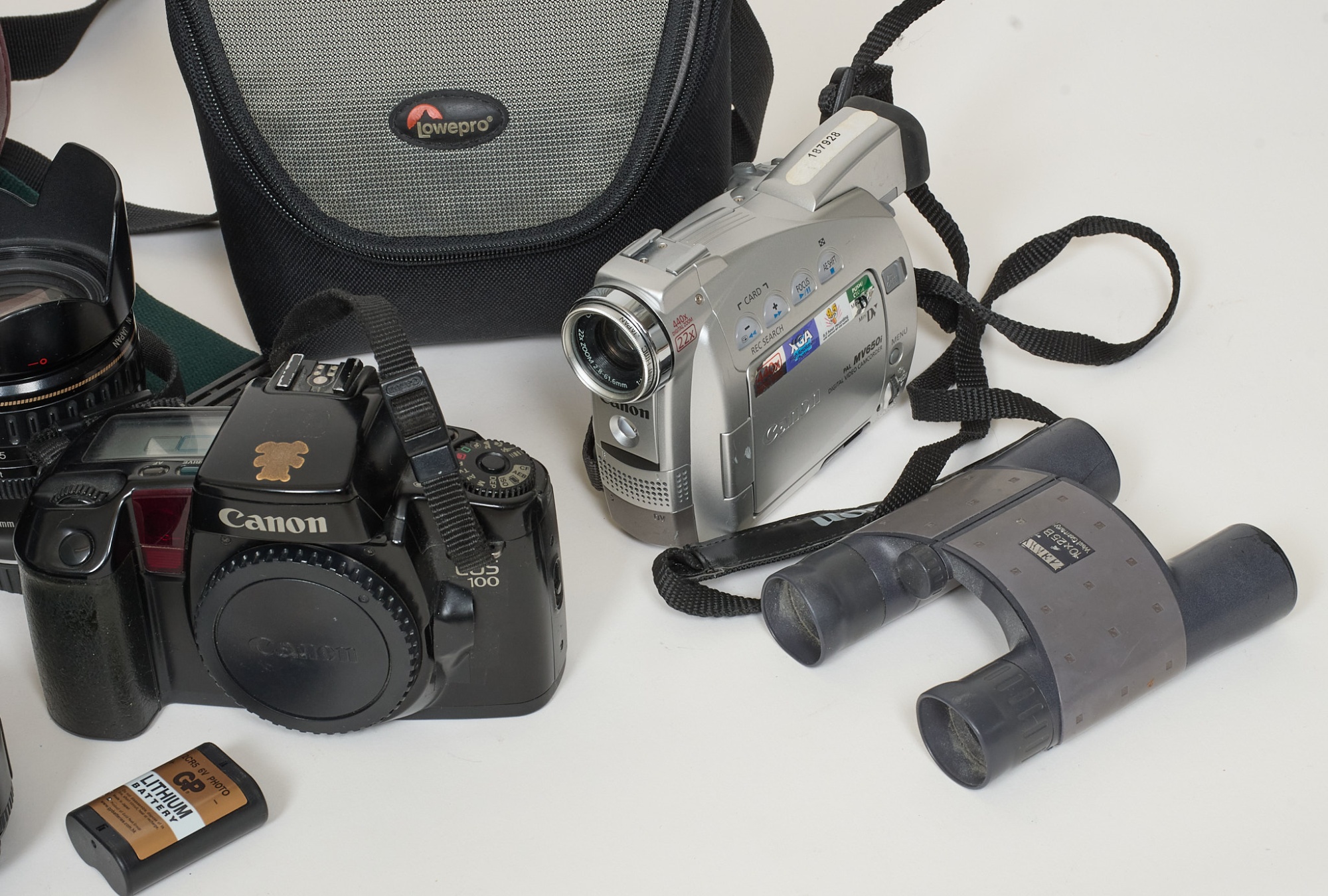 Canon EOS 100. Canon Extension Tube EF25, objektiv 28-105 mm, EW-63. Canon filmkamera Hi 8, Canon filmkamera MV650i. Kikare Zeiss 10 x 25B. Ej funktionstestade.