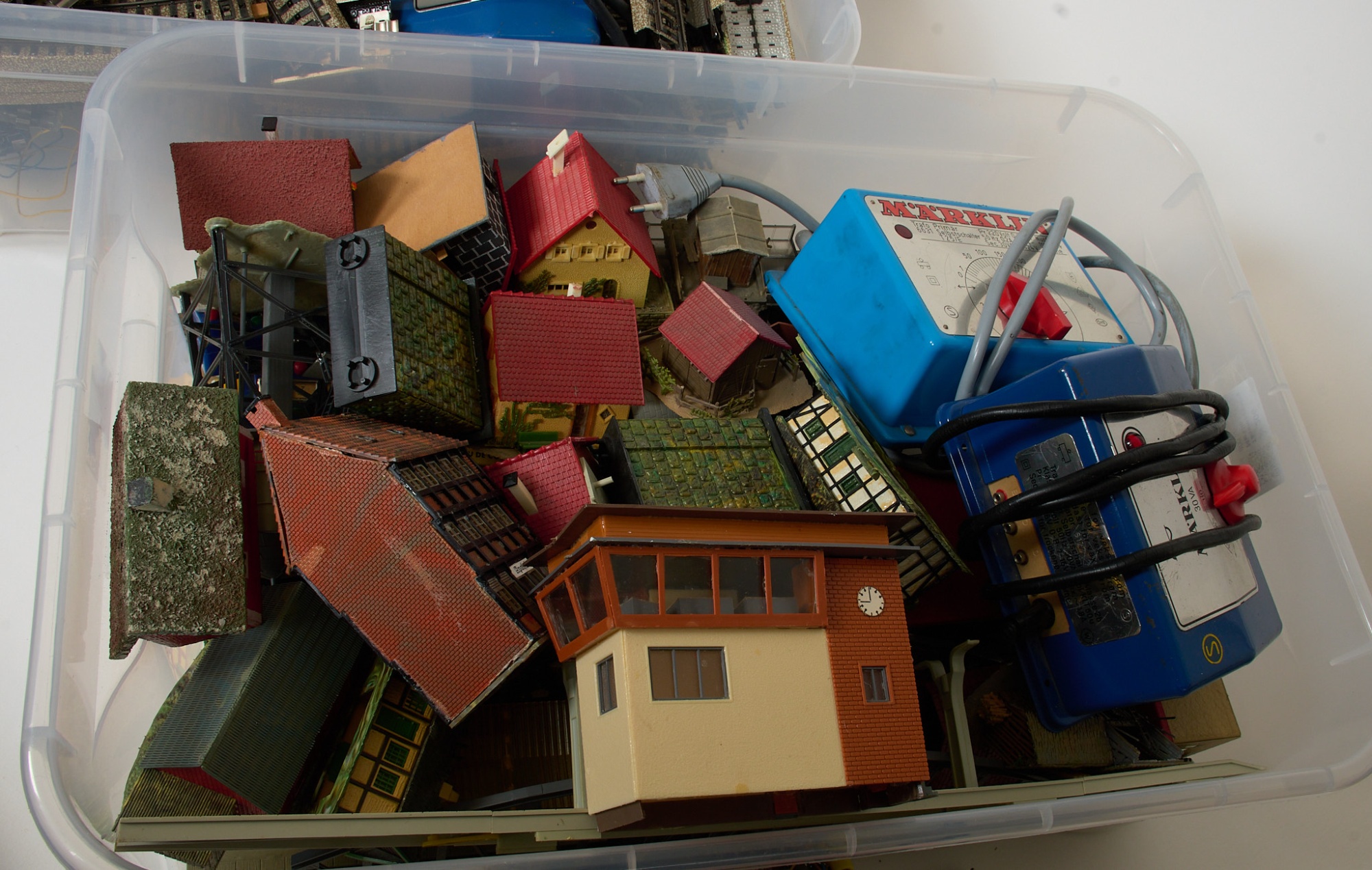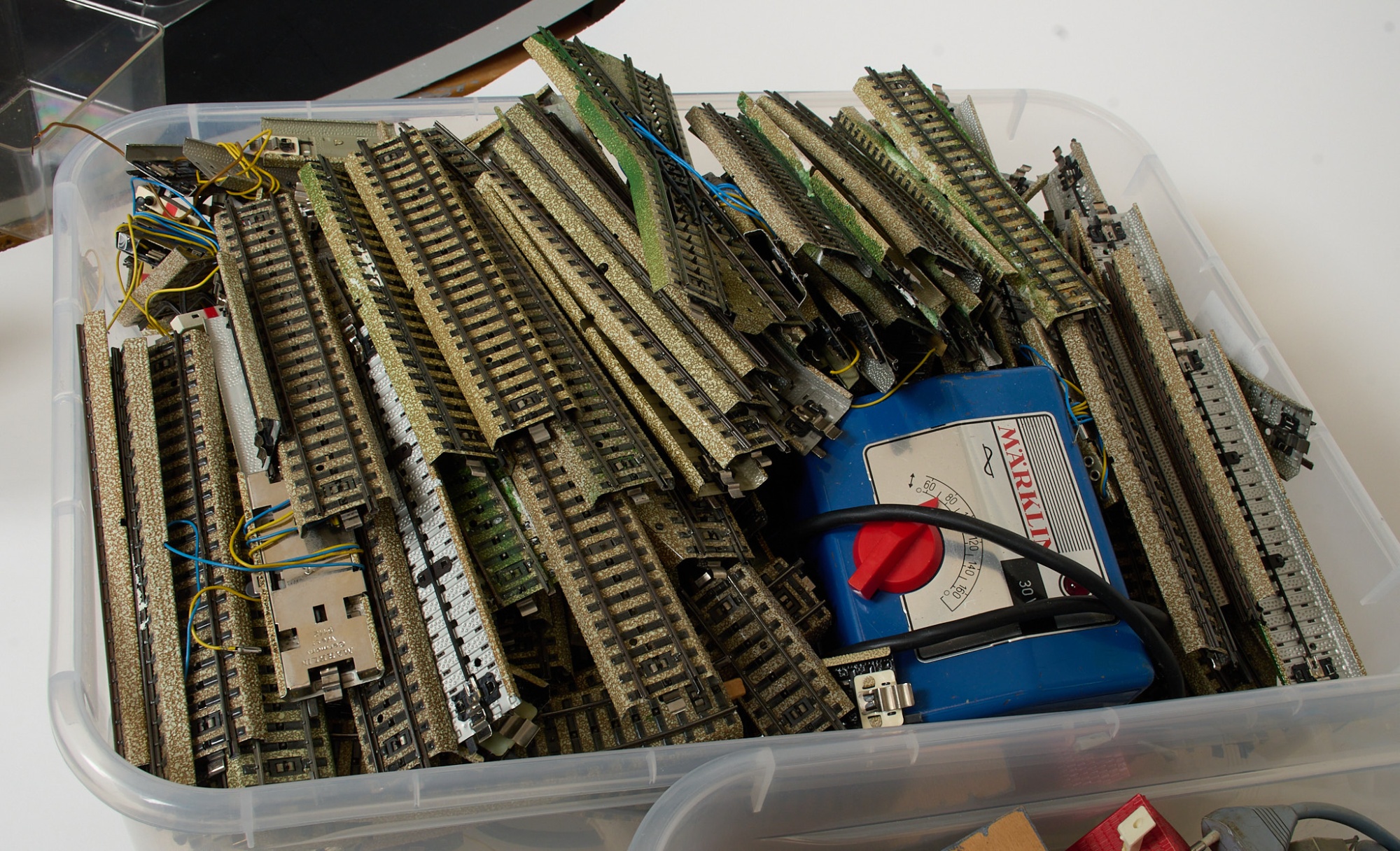 2 lådor, skenor växlar, 3 st trafo, pultar, byggnader, broar, mm. Slitage