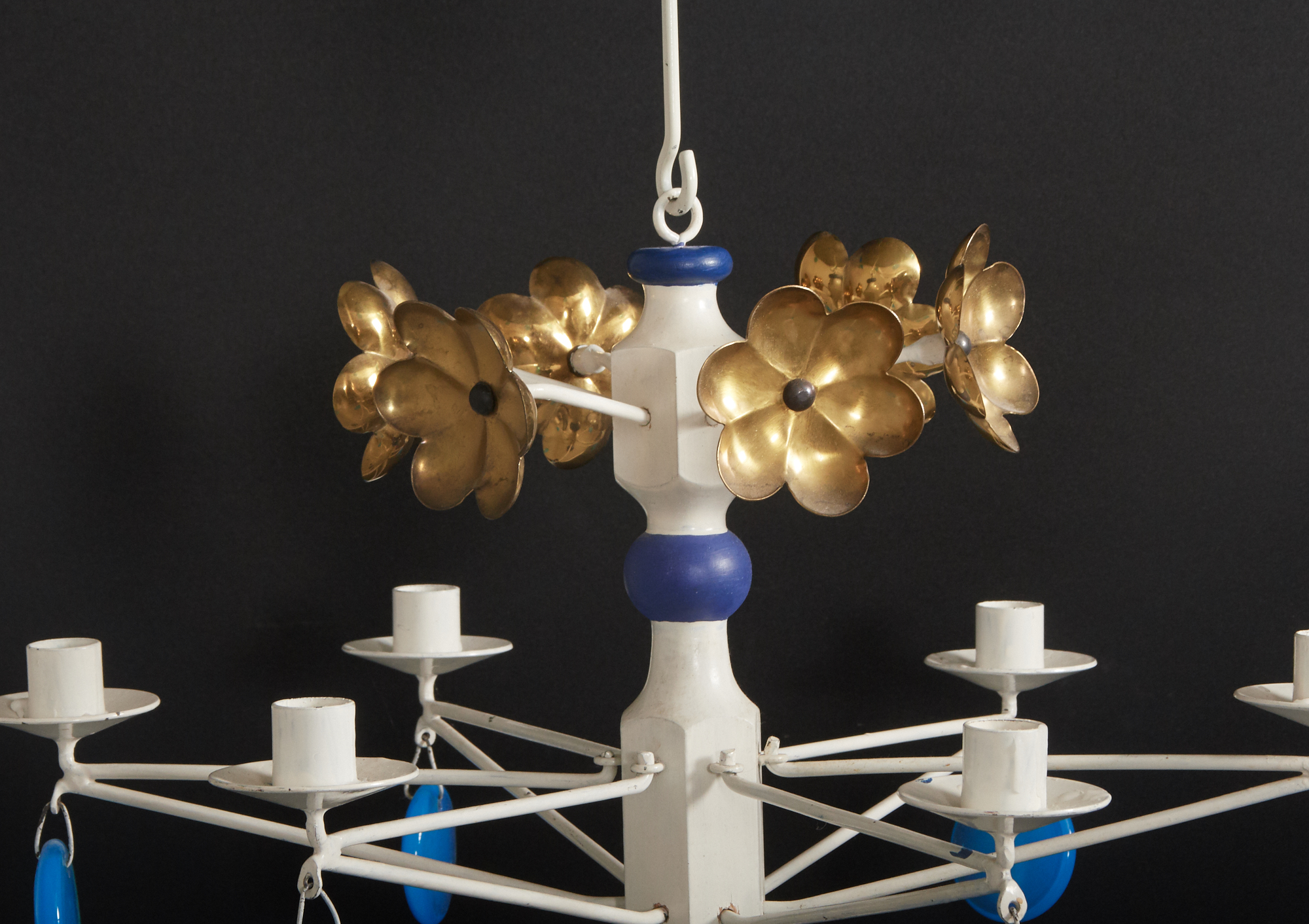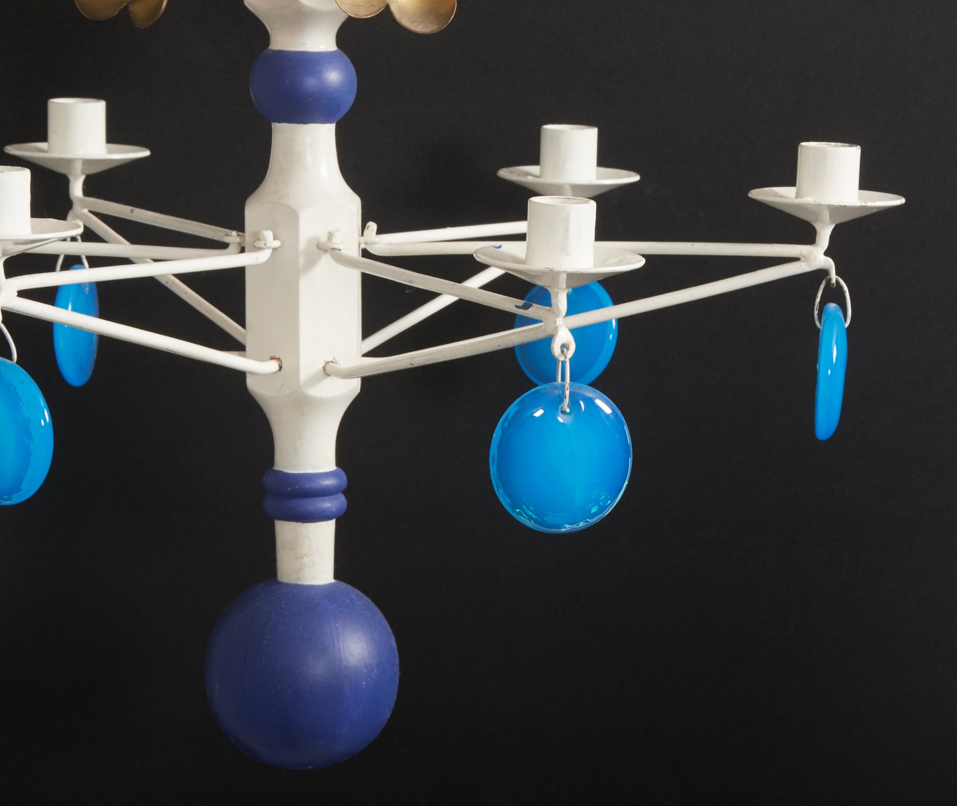 Bemålat trä, metall, samt blåa glasprismor, hållare för 6 st levande ljus, diam. 50 cm, smärre slitage
