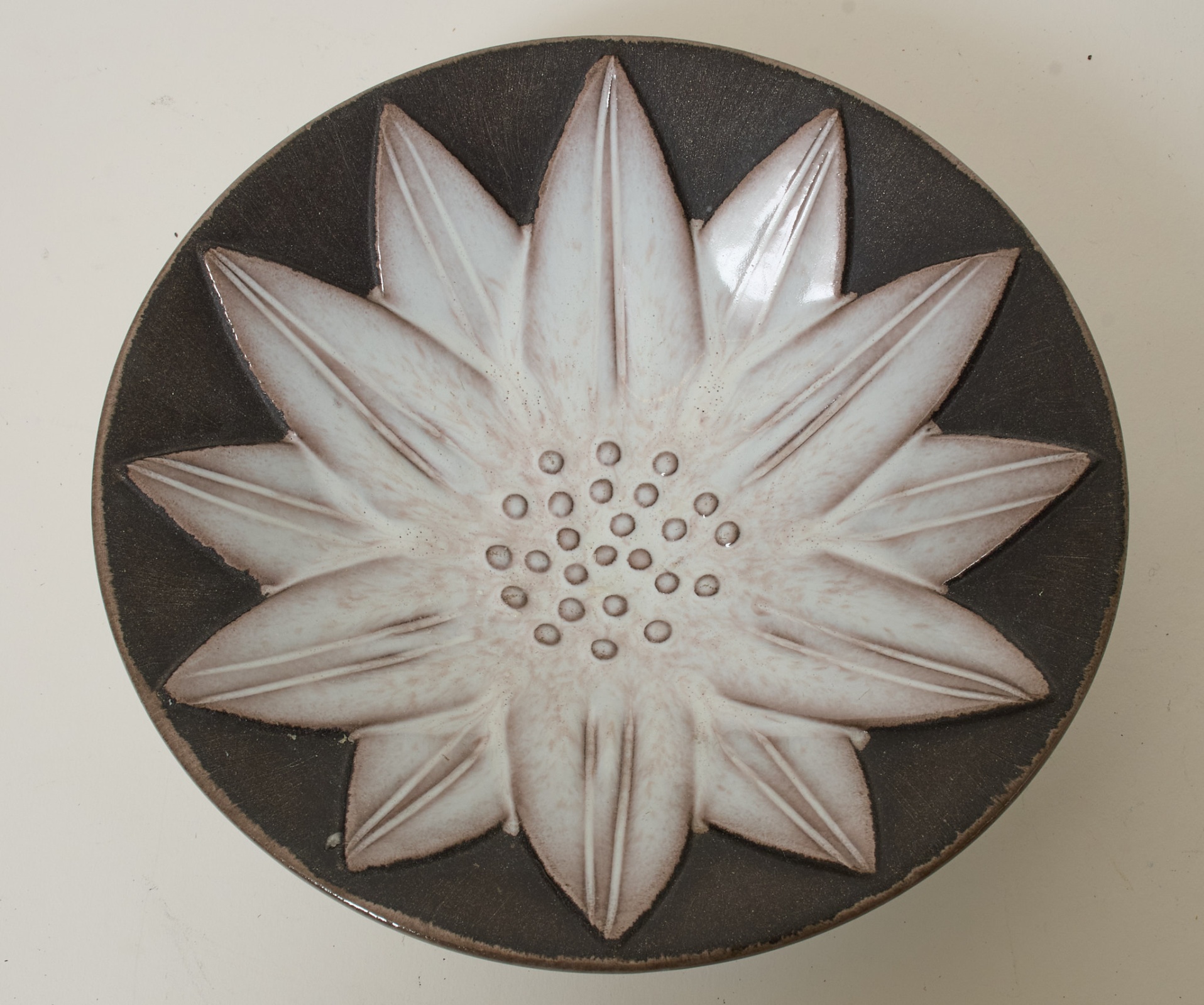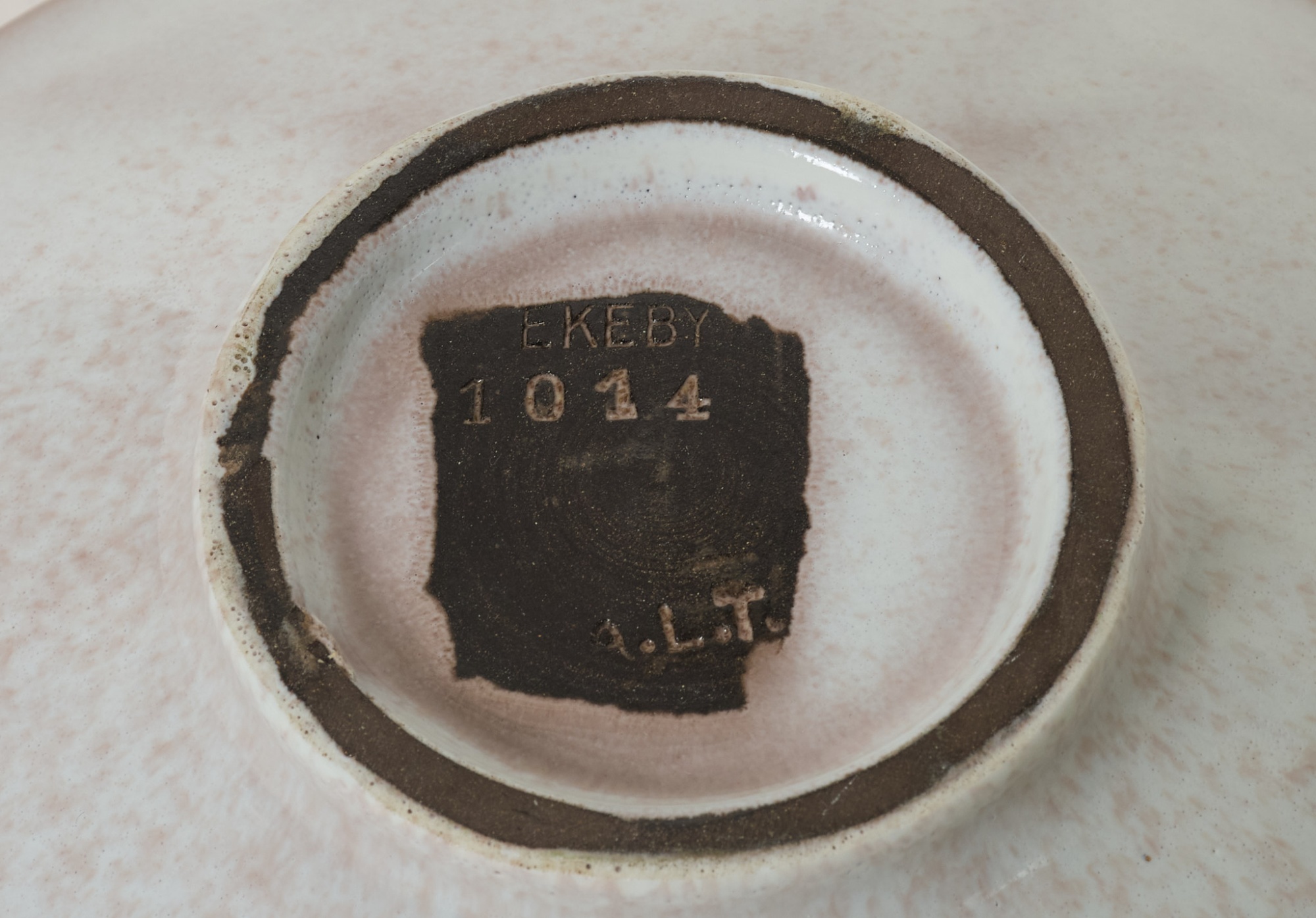 Stämpelsignerat A.L.T Ekeby 1014, diameter 23 cm, höjd 7 cm. Smärre slitage.
