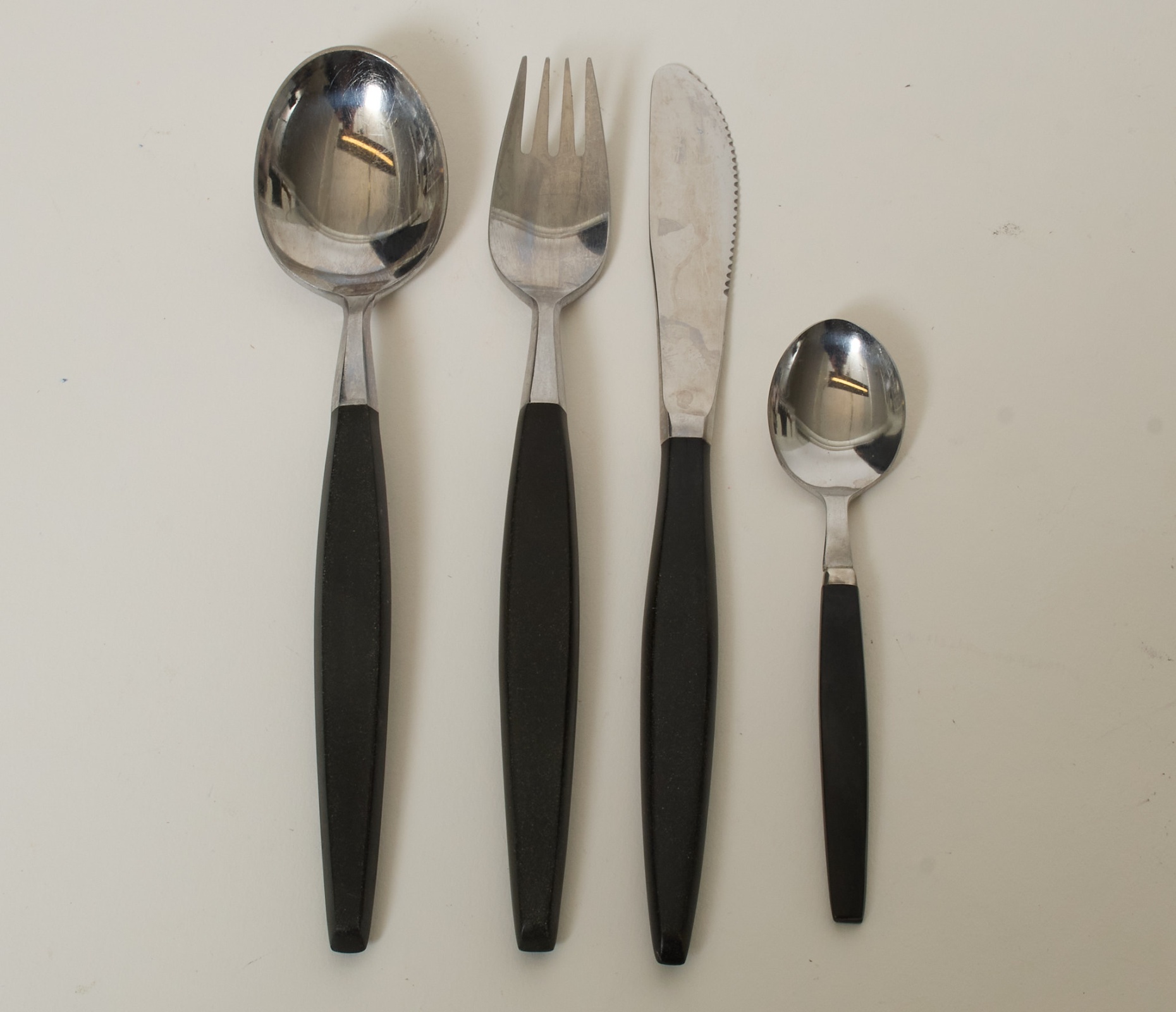 Rostfritt stål, med handtag i bakelit, ca 50 delar, bruksslitage, ett bestick av annan sort.