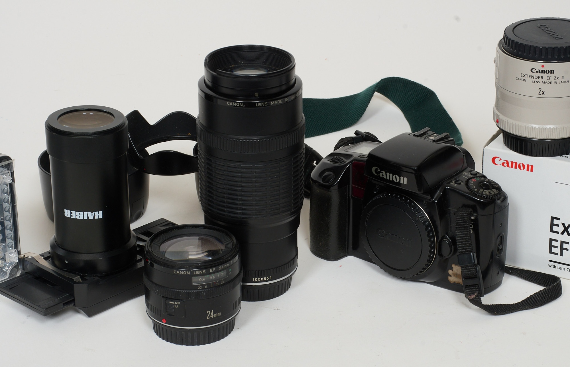 Canon EOS 100, Canon zomm EF 70-120 mm, Canon EF, 24 mm, 1:28, Canon EF 50 mm, Kaiser diaduplikator, Aptur ledlampa motljusskydd.