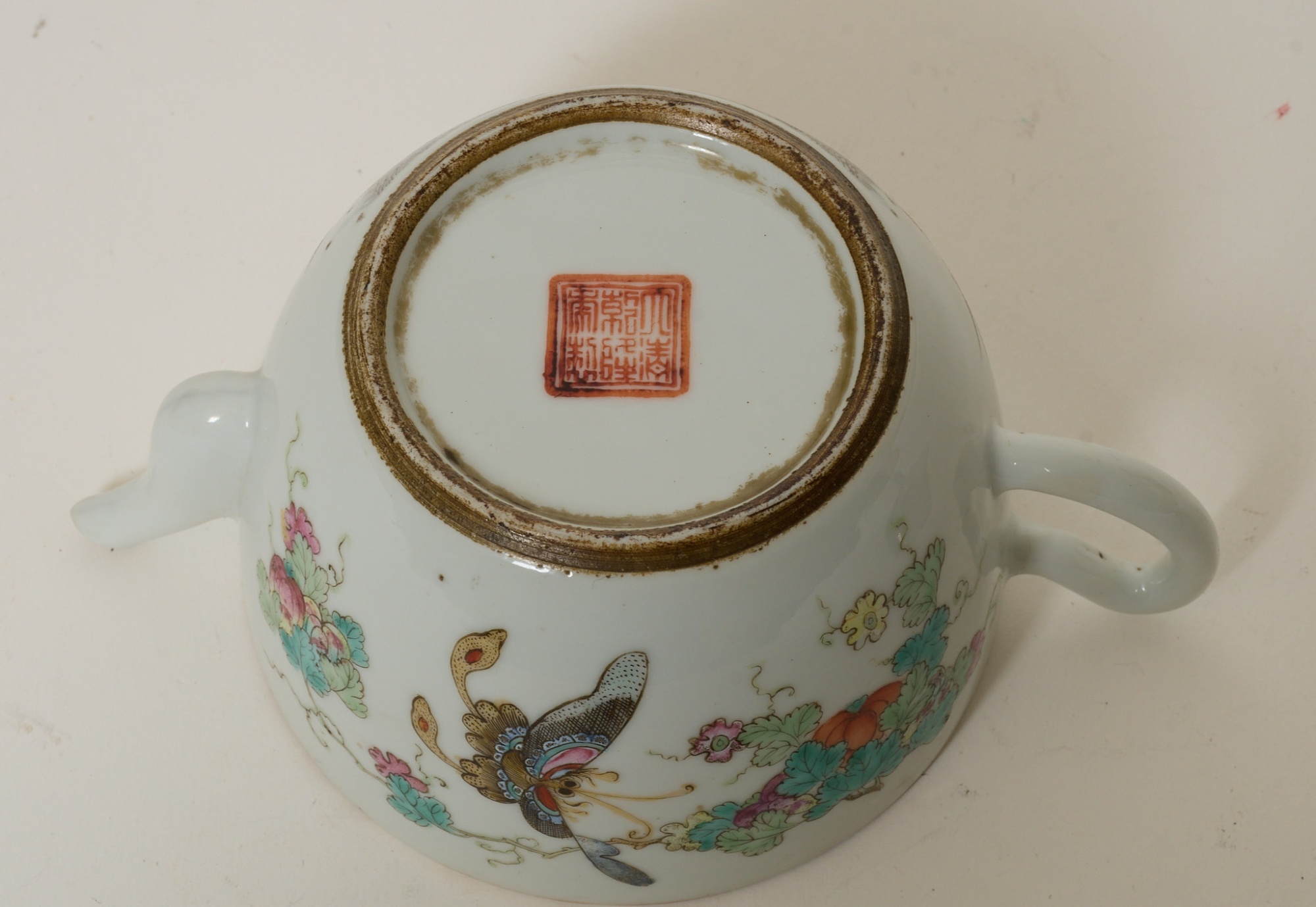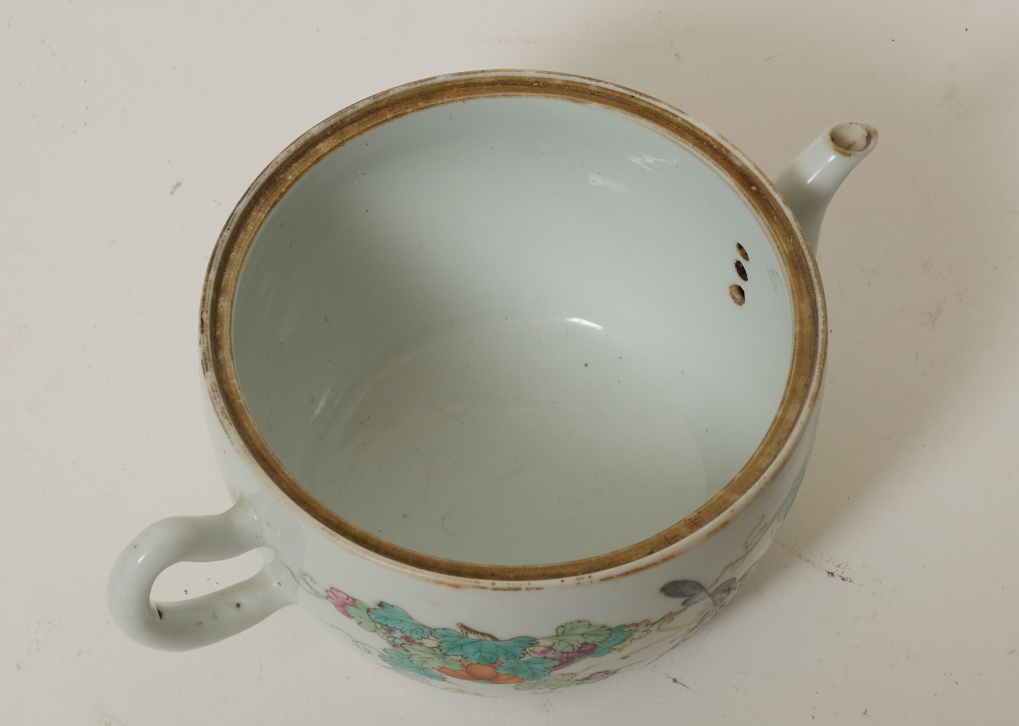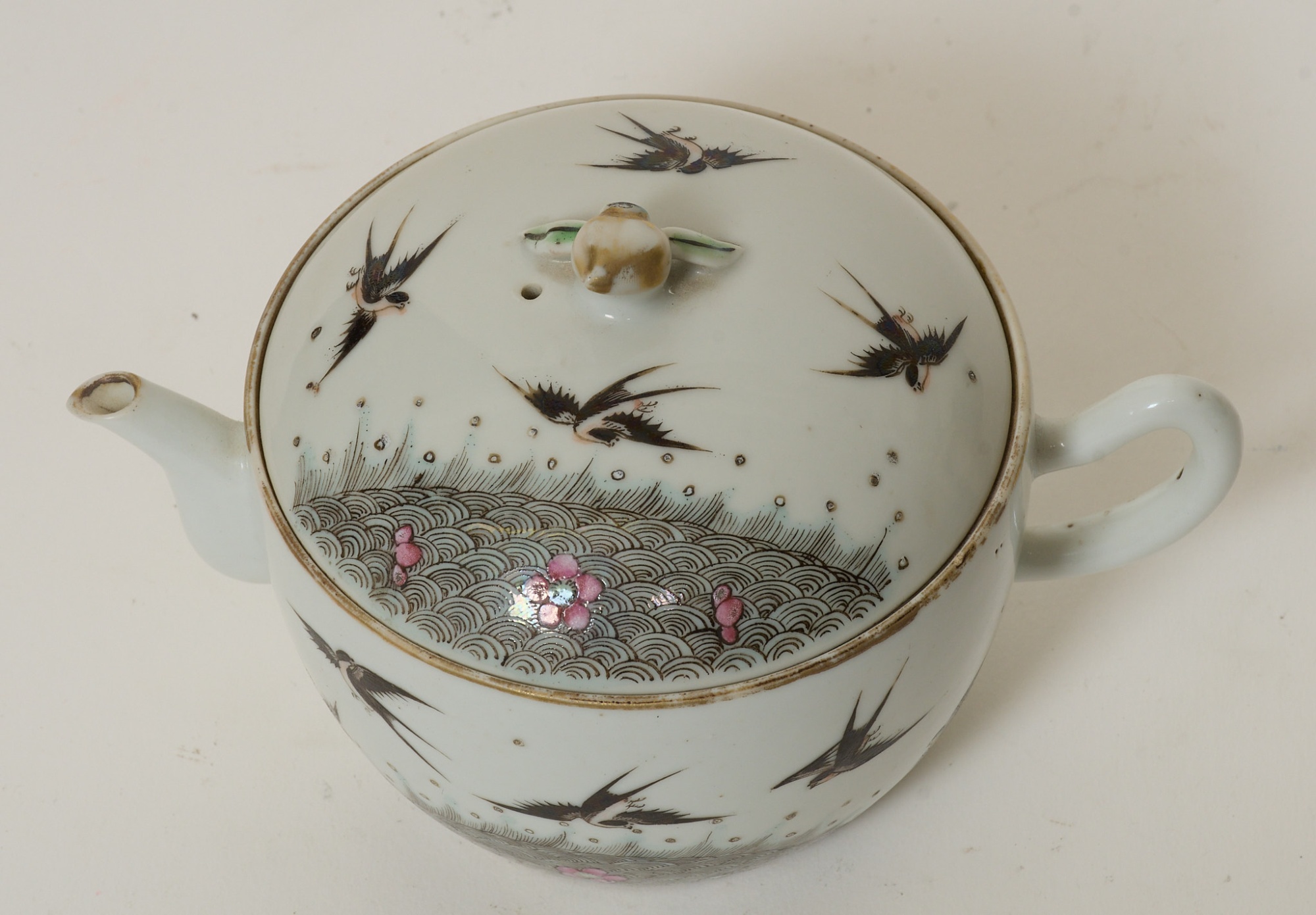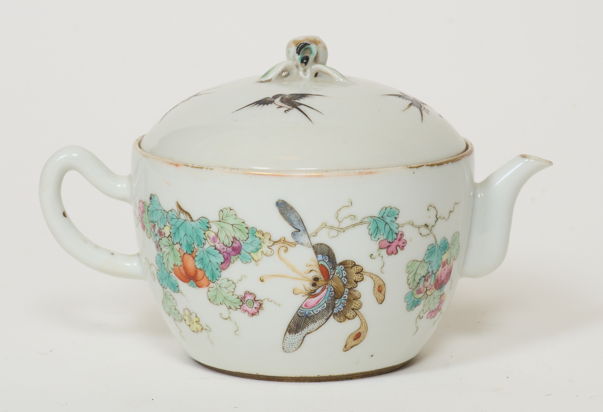 Polykrom dekor, av fåglar och växtlighet, bär qianlong-märke med 6 karaktärer, höjd 11 cm, hårspricka, för övrigt smärre bruksslitage.