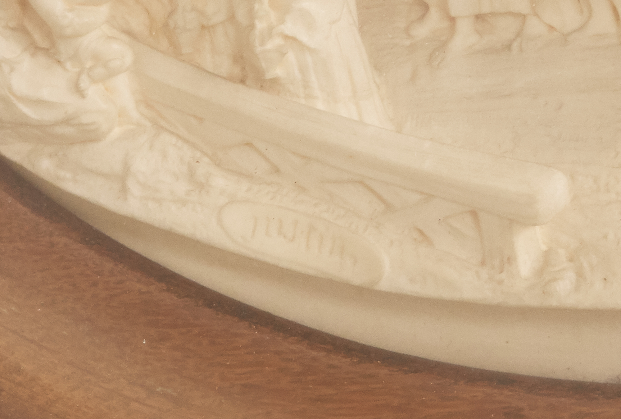Figurscen med bl.a. riddare m.m. signerad i gods, rammått 40 x 51 cm.