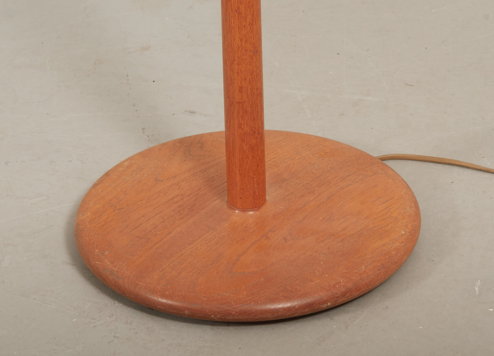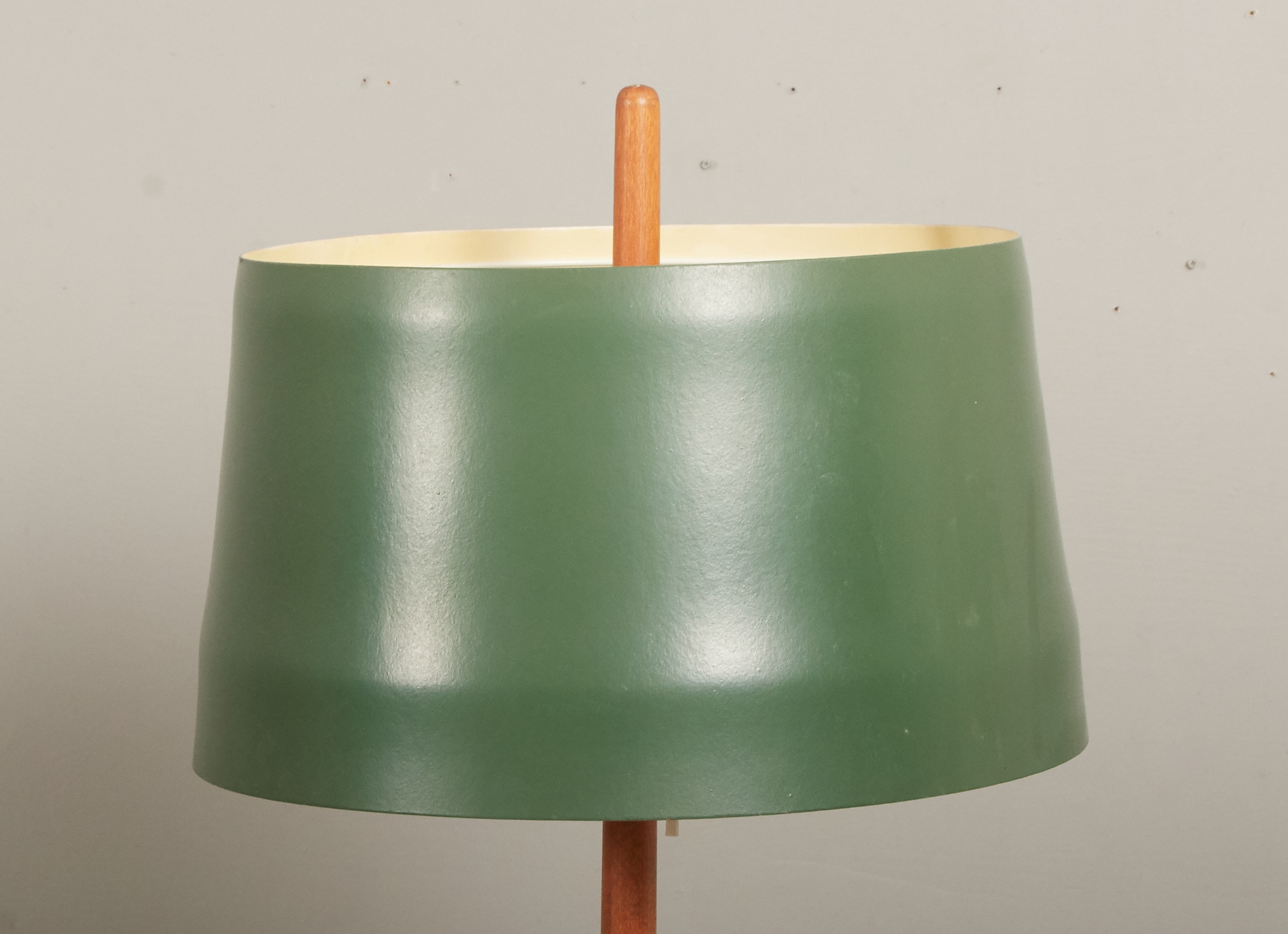 Teak med plåtskärm, två ljuspunkter, höjd ca 156 cm. Ej funktionstestad.