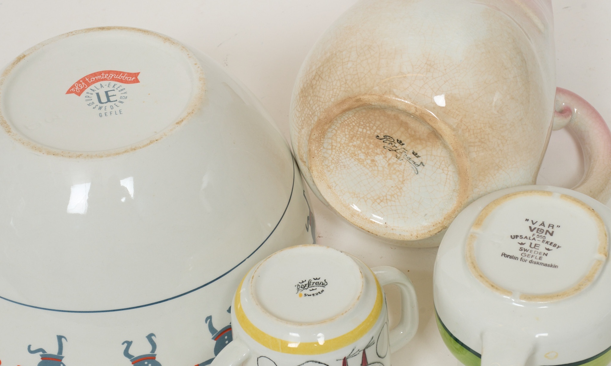 4 delar, kanna "Vår" Upsala Ekeby, kopp (pip), skål "Hej tomtegubbar" Upsala Ekeby samt griskanna Rörstrand. Högsta höjd 22 cm.