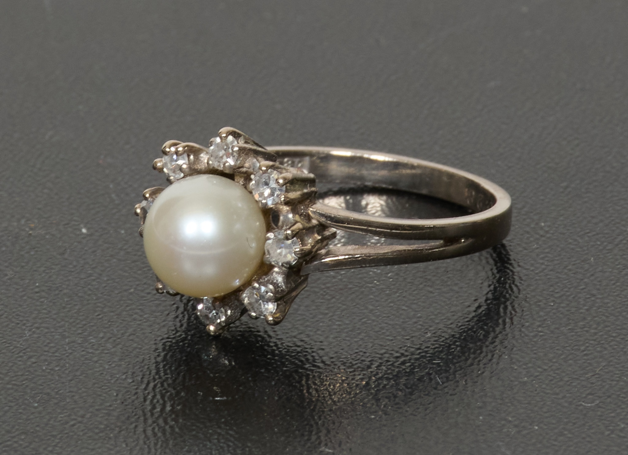 Med odlad pärla, samt 8 st mindre diamanter på tot. 0,28 karat enl. gravyr, strl. 18, tot. vikt 4,8 gram, gott skick
